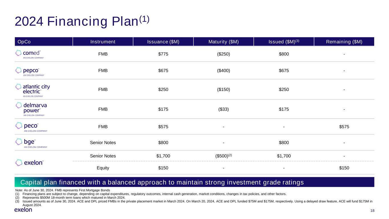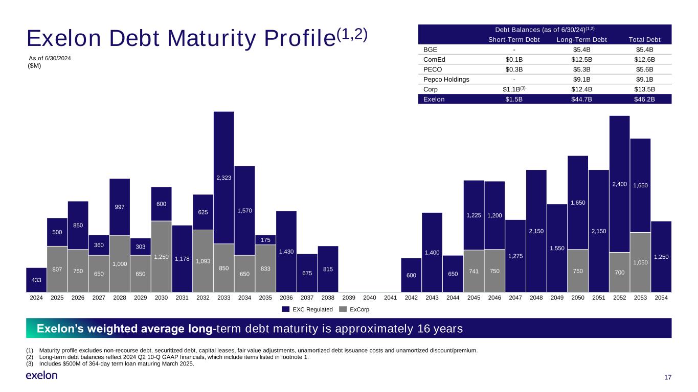 爱克斯龙债务到期情况简介(1,2)债务余额(截至6/30/24)(1,2)短债-长期债务总债务BGE-$ 5.4B $ 5.4B COM Ed $ 0.1B $ 12.5B $ 12.6B PECO $ 0.3B $ 5.3B $ 5.6B 波托马克-$ 9.1B $ 9.1B Corp $ 1.1B(3)$ 12.4B $ 13.5B 爱克斯龙 $ 1.5B $ 44.7B $ 46.2B 4338077506501,0006501,0006501,2501,1781,0938506508331,4306758156001,4006507417501,2752,1501,5507502,1507501,0501,2505008503609973036006252,3231,570175120412042204320442045204620472048204920502051205220532054(1)到期情况不包括无追索权债务、证券化债务、资本租赁、公允价值调整、未摊销的债务发行成本和未摊销的折/溢价。(2)长期债务余额反映了2024年Q2 10-Q GAAP财务,其中包括脚注1中列出的项目。(3)包括2025年3月到期的5亿美元364天期定期贷款。截至2024年6月30日,爱克斯龙的加权平均长期债务期限约为16年(百万美元)EXC受监管ExCorp 17
