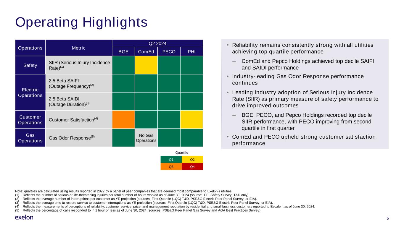 4个关键信息财务和运营卓越监管和其他发展长期展望• 2024年第二季度GAAP每股收益为0.45美元,2023年第二季度为每股0.34美元• 2024年第二季度调整后的运营收益*为每股0.47美元,而2023年第二季度为每股0.41美元•继续在高运营水平上执行,所有公用事业公司都实现了前四分之一的可靠性表现•~90%的2024年预期债务融资完成(1)2024年收益指引,基于预期的平均流通股为10.03亿股。(2)基于2023年2月在2022年第四季度财报电话会议上披露的爱克斯龙 2023年调整后运营每股收益*指导范围为2.30美元至2.42美元的中点,2022年第四季度财报电话会议披露。• COEd重新提交的多年综合电网计划步入正轨,许多干预者和工作人员职位继续支持电网计划的合规性和投资需求• PECO电力和燃气分配费率案件按照时间表进行,费率自2025年1月1日起生效• Pepco MD完成了其配电费率案件• Pepco直流配电费率案件预计将于第四季度完成•重申2024年调整后的营业利润*为每股2.40美元至2.50美元(1)•在2024-2027年期间投资约34.5B美元的资本支出,导致预期利率基数增长~7.5% •总股本1.6B美元以支持资本投资计划,其中~1.5亿美元将在2024年发行,余额按比例发行2025-2027年•重申2023-2027年调整后营业利润*复合年增长率为5-7 %(2),预期处于中点或更好•重申预计股息支付率约为60%,导致股息增长符合到2027年的目标5-7 %营业每股收益*复合年增长率