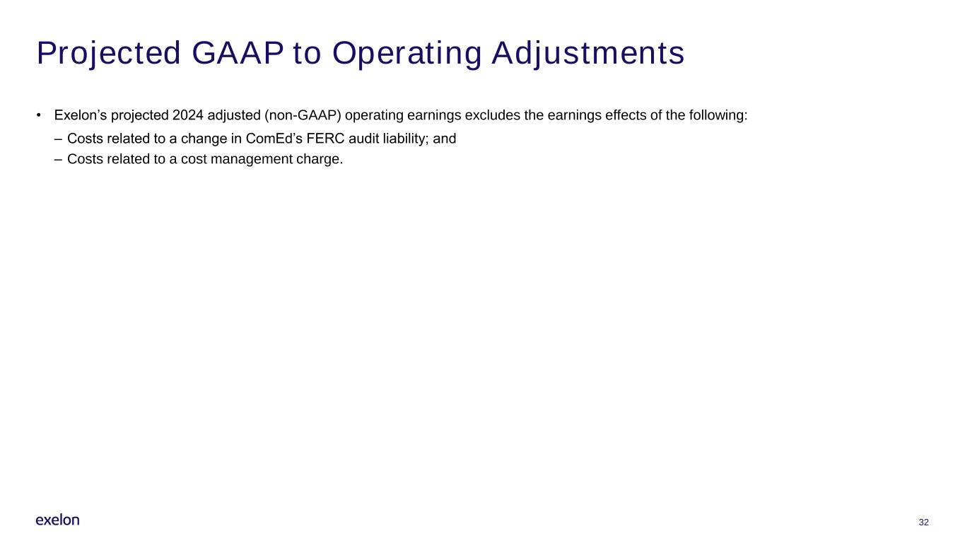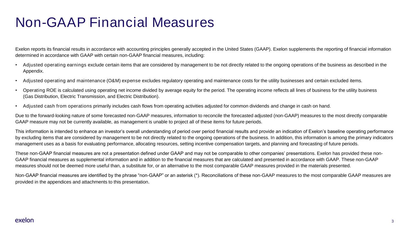 3 Non-GAAP财务指标爱克斯龙根据美国公认会计原则(GAAP)报告其财务业绩。爱克斯龙通过某些非公认会计准则财务指标来补充根据公认会计原则确定的财务信息的报告,包括:•调整后的营业利润不包括管理层认为与附录中所述的业务的持续运营没有直接关系的某些项目。•调整后的运营和维护(O & M)费用不包括公用事业业务的监管运营和维护成本以及某些排除项目。•经营ROE采用营业净收入除以当期平均权益计算得出。营业收入反映公用事业业务的所有业务条线(配气、输电、配电)。•调整后的经营活动现金主要包括经共同股息和手头现金变化调整后的经营活动现金流量。由于一些预测的非公认会计原则措施具有前瞻性,目前可能无法获得将预测的调整后(非公认会计原则)措施与最直接可比的公认会计原则措施进行核对的信息,因为管理层无法预测未来期间的所有这些项目。此信息旨在通过排除管理层认为与业务的持续运营没有直接关系的项目,增强投资者对期间财务业绩的整体理解,并提供对爱克斯龙基准经营业绩的指示。此外,这些信息是管理层用作评估绩效、分配资源、设定激励薪酬目标以及规划和预测未来期间的基础的主要指标之一。这些非GAAP财务指标不是根据GAAP定义的列报方式,可能无法与其他公司的列报方式进行比较。爱克斯龙提供了这些非公认会计原则财务指标作为补充信息,以及根据公认会计原则计算和列报的财务指标之外的信息。这些非GAAP衡量标准不应被视为比材料中提供的最具可比性的GAAP衡量标准更有用、替代或替代。非美国通用会计准则财务指标由“非美国通用会计准则”或星号(*)标识。这些非GAAP衡量标准与最具可比性的GAAP衡量标准的对账情况在本演示文稿的附录和附件中提供。