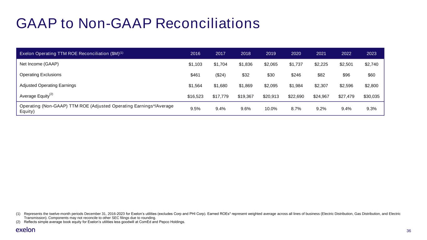 36 GAAP与Non-GAAP对账(1)代表2016-2023年12月31日对于爱克斯龙公用事业(不包括Corp和PHI Corp)的十二个月期间。赚取的ROE *代表所有业务线(配电、配气和输电)的加权平均数。由于四舍五入,组件可能无法与SEC的其他文件进行核对。(2)反映了爱克斯龙公用事业部门的简单平均账面权益减去COMED和波托马克的商誉。爱克斯龙营业TERM0TTM ROE对账(百万美元)(1)20162017201820192020202120222023净收入(GAAP)1,103美元1,704美元1,836美元2,065美元1,737美元2,225美元2,501美元2,740美元经营除外责任461美元(24美元)32美元30美元246美元82美元96美元60调整后营业利润1,564美元1,680美元1,869美元2,095美元1,984美元2,307美元2,596美元2,800美元平均权益(2)16,523美元17,779美元19,367美元20,913美元22,690美元24,967美元27,479美元30,035美元营业(Non-GAAP)TERM0 TTM TTM ROE(调整后营业利润*/平均权益)9.5% 9.4% 9.6%