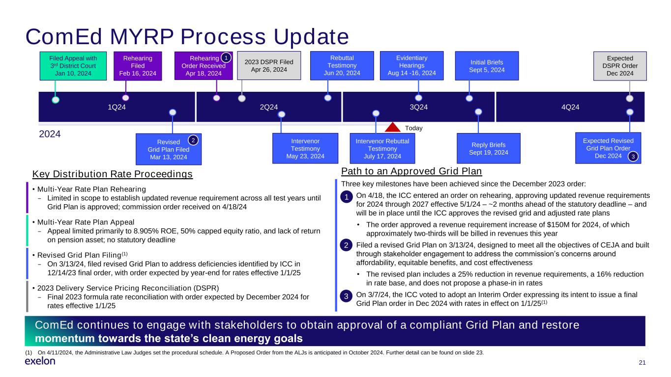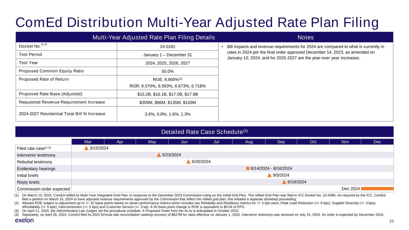 23 comEd发行多年期调整费率计划备案多年期调整费率计划备案详情Notes Docket No。(1,4)24-0181 •根据2023年12月14日批准并于2024年1月10日修订的最终订单,将2024年的账单影响和收入要求与2024年目前的费率进行比较,而2025-2027年则是同比增长。测试期1月1日– 12月31日测试年度2024、2025、2026、2027年拟议普通股权益比率50.0%拟议回报率ROE:8.905%(2)ROR:6.570%、6.593%、6.673%、6.7 18%拟议利率基数(调整后)$ 15.2B、$ 16.1B、$ 17.0B、$ 17.9B要求收入要求增加$ 3.09亿、$ 9600万、$ 1.35亿、$ 1.43亿2024-2027年住宅总票据%增加3.6%、0.8%、1.6%、1.3%详细利率案例时间表(3)Mar Apr May Jul Jug Aug Sep Oct Nov Dec 3/15/2024证据听证会9/5/2024初步简报6/20/20249/19/2024回复简报Dec 2024ComEd重新提交了其多年综合电网计划,以回应2023年12月委员会对初始电网计划的裁决。重新备案的网格计划在ICC案卷22-0486号备案。根据ICC的要求,COMED于2024年3月15日提交了一份请愿书,要求调整委员会批准的反映重新提交的电网计划的收入要求;这启动了一个单独的案卷程序。(2)允许根据七个绩效指标调整ROE,最高可达+/-32个基点,其中包括两个可靠性和弹性指标,每个指标为+/-5个基点,峰值负载减少(+/-6个基点),供应商多样性(+/-3个基点),可负担性(+/-5个基点),互连(+/-5个基点)和客户服务(+/-3个基点)。ROE变化50个基点相当于每股收益0.04美元。(三)2024年4月11日行政法法官定案程序日程表。ALJ的拟议订单预计将于2024年10月发布。(4)另外,2024年4月26日,COMED提交了2023年公式利率对账,寻求为2025年1月1日生效的利率追回6.27亿美元。干预者证词于2024年7月15日收到。预计将于2024年12月获得订单。