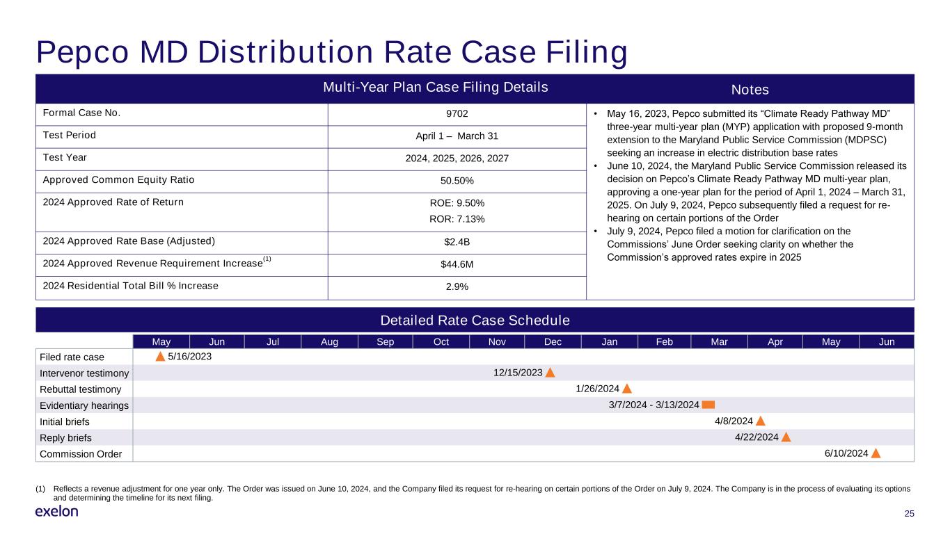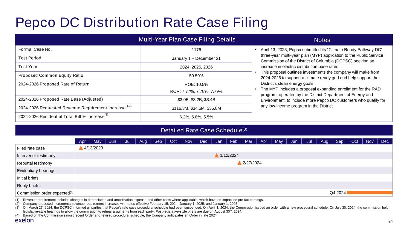 24 Pepco DC分配率案件立案Apr May Jul Aug Sep Oct Nov Dec JanFeb MarApr Apr May Jul Aug Sep Oct Nov Oct Nov Dec Nov 13/2023 Commission Order Expected(4)1/12/2024 Intervenor证词2/27/2024 Q4 2024 Multi-Year Plan Case Filing Details Notes Formal Case No. 1176 • April 13,2023,Pepco向哥伦比亚特区公共服务委员会(DCPSC)提交了“Climate Ready Pathway DC”三年多年计划(MYP)申请,寻求提高配电基准费率•该提案概述了该公司将在2024-2026年期间进行的投资,以支持气候就绪电网并帮助支持该地区的清洁能源目标• MYP包括一项扩大RAD计划招生人数的提案,该计划由地区能源与环境部运营,将更多符合地区测试期内任何低收入项目资格的Pepco DC客户包括在内1月1日– 12月31日测试年2024年、2025年、2026年拟议普通股权益比率50.50% 2024-2026年拟议回报率ROE:10.5% ROR:7.77%、7.78%、7.79% 2024-2026年拟议利率基数(调整后)$ 3.0b、$ 3.2B、$ 3.4b 2024-2026年要求的收入要求增加(1,2)$ 1.163亿、$ 3450万、$ 3580万2024-2026年住宅总票据%增加(2)6.2%、5.8%、5.5%详细费率案例表(3)(1)收入要求包括折旧和摊销费用以及适用的其他成本的变化,对税前收益没有影响。(2)公司提议增加收入要求,费率自2024年2月15日、2025年1月1日和2026年1月1日起生效。(3)2024年3月27日,DCPSC通知各方,Pepco的费率案件程序时间表已暂停。2024年4月1日,欧盟委员会发布了一项带有新程序时间表的命令。2024年7月30日,委员会举行了立法式听证会,允许委员会重新听取各方的论点。立法后风格的简报将于2024年8月30日到期。(4)根据监察委员会最近的命令和经修订的程序时间表,公司预计将于2024年底发出命令。