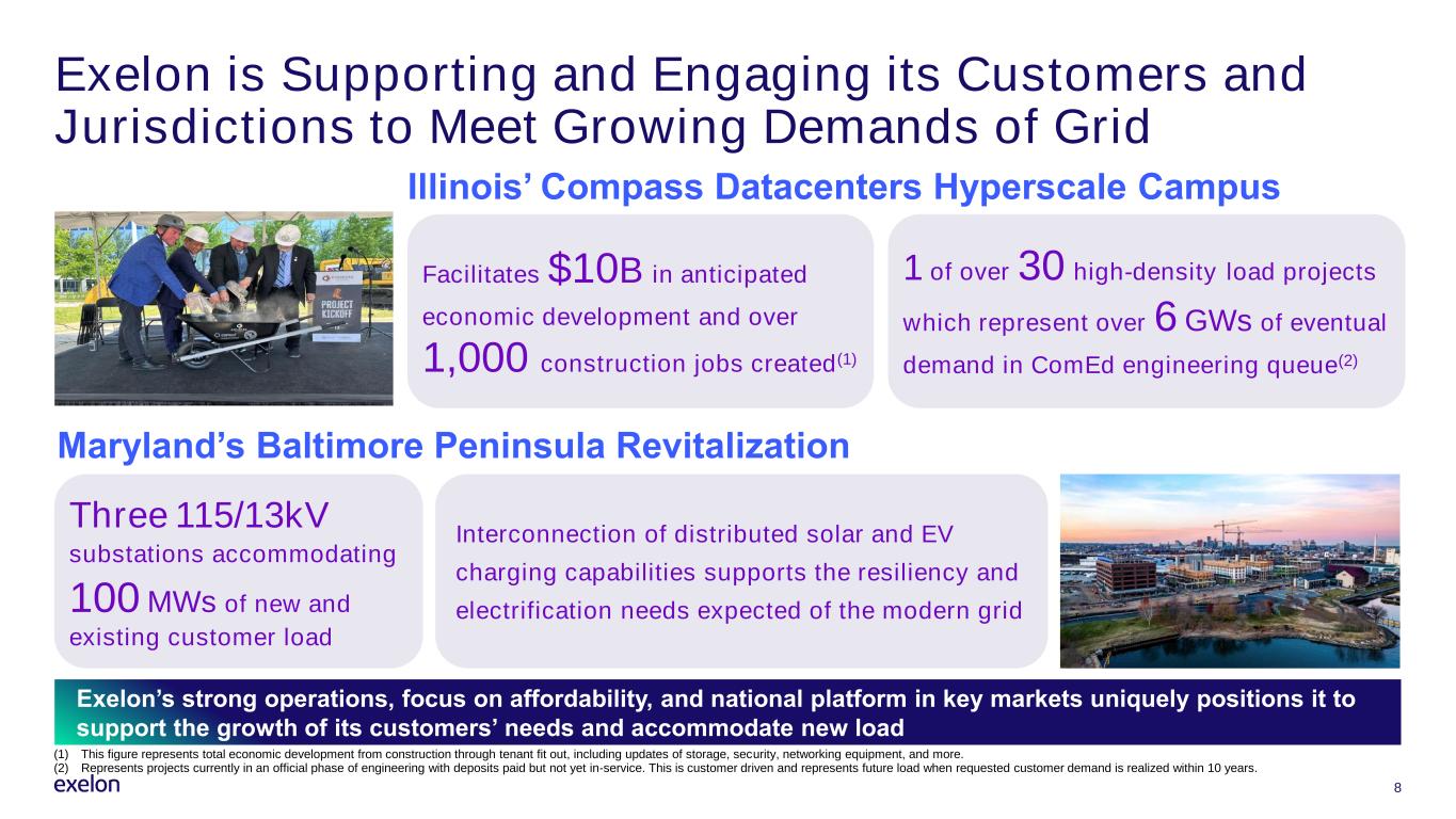 促进了$ 10B的预期经济发展和创造的超过1,000个建筑工作岗位(1)爱克斯龙正在支持并吸引其客户和司法管辖区,以满足不断增长的需求,由于Grid 爱克斯龙的强大运营,专注于负担得起,和关键市场的国家平台使其具有独特的地位,可以支持客户需求的增长并适应新的负载伊利诺伊州的Compass数据中心Hyperscale Campus 8马里兰州的巴尔的摩半岛振兴三座115/13kV变电站,可容纳100兆瓦的新客户和现有客户负载分布式太阳能和电动汽车充电能力的互联互通,支持超过30个高密度负载项目的现代电网1预期的弹性和电气化需求,这些项目代表了COMED工程队列中超过6GW的最终需求(2)(1)这个数字代表了从建设到租户装修的总经济发展,包括更新存储、安全、网络设备,以及更多。(2)代表目前处于正式工程阶段、已付定金但尚未投入使用的项目。这是客户驱动的,当要求的客户需求在10年内实现时,它代表了未来的负荷。