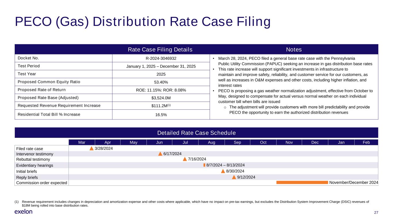 26 PECO(电动)配电率案例备案率案例备案详情备注案卷编号R-2024-3046931 • 2024年3月28日,PECO向宾夕法尼亚州公用事业委员会(PAPUC)提交了一项普通基费率案件,寻求提高配电基费率•此次费率提高将支持对基础设施的重大投资,以维护和改善我们客户的安全性、可靠性和客户服务,以及运维费用和其他成本的增加,包括更高的通货膨胀和利率• PECO正在提出一种风暴准备金账户机制,旨在将风暴成本差异递延到资产负债表中,以便在下一个基费率情况下收取/退还o它将确保客户只为实际的风暴成本付费,并使PECO能够收回其实际的风暴损害费用测试期,2025年1月1日– 12月31日,2025测试年2025年拟议普通股比53.40%拟议回报率ROE:10.95%:ROR:7.98%拟议利率基数(调整后)88.556亿美元请求收入要求增加3.993亿美元(1,2)住宅总票据%增加12.3%(3)详细利率案件时间表Mar Apr May Jul Aug Sep Oct Oct Nov Dec JanFeb反驳证词November/December 2024 Intervenor证词委员会命令预期答复简报6/17/2024初步简报7/16/20248/7/2024 – 8/13/2024证据听讯8/30/20243/28/20249/12/2024提案率案例(1)收入要求包括折旧和摊销费用以及适用的其他成本的变化,对税前收益没有影响,但不包括6400万美元的分销系统改进费用(DSIC)收入计入基本分销费率。(2)基准费率收入增加请求4.636亿美元,被2025年6430万美元的一次性信贷部分抵消,导致2025年净收入增加3.993亿美元。6430万美元的一次性信贷包括约4800万美元用于与新冠疫情相关的无法收回的增量费用和约1600万美元用于暗纤维收入。(3)住宅总账单按4.636亿美元要价计算增长14.1%,按3.993亿美元要价计算增长12.3%。