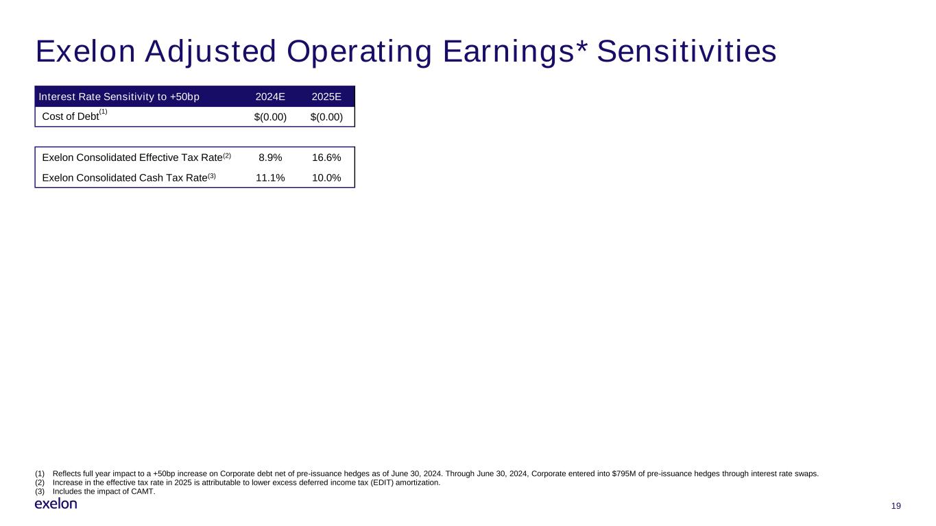 19 爱克斯龙调整后营业利润*敏感性利率对+ 50bp的敏感性2024e2025e债务成本(1)$(0.00)$(0.00)爱克斯龙合并有效税率(2)8.9% 16.6% 爱克斯龙合并现金税率(3)11.1% 10.0%(1)反映截至2024年6月30日公司债务扣除发行前对冲后增加+ 50bp的全年影响。截至2024年6月30日,Corporate通过利率互换进行了7.95亿美元的发行前对冲。(2)2025年有效税率增加归因于超额递延所得税(EDIT)摊销减少。(三)包括CAMT的影响。