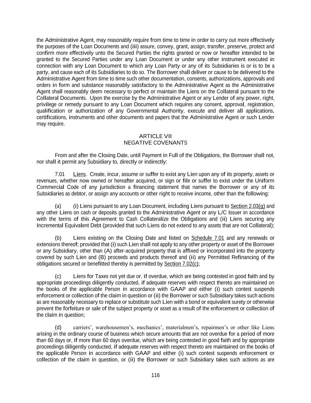 116行政代理人,可不时合理要求,以便更有效地执行贷款文件的目的,以及(iii)向有担保当事人保证、转让、授予、转让、转让、保全、保护和更有效地确认根据任何贷款文件或根据任何贷款方或其任何附属公司目前或将成为一方的任何贷款文件所签立的任何其他文书授予或现在或以后拟授予有担保当事人的权利,并促使其每一附属公司这样做。借款人应将行政代理人作为行政代理人为完善或维持担保物上的留置权而合理认为必要的其他形式和实质上令行政代理人合理满意的文件、同意书、授权书、批准书和命令不时交付或安排交付给行政代理人。在行政代理人或任何贷款人根据任何贷款文件行使任何权力、权利、特权或补救而需要任何政府当局的同意、批准、登记、资格或授权时,执行和交付行政代理人或该贷款人可能要求的所有申请、证明、文书和其他文件和文件。第七条《消极盟约》自结束日及结束日之后,直至全额清偿债务为止,借款人不得、也不得允许任何附属机构直接或间接:7.01留置权。对其任何财产、资产或收入(无论是现在拥有的还是以后获得的)设定、招致、承担或容许存在任何留置权,或根据任何司法管辖区的《统一商法典》签署或归档或容许存在融资报表,将借款人或其任何子公司列为债务人,或转让任何账户或其他收取收入的权利,但以下情况除外:(a)(i)根据任何贷款文件的留置权,包括根据第2.03(g)节的留置权,以及根据本协议条款授予行政代理人或任何信用证发行人以现金抵押债务的现金或存款的任何其他留置权,以及(ii)为任何增量等值债务提供担保的留置权(前提是此类留置权不延伸至任何非抵押资产);(b)在截止日期存在并列于附表7.01的留置权及其任何续期或延期;但(i)该留置权不适用于借款人或任何附属公司的任何其他财产或资产,(a)附加或并入该留置权所涵盖的财产的事后取得的财产及其(b)收益和产品,以及(ii)由此担保或受益的债务的任何许可再融资,均为第7.02(c)条所允许的;(c)对尚未到期或逾期未交的税款的留置权,这些税款正受到善意和通过勤勉进行的适当程序的争议,如果根据公认会计原则在适用的人的账簿上保留了与此相关的充分准备金,并且(i)此类争议暂停执行或收集相关索赔,或(ii)借款人或此类子公司采取合理必要的行动,以债券或同等担保人取代或替代此类留置权,或以其他方式阻止因执行或收集相关索赔而没收或出售标的财产或资产;(d)承运人、仓库管理员、机械师、材料师,在正常业务过程中产生的修理商或其他类似的留置权,以确保未逾期超过60天的金额,如果逾期超过60天,则出于善意并通过勤勉进行的适当程序对这些金额提出异议,前提是根据公认会计原则在适用的人的账簿上保留了与此相关的足够准备金,并且(i)此类争议暂停执行或收取相关索赔,或(ii)借款人或此类子公司采取以下行动