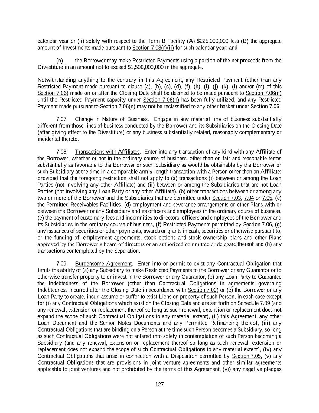 127日历年或(二)仅就B期贷款(a)225,000,000美元减(b)根据第7.03(r)(二)节为该历年进行的投资总额;(n)借款人可使用资产剥离净收益的一部分进行限制性付款,总额不超过1,500,000,000美元。尽管本协议另有相反规定,在截止日期或之后作出的任何受限制付款(根据本条第7.06条(a)、(b)、(c)、(d)、(f)、(h)、(i)、(j)、(k)、(l)和/或(m)项作出的任何受限制付款除外)须当作根据第7.06(n)条作出,直至根据第7.06(n)条作出的受限制付款能力已被充分利用,而根据第7.06(n)条作出的任何受限制付款不得根据第7.06条重新分类至任何其他篮子。7.07业务性质变更。从事与借款人及其附属公司于截止日(在实施剥离后)所进行的业务大有不同的任何重要业务或与之有实质关联、合理互补或附带关系的任何业务。7.08与关联公司的交易。与借款人的任何附属公司订立任何种类的交易,不论是否在日常业务过程中,除非以公平合理的条款,在与非关联公司的人进行的可比公平交易中,借款人或该子公司在当时可获得的对借款人或该子公司基本有利的条件;但上述限制不适用于(a)贷款方之间或相互之间的交易(i)(不涉及任何其他关联公司)和(ii)非贷款方的子公司之间或相互之间的交易(不涉及任何贷款方或任何其他关联公司),(b)任何两名或两名以上借款人与附属公司之间或之间根据第7.03、7.04或7.05条准许的其他交易,(c)准许的应收款项设施,(d)在正常业务过程中与借款人或任何附属公司及其高级职员和雇员之间的雇用和遣散安排或其他计划,(e)在正常业务过程中向借款人及其附属公司的董事、高级职员和雇员支付惯常费用和赔偿,(f)第7.06条准许的限制性付款,(g)任何证券发行或其他付款,以现金、证券或其他方式根据借款人董事会或其授权委员会或受授权人批准的雇佣协议、股票期权和股票所有权计划以及其他计划或为其提供资金的方式授予或赠款,以及(h)分立所设想的任何交易。7.09繁重的协议。订立或准许存在任何限制(a)任何附属公司向借款人或任何担保人作出受限制付款或以其他方式向借款人或任何担保人转移财产或对其进行投资的能力的合同义务,(b)任何贷款方为借款人的债务提供担保(根据第7.02条规定截止日期后发生的债务的协议中的合同义务除外)或(c)借款人或任何贷款方对该人的财产设定、招致、承担或容忍存在留置权的能力,在每种情况下,除(i)在截止日期存在并列于附表7.09的任何合同义务(以及任何该等的续期、延期或替换,只要该等续期、延期或替换不会在任何重大程度上扩大该等合同义务的范围)外,(ii)本协议、任何其他贷款文件和优先票据文件及其任何允许的再融资,(iii)在该人成为附属公司时对该人具有约束力的任何合同义务,只要该等合同义务并非仅在考虑该人成为附属公司时订立(以及任何续期、延期或替换,只要该等续期、延期或替换不会在任何重大程度上扩大该等合同义务的范围),(iv)与第7.05条允许的处置有关的任何合同义务,(v)属于合资协议和适用于合资公司的其他类似协议中的规定且不受本协议条款禁止的任何合同义务,(vi)任何负质押