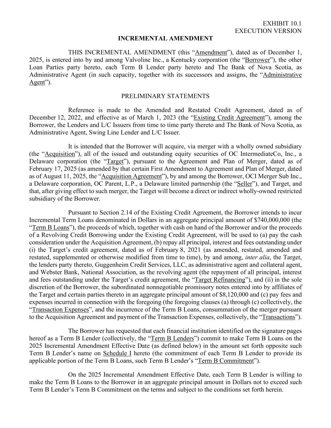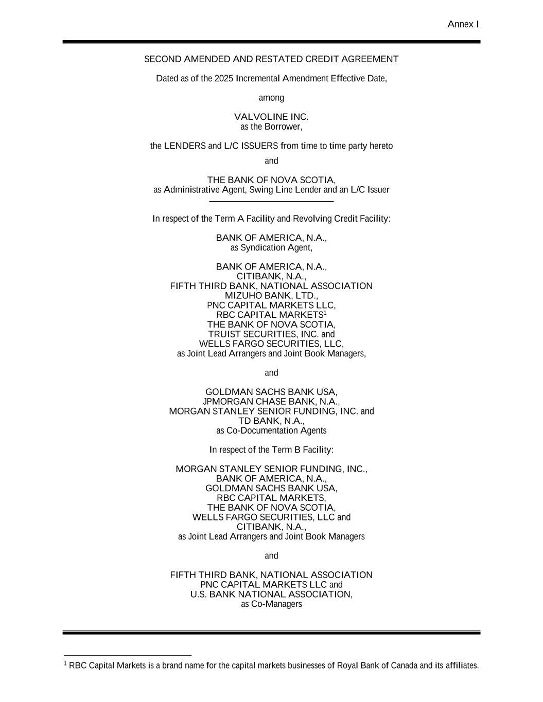 附件一第二份经修订和重述的信贷协议,日期为2025年增量修订生效日期,在作为借款人的VALVOLINE INC.、不时作为协议一方的贷款人和信用证发行人以及作为行政代理人的新斯科舍银行和就期限融资和循环信贷融资的信用证发行人之间:Bank of AMERICA,N.A.作为银团代理,Bank of AMERICA,N.A.,CITIBANK,N.A.,Fifth Third Bank,National Association MIZUHO BANK,LTD.,PNC资本市场INC.和Wells FARGO SECURITIES,LLC作为联席牵头安排人和联席账簿管理人,GOLDMAN SACHS BANK USA、JPMorgan CHASE BANK,N.A.、MORGAN STANLEY SENIOR Funding,INC.和TD BANK,N.A.作为B期限融资的联合文件代理:MORGAN STANLEY SENIOR Funding,INC.、BANK of AMERICA,N.A.、GOLDMAN SACHS BANK USA、RBC Capital Markets、BANK of NOVA Scotia、WELLS FARGO SECURITIES,LLC和CITIBANK,N.A.作为联席牵头安排人作为联合管理人1加拿大皇家银行资本市场是加拿大皇家银行及其附属机构资本市场业务的品牌名称。