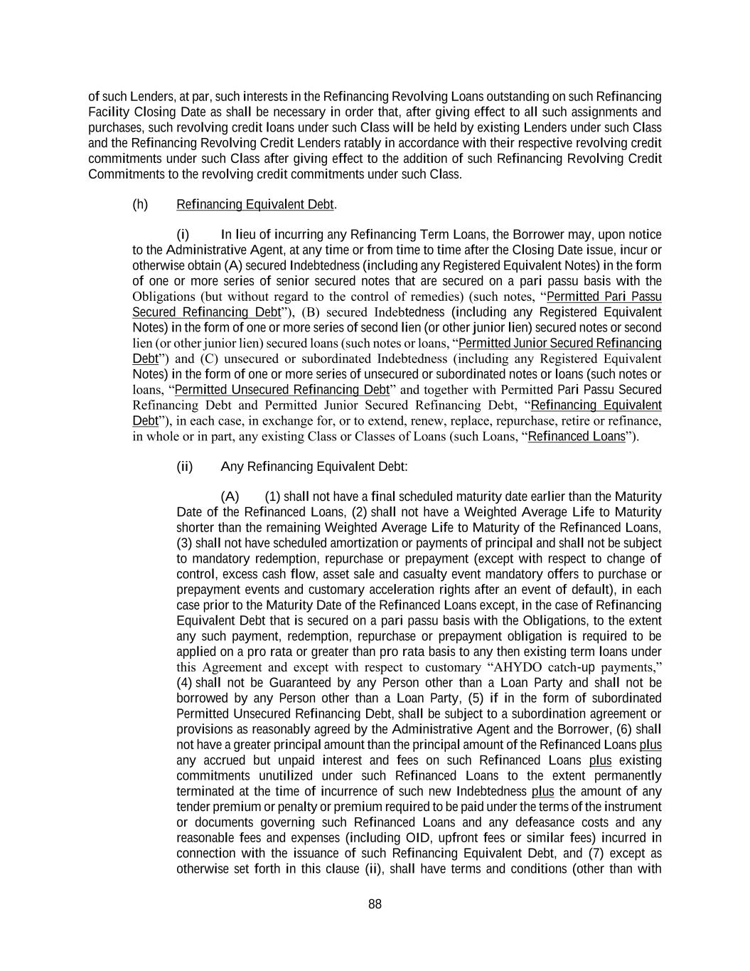 88名该等贷款人按面值计算于该等再融资融资融资截止日期未偿还的再融资循环贷款中的必要权益,以便在所有该等转让和购买生效后,该等类别下的该等循环信用贷款将由该等类别下的现有贷款人和再融资循环信贷贷款人在该类别下的循环信贷承诺生效后,根据其各自在该类别下的循环信贷承诺按比例持有。(h)等值债务再融资。(i)代替产生任何再融资定期贷款,借款人可在向行政代理人发出通知后,在截止日期发行后的任何时间或不时产生或以其他方式获得(a)以一种或多种系列优先有担保票据形式的有担保债务(包括任何已登记的等值票据),这些票据与债务在同等基础上(但不考虑补救措施的控制)(此类票据,“许可的同等权利有担保再融资债务”),(b)以一个或多个系列的第二留置权(或其他初级留置权)担保票据或第二留置权(或其他初级留置权)担保贷款(该等票据或贷款,“许可的初级有担保再融资债务”)和(c)以一个或多个系列的无担保或次级票据或贷款(该等票据或贷款,“许可的无担保再融资债务”,连同许可的Pari Passu有担保再融资债务和许可的初级有担保再融资债务,“再融资等额债务”)形式的有担保债务(包括任何已登记的等额票据),在每种情况下,作为交换,或延长、续期、替换、回购、退休或再融资,全部或部分现有的任何一类或多类贷款(此类贷款,“再融资贷款”)。(ii)任何再融资等值债务:(a)(1)不得有早于再融资贷款到期日的最终预定到期日,(2)不得有短于再融资贷款的剩余加权平均到期日的加权平均到期日,(3)不得有预定的摊销或本金支付,不得被强制赎回、回购或提前还款(控制权变更、超额现金流、资产出售和伤亡事件强制要约购买或提前还款事件以及违约事件后的惯常加速权利),在每种情况下,在再融资贷款到期日之前,但在以与债务同等基础作担保的再融资等值债务的情况下,任何此类付款、赎回、回购或提前还款义务必须按比例或高于比例适用于本协议下的任何当时存在的定期贷款,并且与惯常的“AHYDO追缴付款”除外,(4)不得由贷款方以外的任何人提供担保,也不得由贷款方以外的任何人借入,(5)如以次级许可无担保再融资债务的形式,则须遵守行政代理人与借款人合理约定的从属协议或规定,(6)的本金额不得高于再融资贷款的本金额加上该等再融资贷款的任何应计但未支付的利息及费用加上该等再融资贷款项下未动用的现有承付款(以在发生该等新债项时永久终止为限)加上根据管辖该等再融资贷款的文书或文件的条款规定须支付的任何投标溢价或罚款或溢价的金额以及任何撤销费用和任何合理的费用及开支(包括OID,预付费用或类似费用)就发行该等再融资等额债项而招致,及(7)除本条第(ii)款另有规定外,须有条款及条件(除与