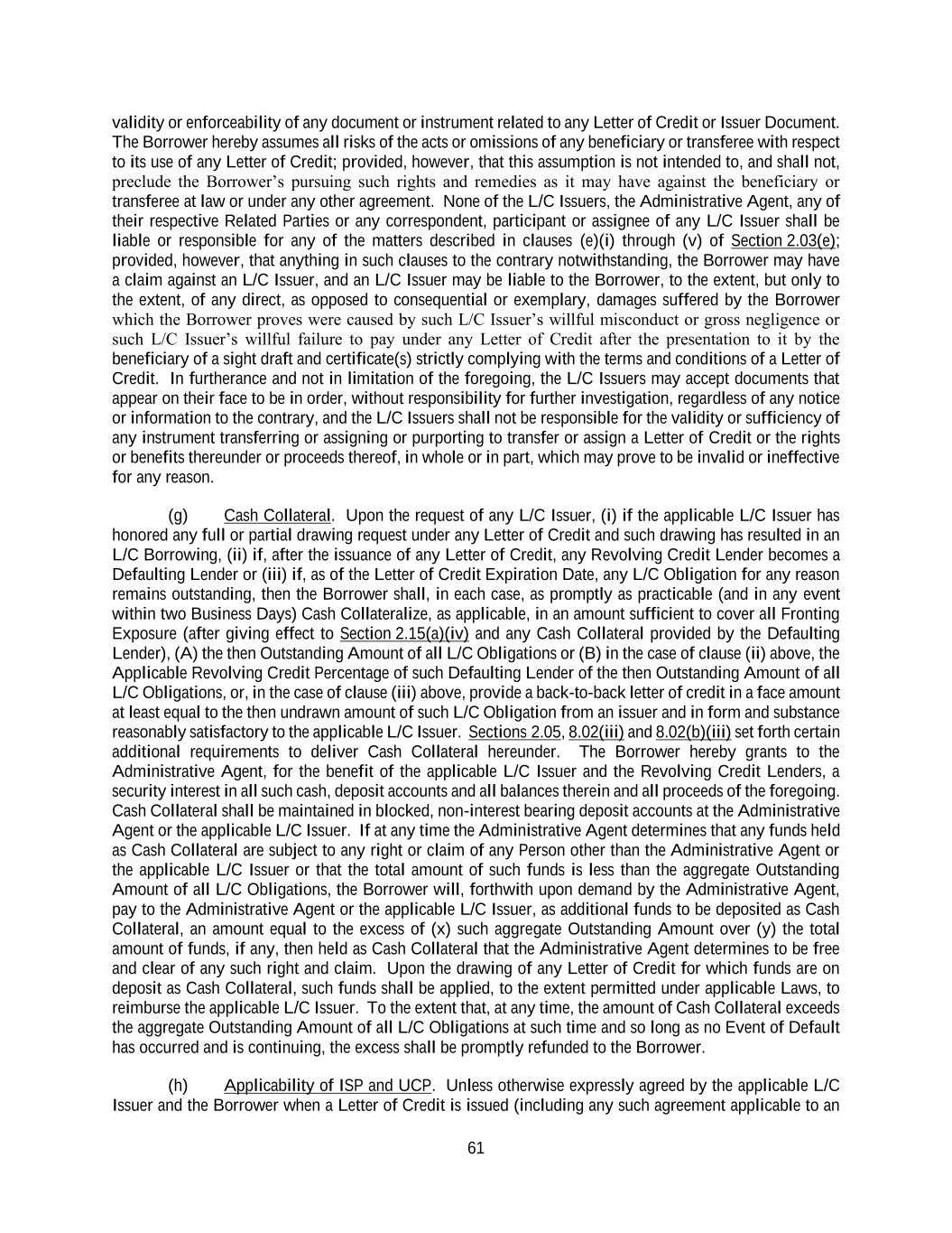 61与任何信用证或开证人单证有关的任何单证或票据的有效性或可执行性。借款人特此承担任何受益人或受让人在其使用任何信用证方面的作为或不作为的所有风险;但前提是,这一假设无意也不应排除借款人在法律上或根据任何其他协议对受益人或受让人追求其可能拥有的权利和补救措施。信用证发行人、行政代理人、其各自的任何关联方或任何信用证发行人的任何代理人、参与人或受让人均不得对第2.03(e)节(e)至(v)条所述的任何事项承担或负责;但条件是,尽管该等条款中有任何相反的规定,借款人可能对信用证发行人提出索赔,而信用证发行人可能对借款人承担责任,但仅限于任何直接的,而不是后果性的或示范性的,借款人证明的借款人遭受的损害是由于该信用证发行人的故意不当行为或重大过失或该信用证发行人在严格遵守信用证条款和条件的即期汇票和凭证的受益人向其出示后故意不按任何信用证付款而造成的。为促进而非限于前述,信用证发行人可以接受表面上看起来井然有序的单据,不承担进一步调查的责任,而不论任何相反的通知或信息,并且信用证发行人不对任何转让或转让或意图转让或转让信用证或其项下的权利或利益或其收益的全部或部分的任何票据的有效性或充分性负责,该票据可能因任何原因被证明无效或无效。(g)现金抵押品。应任何信用证发行人的要求,(i)如果适用的信用证发行人已根据任何信用证履行任何全额或部分提款请求,而该提款已导致信用证借款,(ii)如果在任何信用证签发后,任何循环信贷贷款人成为违约贷款人,或(iii)如果在信用证到期日时,任何信用证债务因任何原因仍未清偿,则借款人应在每种情况下,在切实可行的范围内尽快(无论如何在两个营业日内)酌情以现金作抵押,金额足以覆盖所有前端风险敞口(在实施第2.15(a)(iv)条和违约贷款人提供的任何现金抵押品之后),(a)所有信用证债务的当时未偿金额,或(b)在上述第(ii)条的情况下,该违约贷款人在所有信用证债务的当时未偿金额中的适用循环信贷百分比,或在上述第(iii)条的情况下,提供背靠背信用证,其票面金额至少等于当时未从开证人处提取的此种信用证债务的金额,且其形式和实质令适用的信用证开证人合理满意。第2.05、8.02(iii)和8.02(b)(iii)节规定了根据本协议交付现金抵押品的某些额外要求。借款人特此为适用的信用证发行人和循环信贷贷款人的利益,向行政代理人授予所有该等现金、存款账户及其所有余额和上述所有收益的担保权益。现金担保物应当在行政代理人或者适用的信用证开证人处被查封的、无息的存款账户中保持。如行政代理人在任何时候确定作为现金抵押品而持有的任何资金受制于行政代理人或适用的信用证发行人以外的任何人的任何权利或债权,或该等资金总额低于所有信用证债务的未偿总额,则借款人应行政代理人的要求,随即向行政代理人或适用的信用证发行人支付作为现金抵押品而存入的额外资金,等于(x)此种未偿总额超过(y)资金总额(如果有的话)的金额,然后作为现金抵押品持有,行政代理人认为该金额是自由的,没有任何此类权利和索赔。在提取资金作为现金抵押的任何信用证时,应在适用法律允许的范围内使用这些资金偿还适用的信用证发行人。凡在任何时候,现金抵押金额超过该时间所有信用证债务的未偿总额,且只要未发生违约事件且仍在继续, 超出部分应及时退还借款人。(h)ISP和UCP的适用性。除非在签发信用证时适用的信用证发行人和借款人另有明确约定(包括适用于