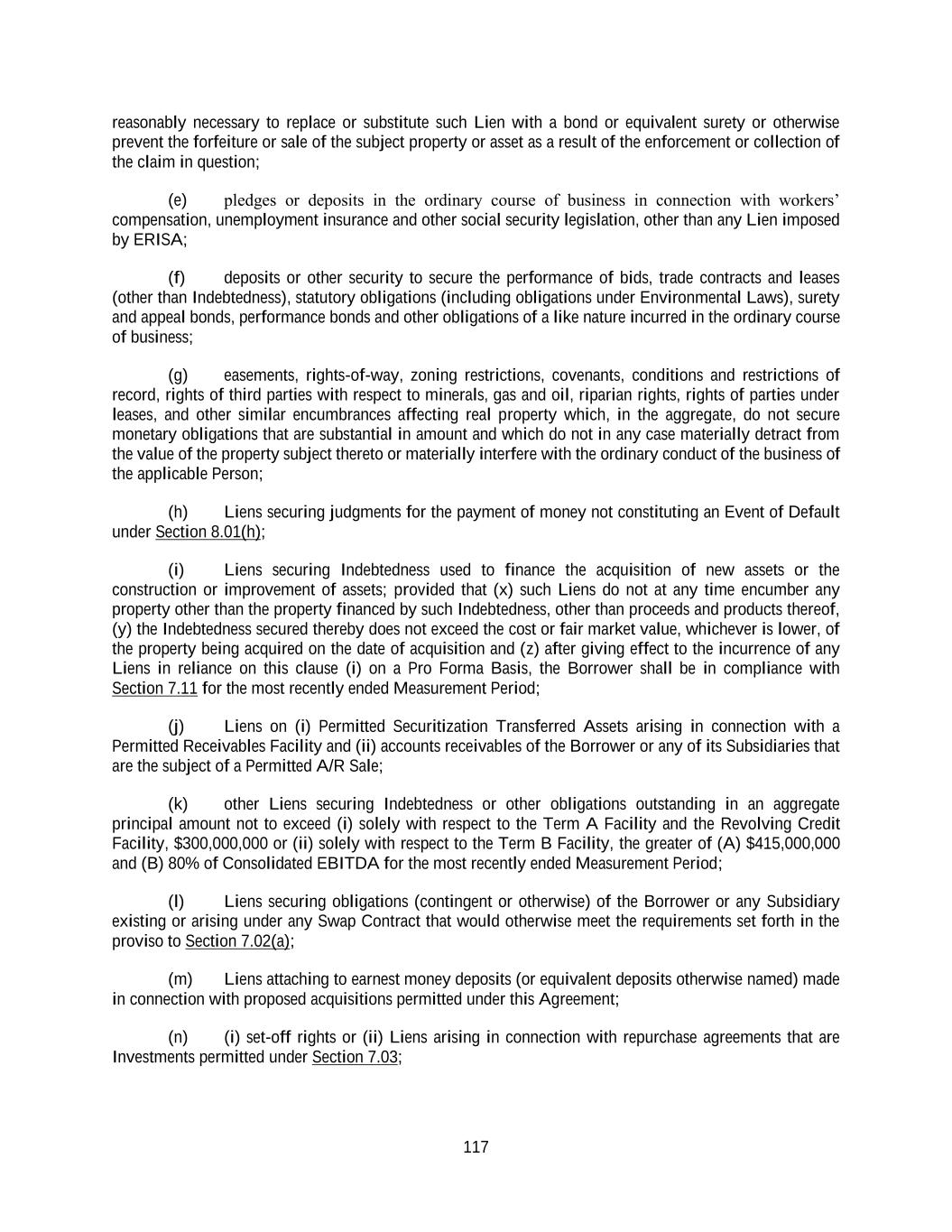 117为以债券或同等担保人取代或替代此类留置权或以其他方式防止因有关索赔的强制执行或收取而没收或出售标的财产或资产而有合理必要;(e)正常经营过程中与工人赔偿、失业保险和其他社会保障立法有关的质押或存款,但ERISA施加的任何留置权除外;(f)为保证投标、贸易合同和租赁(债务除外)、法定义务(包括环境法规定的义务)、担保和上诉债券的履行而提供的存款或其他担保,在正常经营过程中发生的履约保证金和其他类似性质的义务;(g)地役权、通行权、分区限制、契约、条件和记录限制、第三方对矿产、天然气和石油的权利、河岸权、租赁当事人的权利以及其他影响不动产的类似产权负担,这些合计,不担保数额巨大且在任何情况下都不会对受其约束的财产的价值造成重大减损或对适用人的正常业务进行重大干扰的货币债务;(h)为支付不构成第8.01(h)条规定的违约事件的款项而获得判决的留置权;(i)为用于为购置新资产或建造或改进资产提供资金的债务提供担保的留置权;但(x)此类留置权在任何时候不对此类债务所融资的财产以外的任何财产设保,除收益及其产品外,(y)由此担保的债务不超过在收购之日被收购财产的成本或公平市场价值(以较低者为准),以及(z)在根据本条款(i)在备考基础上产生任何留置权生效后,借款人在最近结束的计量期内应遵守第7.11节的规定;(j)对(i)与许可的应收账款融资相关的许可证券化转让资产和(ii)借款人或其任何子公司的应收账款(属于许可的应收账款出售标的)的留置权;(k)为本金总额不超过(i)仅就期限A融资和循环信贷融资、300,000,000美元或(ii)仅就期限B融资的债务或其他未偿债务提供担保的其他留置权,(a)415,000,000美元和(b)最近结束的计量期合并EBITDA的80%两者中的较高者;(l)借款人或根据任何掉期合同存在或产生的任何子公司的担保债务(或有或其他)的留置权,否则将满足第7.02(a)节但书中规定的要求;(m)与本协议允许的拟议收购有关的定金存款(或以其他方式命名的等值存款)所附带的留置权;(n)(i)抵销权或(ii)与属于第7.03节允许的投资的回购协议有关的留置权;