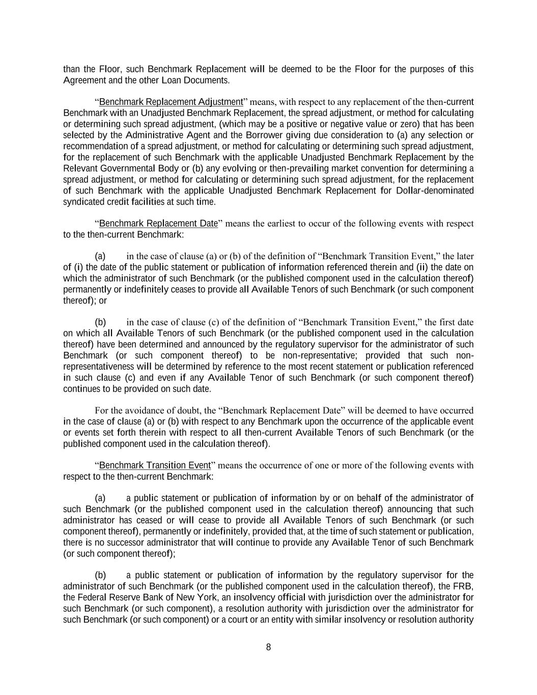 8比下限,就本协议和其他贷款文件而言,此类基准更换将被视为下限。“基准置换调整”是指,就任何以未经调整的基准置换取代当时的基准而言,由行政代理人和借款方在适当考虑(a)任何选择或建议的利差调整,或计算或确定这种利差调整的方法(可能是正值或负值或零)选择的利差调整,或计算或确定这种利差调整的方法,用于由相关政府机构以适用的未调整基准替代替代此类基准或(b)任何正在演变或当时盛行的确定价差调整的市场惯例,或计算或确定此类价差调整的方法,以便在此时以适用的未调整基准替代美元计价的银团信贷融资。“基准更换日期”是指与当时的基准相关的以下事件最早发生的日期:(a)在“基准过渡事件”定义的(a)或(b)条的情况下,(i)公开声明或公布其中所指信息的日期,以及(ii)该基准(或计算该基准时使用的已公布部分)的管理人永久或无限期停止提供该基准(或其此类部分)的所有可用期限的日期,两者中较后者为准;或(b)在“基准过渡事件”定义的(c)条的情况下,监管主管确定并宣布此类基准(或其此类组成部分)的管理人不具有代表性的所有此类基准(或其计算中使用的已公布组成部分)的可用期限的第一个日期;但此类不具有代表性将通过参考此类条款(c)中提及的最近声明或出版物来确定,即使在该日期继续提供此类基准(或其此类组成部分)的任何可用期限。为免生疑问,在(a)或(b)条有关任何基准的情况下,一旦发生适用的事件或其中所述的有关该基准的所有当时可用期限(或计算该基准时使用的已公布组成部分)的事件,“基准更换日期”将被视为已发生。“基准转换事件”是指就当时的基准发生以下一项或多项事件:(a)由或代表该基准管理人(或计算该基准时使用的已发布部分)发布的公开声明或发布信息,宣布该管理人已永久或无限期停止或将停止提供该基准(或其此类部分)的所有可用期限,但前提是,在该声明或发布时,没有继任管理人将继续提供此类基准(或其此类组成部分)的任何可用期限;(b)监管主管为此类基准(或计算其所使用的已公布组成部分)的管理人、FRB、纽约联邦储备银行、对此类基准(或此类组成部分)的管理人具有管辖权的破产官员、对此类基准(或此类组成部分)的管理人具有管辖权的解决机构或具有类似破产或解决机构的法院或实体的公开声明或公布信息