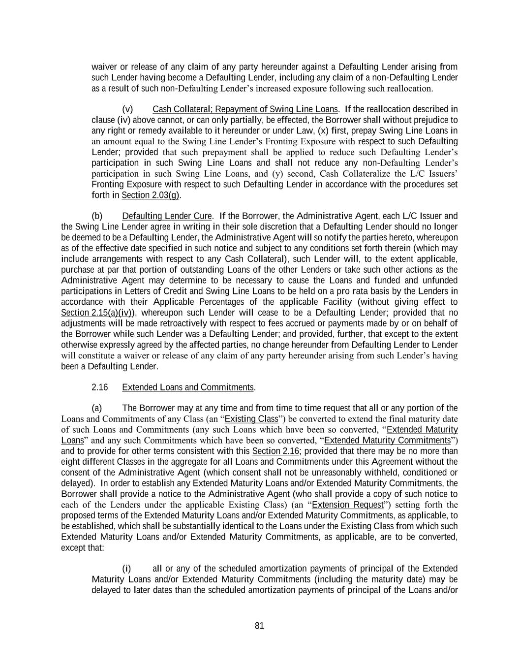 81放弃或解除任何一方根据本协议对已成为违约贷款人的违约贷款人提出的任何索赔,包括非违约贷款人因此类非违约贷款人在此类重新分配后增加风险敞口而提出的任何索赔。(v)现金抵押品;偿还周转额度贷款。如果上述第(iv)款所述的重新分配不能或只能部分实现,则借款人应在不损害其根据本协议或根据法律可获得的任何权利或补救的情况下,(x)首先预付周转额度贷款,金额等于周转额度贷款人对该违约贷款人的前沿风险敞口;但应应用此种提前还款以减少该违约贷款人对该周转额度贷款的参与,且不应减少任何非违约贷款人对该周转额度贷款的参与,以及(y)其次,根据第2.03(g)节规定的程序,以现金抵押信用证发行人对这类违约贷款人的前置风险敞口。(b)违约贷款人治疗。如借款人、行政代理人、各信用证发行人及周转额度贷款人全权酌情以书面同意违约贷款人不再被视为违约贷款人,则行政代理人将就此通知双方,据此,自该通知所指明的生效日期起,并在符合其中所列任何条件(可能包括与任何现金抵押品有关的安排)的情况下,该贷款人将在适用范围内,按面值购买其他贷款人的未偿还贷款部分,或采取行政代理人认为必要的其他行动,以促使贷款人按照其在适用贷款中的适用百分比(不影响第2.15(a)(iv)节)按比例持有贷款以及有资金和无资金参与信用证和周转额度贷款,据此,该贷款人将不再是违约贷款人;条件是,在该贷款人是违约贷款人期间,不会对由借款人或代表借款人的应计费用或付款进行追溯调整;此外,条件是,除非受影响各方另有明确约定,否则本协议项下从违约贷款人变为贷款人的任何变更将不构成对本协议项下任何一方因该贷款人一直是违约贷款人而产生的任何债权的放弃或解除。2.16延长贷款和承诺。(a)借款人可随时并不时要求转换任何类别(“现有类别”)的全部或任何部分贷款及承诺,以延长该等贷款及承诺(已如此转换的任何该等贷款、“延长到期贷款”及已如此转换的任何该等承诺)的最后到期日,“延长到期承诺”),并规定与本第2.16节一致的其他条款;前提是未经行政代理人同意,本协议项下的所有贷款和承诺合计不得超过八个不同类别(不得无理拒绝、附加条件或延迟同意)。为确立任何延长到期贷款和/或延长到期承诺,借款人应向行政代理人(行政代理人应向适用的现有类别下的每个贷款人提供该通知的副本)提供一份通知(“延期请求”),其中载列拟确立的延长到期贷款和/或延长到期承诺(如适用)的拟议条款,这些条款应与现有类别下的贷款基本相同,这些贷款和/或延长到期承诺(如适用)将从中转换,但以下情况除外:(i)延长到期贷款和/或延长到期承诺的全部或任何本金的预定摊销付款(包括到期日)可延迟至比贷款本金的预定摊销付款和/或
