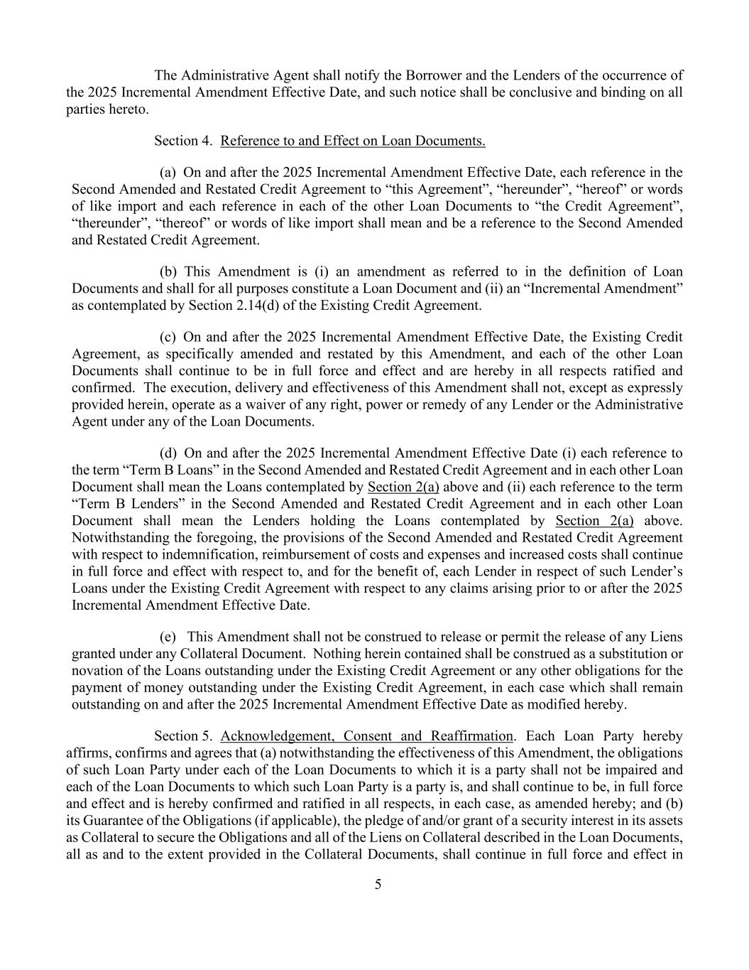 5行政代理人应当将2025年增量修正生效日期的发生情况通知借款人和出借人,该通知具有结论性,对协议各方均具有约束力。第4节。借款文件的提述及效力。(a)在2025年增量修订生效日期当日及之后,第二份经修订及重述信贷协议中每项提述“本协议”、“本协议”、“本协议”或类似进口的词语,以及每一份其他贷款单证中每项提述“信贷协议”、“本协议”、“其中”或类似进口的词语,均指并为第二份经修订及重述信贷协议的提述。(b)本修订是(i)贷款文件定义中提及的修订,就所有目的而言,应构成贷款文件和(ii)现有信贷协议第2.14(d)条所设想的“增量修订”。(c)在2025年增量修订生效日期当日及之后,经本修订特别修订及重述的现有信贷协议及其他每一份贷款文件应继续具有充分的效力及效力,并在此在所有方面予以批准及确认。本修正案的执行、交付和有效性,除本文明文规定外,不得作为放弃任何贷款人或行政代理人在任何贷款文件下的任何权利、权力或补救措施。(d)在2025年增量修订生效日期当日及之后(i)在第二份经修订及重述信贷协议中及在彼此的贷款文件中每项提述“B期贷款”一词,均指上文第2(a)条所设想的贷款,及(ii)在第二份经修订及重述信贷协议中及在彼此的贷款文件中每项提述“B期贷款人”一词,均指持有上文第2(a)条所设想的贷款的贷款人。尽管有上述规定,第二份经修订和重述的信贷协议有关赔偿、偿还成本和开支以及增加的成本的规定应继续对每一贷款人根据现有信贷协议就2025年增量修订生效日期之前或之后产生的任何债权提供的贷款具有充分的效力和效力,并为每一贷款人的利益。(e)本修订不得解释为解除或准许解除根据任何抵押文件所授出的任何留置权。本文所载的任何内容均不得解释为替代或更新现有信贷协议项下的未偿还贷款或支付现有信贷协议项下未偿还款项的任何其他义务,在每种情况下,在经特此修改的2025年增量修订生效日期及之后仍未偿还。第5节。致谢、同意及重申。每一贷款方在此申明、确认并同意:(a)尽管本修正案具有效力,但该贷款方在其作为当事方的每一份贷款文件项下的义务不应受到损害,而该贷款方作为当事方的每一份贷款文件现在并应继续具有充分的效力和效力,并在所有方面得到确认和批准,在每一种情况下,均经特此修正;(b)其对这些义务的担保(如适用),将其资产上的担保权益作为抵押品进行质押和/或授予担保权益,以担保贷款文件中所述的债务和抵押品上的所有留置权,所有这些均在抵押文件中规定的范围内,应继续完全有效,并在