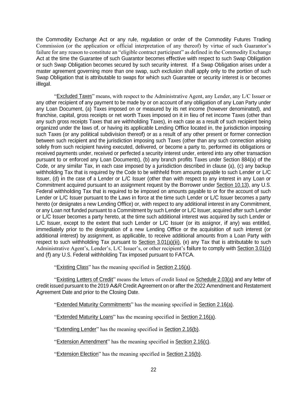 22《商品交易法》或商品期货交易委员会的任何规则、条例或命令(或其中任何一项的申请或官方解释)因该担保人因任何原因未能构成《商品交易法》中定义的“合格合同参与人”,当该担保人的担保就该掉期义务生效或该掉期义务成为由该担保权益担保时。如果根据管辖多个掉期的主协议产生掉期义务,则此类排除仅适用于此类担保或担保权益为或成为非法的可归属于掉期的此类掉期义务部分。“不征税”是指,就行政代理人、任何贷款人、任何信用证发行人或任何其他收款人而言,任何贷款方根据任何贷款文件承担的任何义务将支付或因其承担的任何付款,(a)对其净收入(无论如何计价)征收或以其净收入计量的税款,以及对其征收的特许权、资本、毛收入或净值税,以代替净所得税(任何此类属于预扣税的毛收入税除外),在每种情况下,由于该收款人根据以下法律组织,或其适用的贷款办事处位于征收此类税款的司法管辖区(或其任何政治分支机构),或由于此类收款人与征收此类税款的司法管辖区之间的任何其他现有或以前的联系(仅因此类收款人已签署、交付或成为一方、履行其义务或根据、收到或完善根据、根据或强制执行任何贷款文件订立任何其他交易的担保权益而产生的任何此类联系除外),(b)《守则》第884(a)条规定的任何分支机构利得税,或任何类似的税款,在(a)、(c)条所述的法域所施加的每一情况下,《守则》要求从应付给该贷款人或信用证发行人的款项中扣除的任何备用预扣税款,(d)在贷款人或信用证发行人的情况下(不包括根据借款人根据第10.13条提出的转让请求而获得的任何贷款或承诺的任何权益),根据在该贷款人或信用证发行人成为本协议一方(或指定新的贷款办事处)时有效的法律,或就任何承诺中的任何额外利息,或在该贷款人或信用证发行人成为本协议一方后获得的任何未根据该贷款人或信用证发行人的承诺提供资金的贷款,在该贷款人或信用证发行人获得该额外利息时,需要对应付给该贷款人或信用证发行人或为其账户支付的金额征收的任何美国联邦预扣税,除非该贷款人或信用证发行人(或其转让人,如有的话)有权在紧接指定新的贷款办事处或通过转让获得该利息(或额外利息)(如适用)之前,根据第3.01(a)(二)节从贷款方收取与此种预扣税有关的额外金额,(e)归属于该行政代理人、贷款人、信用证发行人的任何税款,或其他收款人未能遵守第3.01(e)节和(f)节根据FATCA征收的任何美国联邦预扣税。“现有类”具有第2.16(a)节规定的含义。“现有信用证”指附表2.03(a)所列的信用证以及在2022年修订及重述协议日期或之后及截止日期之前根据2019年A & R信用协议签发的任何信用证。“延长到期承诺”具有第2.16(a)节规定的含义。“延长期限贷款”具有第2.16(a)节规定的含义。“延长贷款人”具有第2.16(b)节规定的含义。“延期修正”具有第2.16(c)节规定的含义。“延期选举”具有第2.16(b)节规定的含义。