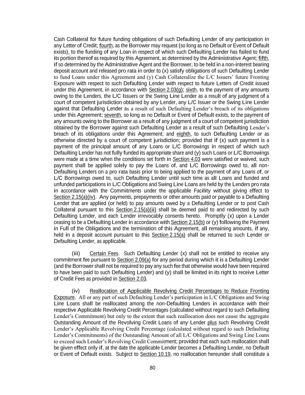 80为该违约贷款人未来参与任何信用证的融资义务提供现金抵押;第四,根据借款人可能要求(只要不存在违约或违约事件),为该违约贷款人未能按本协议要求为其所涉部分提供资金的任何贷款提供资金,由行政代理人确定;第五,如果行政代理人和借款人如此确定,根据第2.03(g)节,存放在无息存款账户中并按比例解除,以便(x)履行该违约贷款人根据本协议为贷款提供资金的义务,以及(y)以现金抵押信用证发行人就根据本协议签发的未来信用证对该违约贷款人的未来前沿风险敞口;第六,支付因任何贷款人获得的具有管辖权的法院的任何判决而欠贷款人、信用证发行人或周转额度贷款人的任何款项,任何信用证发行人或周转额度贷款人因该违约贷款人违反其在本协议项下的义务而针对该违约贷款人;第七,只要不存在违约或违约事件,则支付借款人因该违约贷款人违反其在本协议项下的义务而针对该违约贷款人取得的任何有管辖权的法院的任何判决而欠该借款人的任何款项;第八,向该等违约贷款人或根据有管辖权的法院的其他指示;但如果(x)该等付款是支付任何贷款或信用证借款的本金,而该违约贷款人尚未就其适当份额提供全部资金,并且(y)该等贷款或信用证借款是在第4.03条所列条件得到满足或放弃时作出的,则该等付款应仅用于支付所欠的贷款和信用证借款,在适用于支付该违约贷款人的任何贷款或欠该违约贷款人的信用证借款之前,所有非违约贷款人按比例持有,直至贷款人根据适用融资项下的承诺按比例持有所有贷款以及有资金和无资金参与的信用证债务和周转额度贷款,而不影响第2.15(a)(iv)节。根据本条第2.15(a)(ii)款申请(或持有)支付违约贷款人所欠款项或贴出现金抵押品的任何已支付或应付给违约贷款人的任何款项、预付款或其他款项,应被视为已支付给该违约贷款人并由该违约贷款人转拨,且每个贷款人均不可撤销地同意此项协议。在全额支付债务和本协议终止后,一旦贷款人根据第2.15(b)或(y)节不再是违约贷款人,应迅速(x)将根据本条第2.15(a)节在存款账户中持有的所有剩余金额(如有)退还给该贷款人或违约贷款人(如适用)。(三)某些费用。该违约贷款人(x)无权根据第2.09(a)条就其作为违约贷款人的任何期间收取任何承诺费(且借款人不应被要求支付任何本应被要求支付给该违约贷款人的此类费用),并且(y)应受到第2.03条规定的其收取信用证费用的权利的限制。(iv)重新分配适用的循环信贷百分比以减少前沿风险。该等违约贷款人参与信用证债务和周转额度贷款的全部或任何部分,应在非违约贷款人之间按照各自适用的循环信贷百分比(计算时不考虑该违约贷款人的承诺)重新分配,但仅限于此类重新分配不会导致任何贷款人的循环信用贷款的未偿还总额加上该循环信用贷款人的适用循环信贷百分比(计算时不考虑该违约贷款人的承诺)所有信用证债务和周转额度贷款的未偿还金额超过该贷款人的循环信贷承诺;但每项此类重新分配只有在适用的贷款人成为违约贷款人之日不存在违约或违约事件时才能生效。除第10.19条另有规定外,本协议项下的任何重新分配均不构成