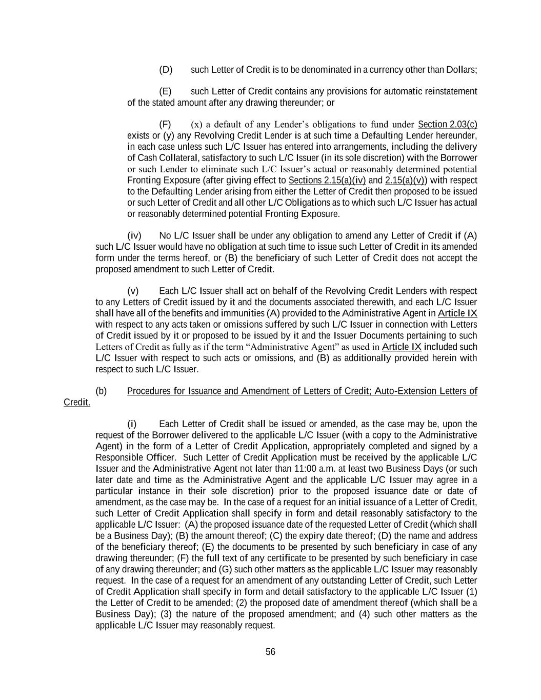 56(d)该信用证须以美元以外的货币计值;(e)该信用证载有在根据该信用证提款后自动恢复所述金额的任何规定;或(f)(x)存在任何贷款人根据第2.03(c)条承担的资金义务的违约情况,或(y)任何循环信贷贷款人此时是本信用证项下的违约贷款人,在每种情况下,除非该信用证发行人已订立安排,包括交付现金抵押品,信纳该等信用证发行人(全权酌情决定)与借款人或该贷款人消除该等信用证发行人对违约贷款人的实际或合理确定的潜在正面风险敞口(在使第2.15(a)(iv)和2.15(a)(v)条生效后)由当时提议发行的信用证或该信用证发行人实际或合理确定的潜在正面风险敞口所产生的该等信用证和所有其他信用证义务。(iv)如(a)该信用证发行人在该时间没有义务根据本协议的条款以经修订的形式签发该信用证,或(b)该信用证的受益人不接受对该信用证的拟议修订,则任何信用证发行人均无义务修订任何信用证。(v)各信用证发行人应就其签发的任何信用证及其相关单证代表循环信贷贷款人行事,每一信用证开证人就该信用证开证人就其签发或拟由其签发的信用证所采取或不作为而遭受的任何作为或不作为,以及与该信用证有关的开证人单据,如完全如同第九条所使用的“行政代理人”一词就该等作为或不作为而包括该信用证开证人一样,应享有第九条中向该行政代理人提供的所有利益和豁免,以及(b)本条款就该等信用证开证人额外规定的所有利益和豁免。(b)信用证签发和修改程序;自动展期信用证。(i)每份信用证须根据借款人的要求(视属何情况而定),以信用证申请的形式交付适用的信用证开证人(连同一份副本交付行政代理人),并适当填写,并由一名负责人员签署。适用的信用证签发人和行政代理人必须在提议的签发日期或修订日期(视情况而定)之前至少上午11:00(或行政代理人和适用的信用证签发人在特定情况下自行决定可能约定的较晚日期和时间)收到此种信用证申请。在请求首次开立信用证的情况下,该信用证申请应在形式和细节上指明令适用的信用证发行人合理满意的:(a)所要求的信用证的拟议签发日期(应为一个营业日);(b)其金额;(c)其到期日;(d)其受益人的姓名和地址;(e)该受益人在根据该信用证进行任何提款时须出示的单据;(f)该受益人在根据该信用证进行任何提款时须出示的任何凭证的全文;(g)适用的信用证发行人可能合理要求的其他事项。如有任何未付信用证的修改请求,该信用证申请应在形式和细节上指明适用的信用证发行人满意(1)将予修改的信用证;(2)其拟议修改日期(应为一个营业日);(3)拟议修改的性质;以及(4)适用的信用证发行人可能合理要求的其他事项。