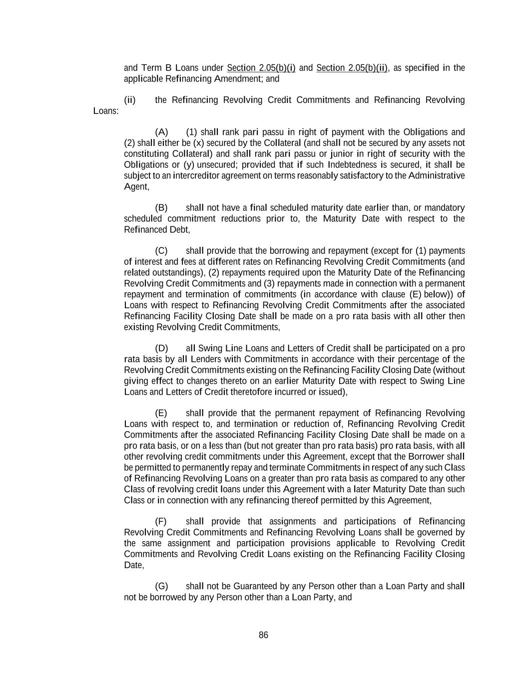 适用的再融资修正案中规定的第2.05(b)(i)节和第2.05(b)(ii)节下的86和B期贷款;和(ii)再融资循环信贷承诺和再融资循环贷款:(a)(1)应与债务享有同等受偿权,(2)应由(x)以担保物作担保(且不应由任何不构成担保物的资产作担保),并应与债务享有同等地位或次级担保权,或(y)无担保;但如果此类债务有担保,其须遵守以行政代理人合理满意的条款订立的债权人间协议,(b)不得有早于再融资债务到期日的最终预定到期日,或在到期日之前强制预定承诺减少,(c)应规定借款和还款(但(1)以不同利率支付再融资循环信贷承诺(及相关未偿)的利息和费用除外,(2)在再融资循环信贷承诺到期日所要求的偿还,以及(3)在相关再融资融资融资截止日期后就再融资循环信贷承诺的贷款(根据下文(e)条)的永久偿还和终止承诺而作出的偿还,应与当时存在的所有其他循环信贷承诺按比例作出,(d)所有周转额度贷款和信用证应由所有有承诺的贷款人按其在再融资融资融资截止日存在的循环信贷承诺的百分比按比例参与(不影响在先前发生或发出的周转额度贷款和信用证的较早到期日对其作出的变更),(e)应规定,就再融资循环贷款的永久偿还、终止或减少,在相关的再融资便利结束日期之后的再融资循环信贷承诺应与本协议项下的所有其他循环信贷承诺按比例作出,或按低于(但不高于)比例作出,除允许借款人与本协议项下任何到期日晚于该类别或与本协议允许的任何再融资有关的任何此类再融资循环贷款相比,以高于按比例的基础永久偿还和终止有关任何此类再融资循环贷款的承诺外,(f)应规定,再融资循环信贷承诺和再融资循环贷款的转让和参与应受适用于在再融资融资融资截止日期存在的循环信贷承诺和循环信贷贷款的相同转让和参与条款的管辖,(g)不得由贷款方以外的任何人提供担保,也不得由贷款方以外的任何人借入,并且