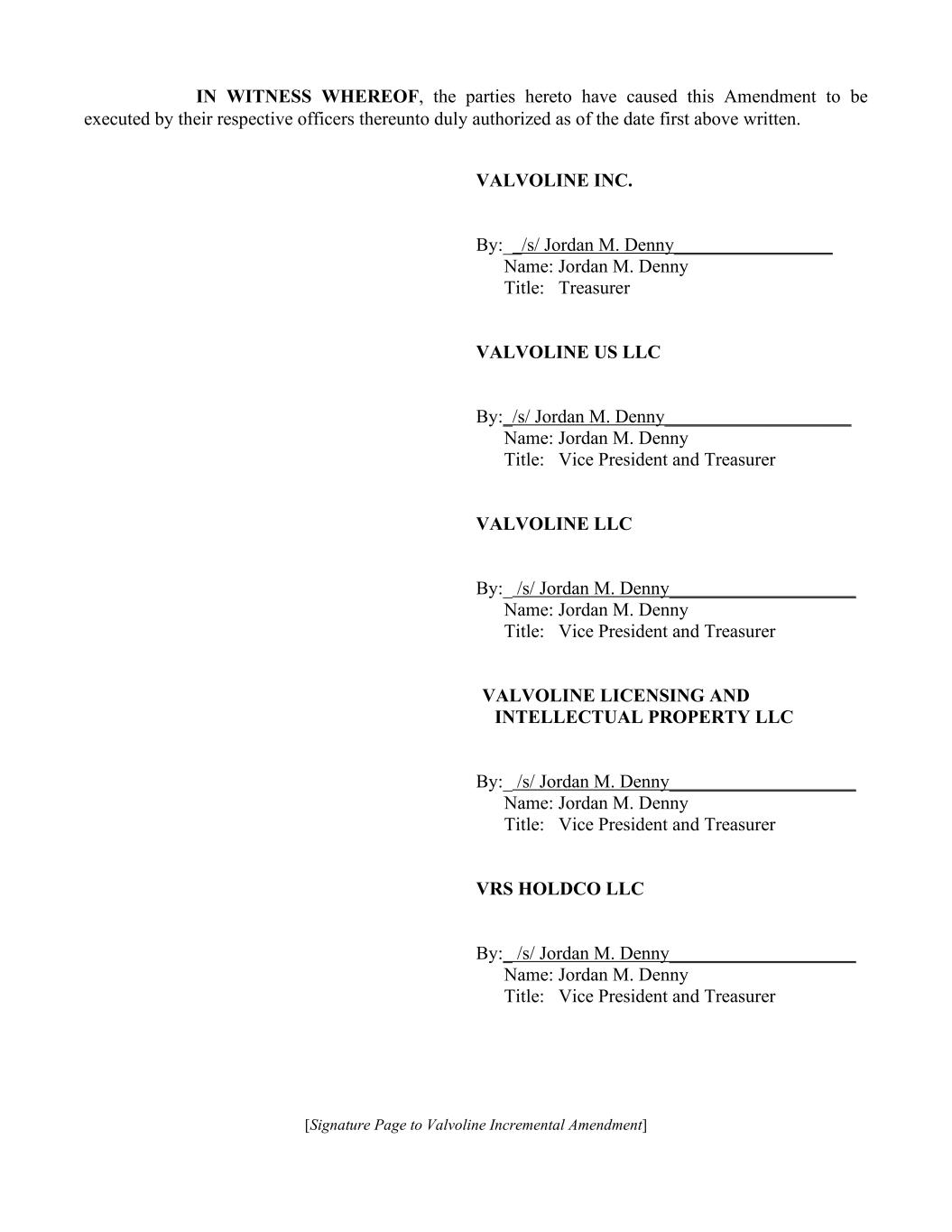【Valvoline Incremental Amendment的签名页】作为证明,本协议各方已安排由各自的高级官员在上述第一个书面日期正式授权的情况下执行本修正案。胜牌公司作者:__/s/Jordan M. Denny ______________姓名:Jordan M. Denny职务:Treasurer VALVOLINE US LLC by:_/s/Jordan M. Denny __________________姓名:Jordan M. Denny职务:副总裁兼财务主管VALVOLINE LLC by:_/s/Jordan M. Denny ______________姓名:Jordan M. Denny职务:副总裁兼财务主管VALVOLINE Licensing and Intellectual Property LLC by:_/s/Jordan M. Denny __________________姓名: