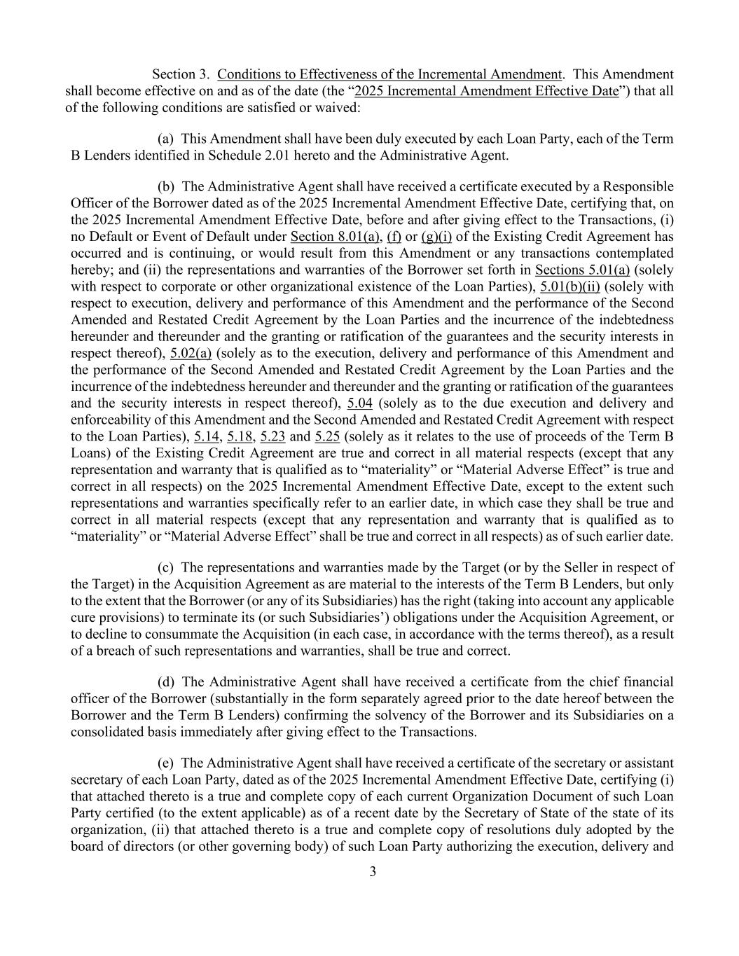 3第3节。增量修正的生效条件。本修订自以下条件全部满足或豁免之日(“2025年增量修订生效日期”)起生效:(a)本修订应已由每一贷款方、本协议附表2.01中确定的每一期限B贷款人和行政代理人正式签署。(b)行政代理人须已收到由借款人的负责人员签立的日期为2025年增量修订生效日期的证明书,证明在2025年增量修订生效日期,在交易生效前后,(i)根据现有信贷协议第8.01(a)、(f)或(g)(i)条没有发生违约或违约事件,且仍在继续,或将由本修订或本修订所设想的任何交易产生;及(ii)第5.01(a)条(仅就贷款方的公司或其他组织存在)、第5.01(b)(ii)条(仅就本修订的执行、交付和履行以及贷款方履行第二份经修订和重述的信贷协议以及产生本修订协议项下的债务以及授予或批准担保及其担保权益)、第5.02(a)条(仅就执行而言,本修正案的交付和履行以及贷款方履行第二份经修订和重述的信贷协议和产生本协议项下债务以及授予或批准担保及其担保权益),5.04(仅就本修正案和第二份经修订和重述的信贷协议对贷款方的适当执行和交付以及可执行性),5.14,5.18,现有信贷协议的5.23和5.25(仅涉及B期贷款收益的使用)在2025年增量修订生效日期的所有重大方面(除了任何符合“重要性”或“重大不利影响”的陈述和保证在所有方面都是真实和正确的)是真实和正确的,除非该等陈述和保证具体提及更早的日期,在这种情况下,它们在所有重大方面均应是真实和正确的(但任何符合“重要性”或“重大不利影响”的陈述和保证在所有方面均应是真实和正确的除外)截至该较早日期。(c)目标公司(或卖方就目标公司)在收购协议中作出的对B期贷款人的利益具有重大意义的陈述和保证,但仅限于借款人(或其任何子公司)有权(考虑到任何适用的补救条款)终止其(或该等子公司)在收购协议下的义务,或因违反该等陈述和保证而拒绝完成收购(在每种情况下,根据其条款),这些陈述和保证应是真实和正确的。(d)行政代理人应已收到借款人首席财务官的证明(基本上采用借款人与B期贷款人在本协议日期之前另行约定的形式),确认借款人及其子公司在紧接交易生效后的综合基础上的偿付能力。(e)行政代理人应已收到每一贷款方的秘书或助理秘书的证书,日期为2025年增量修订生效日期,证明(i)所附证书是该贷款方的每份现行组织文件的真实完整副本,该文件由其组织所在州的国务秘书在最近日期(在适用范围内)认证,(ii)所附的为该贷款方的董事会(或其他理事机构)妥为采纳的授权执行、交付及