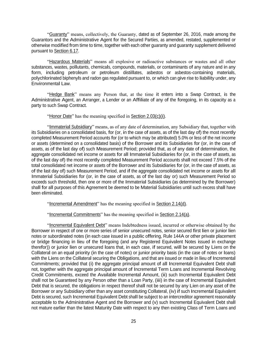 25“担保”是指截至2016年9月26日在担保人和有担保当事人的行政代理人之间作出的、经不时修订、重述、补充或以其他方式修改的担保,连同根据第6.17节交付的相互担保和担保补充的统称。“危险材料”是指所有爆炸性或放射性物质或废物以及所有其他物质、废物、污染物、化学品、化合物、材料或任何性质和任何形式的污染物,包括石油或石油蒸馏物、石棉或含石棉材料、多氯联苯和氡气,这些物质根据任何环境法管理或可能引起任何环境法规定的责任。“对冲银行”是指在其订立掉期合同时,作为上述任何一项的行政代理人、安排人、贷款人或关联公司,以其作为该掉期合同一方的身份的任何人。“荣誉日期”具有第2.03(c)(i)节规定的含义。“非实质性子公司”是指,截至任何确定日期,任何子公司连同其合并基础上的子公司,在最近完成的计量期(如为资产,则截至最后一日)占借款人及其子公司在该计量期(或如为资产,则截至最后一日)的净收入或资产(按合并基础确定)的5.0%或以下的任何子公司;但截至任何确定日期,最近完成的计量期账户(如为资产,则截至最后一天)的所有非实质性子公司的合并净收益或资产总额,不得超过借款人及其子公司在该计量期(如为资产,则截至最后一天)的合并净收益或资产总额的7.5%,且如果所有非实质性子公司(如为资产,则截至最后一天或)该计量期的合并净收益或资产总额超过该阈值,然后,就本协议的所有目的而言,一家或多家非物质子公司(由借款人确定)应被视为重要子公司,直到该超额部分被消除。“增量修正”具有第2.14(d)节规定的含义。“增量承诺”具有第2.14(a)节规定的含义。“增量等值债务”是指借款人就一个或多个系列的高级无抵押票据、高级有担保优先留置权或次级留置权票据或次级票据(在每种情况下均以公开发售、规则144A或其他私募或替代上述规定的过桥融资(以及为交换而发行的任何已登记的等值票据)发行、招致或以其他方式获得的债务或次级留置权或无担保贷款,在每种情况下,如果有担保,将以担保物上的同等优先权(在票据的情况下)或次级优先权(在票据或贷款的情况下)的留置权作为担保,并以担保债务的担保物上的留置权作为担保,且为代替增量承诺而发行或作出;但(i)所有增量等值债务的本金总额,连同增量定期贷款和增量循环信贷承诺的本金总额,不得超过可用的增量金额,(ii)此类增量等值债务不得由贷款方以外的任何人提供担保,(iii)就有担保的增量等值债务而言,与该等债务有关的债务不得以对借款人或构成抵押品的任何资产以外的任何附属公司的任何资产的任何留置权作担保,(iv)如该等增量等值债务有担保,则该等增量等值债务须受制于行政代理人和借款人合理接受的债权人间协议,及(v)该等增量等值债务不得早于任何当时存在的类别定期贷款的最近到期日到期,以及