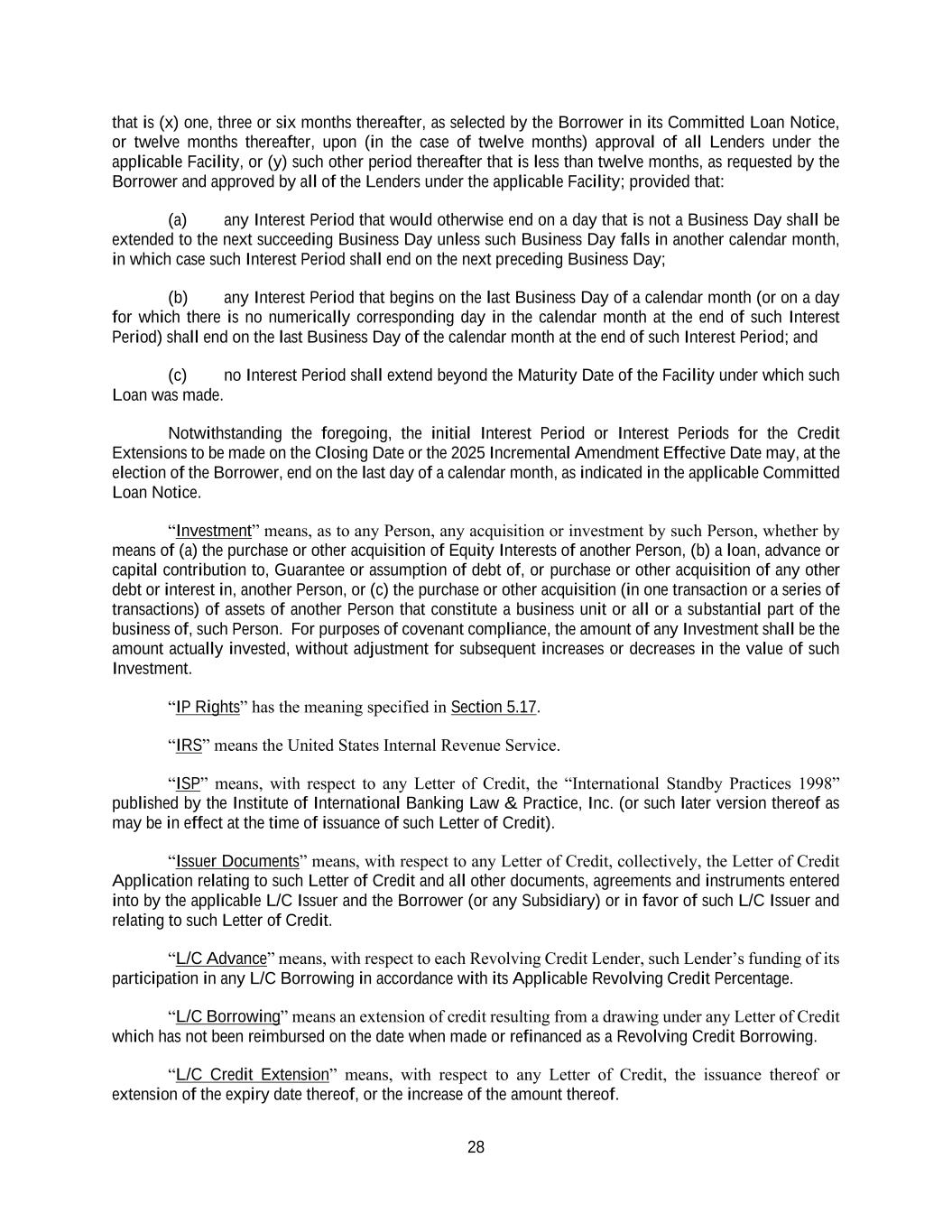 28即(x)借款人在其承诺贷款通知中选定的一个、三个或六个月后,或在适用融资下的所有贷款人(如为十二个月)批准后的十二个月后,或(y)其后少于十二个月的其他期间,根据借款人的要求,并经适用融资项下所有贷款人的批准;但:(a)任何利息期间如以其他方式在非营业日的一天结束,则须延长至下一个营业日,除非该营业日是在另一个日历月,在此情况下,该利息期应于下一个上一营业日结束;(b)自一个历月的最后一个营业日(或在该利息期结束时该历月中没有数字对应日的一天)开始的任何利息期应于该利息期结束时该历月的最后一个营业日结束;及(c)任何利息期不得延长至作出该等贷款所依据的融资的到期日之后。尽管有上述规定,将于截止日或2025年增量修正生效日作出的信贷展期的初始利息期或利息期,可根据借款人的选择,在一个历月的最后一天结束,如适用的承诺贷款通知中所示。“投资”对任何人而言是指该人的任何收购或投资,无论是通过(a)购买或以其他方式收购另一人的股权,(b)向另一人的贷款、垫款或出资、担保或承担债务,或购买或以其他方式收购另一人的任何其他债务或权益,或(c)购买或以其他方式收购(在一项交易或一系列交易中)另一人构成该人的业务单位或业务的全部或实质性部分的资产。为遵守契约的目的,任何投资的金额应为实际投资的金额,不对该投资价值的后续增减进行调整。“知识产权”具有第5.17条规定的含义。“IRS”是指美国国税局。“ISP”是指,就任何信用证而言,国际银行法律与实践协会(Institute of International Banking Law & Practice,Inc.)发布的“International Standby Practices 1998”(或在签发该信用证时可能有效的更高版本)。“开证人单据”是指,就任何信用证而言,统称为与该信用证有关的信用证申请以及适用的信用证发行人与借款人(或任何附属公司)订立的或以该信用证发行人为受益人并与该信用证有关的所有其他单据、协议和票据。“信用证垫款”是指,就每个循环信贷贷款人而言,该贷款人按照其适用的循环信贷百分比为其参与任何信用证借款提供资金。“信用证借款”是指任何信用证项下的提款产生的信贷展期,该提款在作出或作为循环信贷借款进行再融资之日尚未偿还。“信用证展期”是指,就任何信用证而言,签发或延长其到期日,或增加其金额。