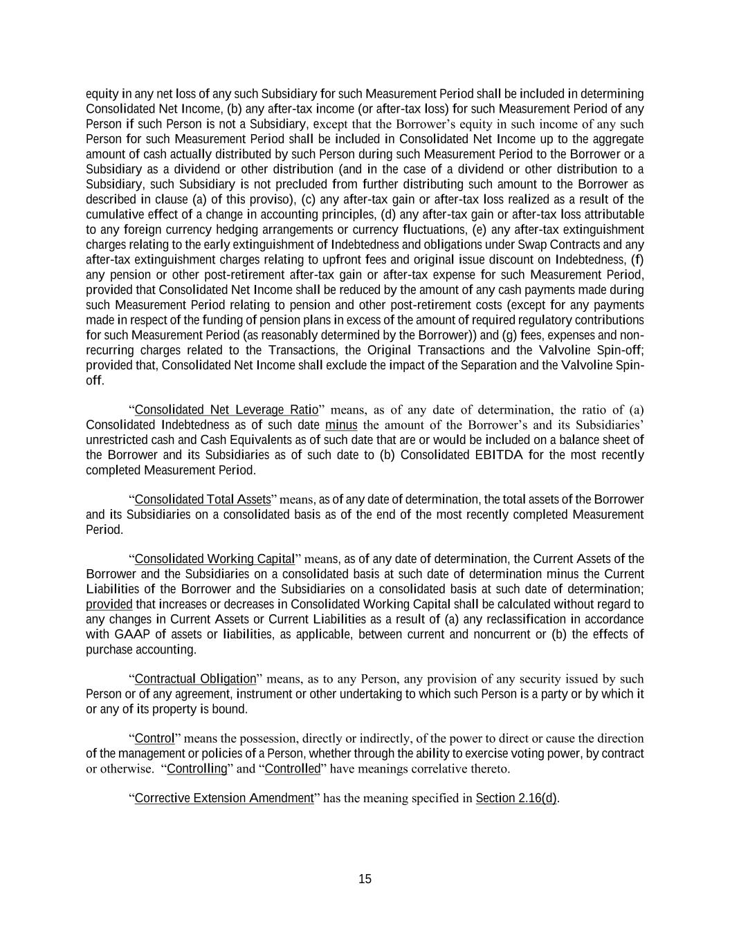 15任何该等附属公司在该计量期内的任何净亏损的权益,应包括在确定合并净收益中,(b)任何人在该计量期内的任何税后收入(或税后亏损),如果该人不是附属公司,但借款人在任何该等人士于该计量期的该等收入中的权益,须计入合并净收益,但以该等人士于该计量期内作为股息或其他分派而实际分配予借款人或附属公司的现金总额为限(而在向附属公司作出股息或其他分派的情况下,该附属公司不排除进一步向借款人分配本但书(a)条所述的该等金额),(c)因会计原则变更的累积影响而实现的任何税后收益或税后亏损,(d)可归因于任何外币对冲安排或货币波动的任何税后收益或税后亏损,(e)与掉期合同项下债务和义务的提前清偿有关的任何税后清偿费用,以及与前期费用和债务的原始发行折扣有关的任何税后清偿费用,(f)该计量期的任何养老金或其他退休后税后收益或税后费用,但合并净收益应减去在该计量期内支付的与养老金和其他退休后费用有关的任何现金付款的金额(就养老金计划的筹资支付的任何款项超过该计量期所需监管缴款的金额(由借款人合理确定)除外)和(g)与交易、原始交易和Valvoline分拆有关的费用、开支和非经常性费用;但合并净收益应排除分拆和Valvoline分拆的影响。“合并净杠杆率”是指,截至任何确定日期,(a)截至该日期的合并债务减去截至该日期借款人及其子公司的非限制性现金和现金等价物的金额,这些金额在该日期已经或将计入借款人及其子公司的资产负债表,与(b)最近完成的计量期的合并EBITDA的比率。“合并总资产”是指截至任何确定日,借款人及其子公司在合并基础上截至最近一个完成的计量期末的资产总额。“合并营运资本”是指,截至任何确定日期,借款人和子公司在该确定日期的合并基础上的流动资产减去借款人和子公司在该确定日期的合并基础上的流动负债;但计算合并营运资本的增减应不考虑流动资产或流动负债的任何变化,因为(a)根据适用的公认会计原则对资产或负债进行流动和非流动之间的任何重新分类,或(b)采购会计的影响。“合同义务”就任何人而言,是指该人出具的任何担保的任何条款,或该人作为一方当事人或其或其任何财产受其约束的任何协议、文书或其他承诺的任何条款。“控制”是指通过行使投票权的能力、通过合同或其他方式,直接或间接拥有指导或导致某个人的管理或政策方向的权力。“被控制”与“被控制”具有相关含义。“更正延期修正案”具有第2.16(d)节规定的含义。