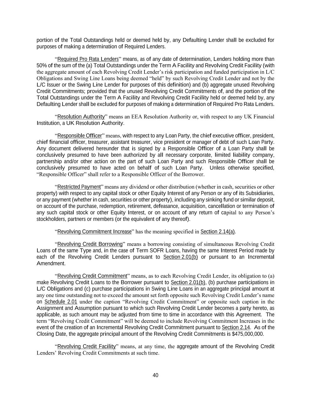 持有或被视为持有的未偿债务总额的40部分,任何违约贷款人应被排除在外,以便确定所需贷款人。“必要的按比例贷款人”是指,截至任何确定日期,持有(a)A期限融资和循环信贷融资下未偿债务总额(每个循环信贷贷款人的风险参与和资金参与信用证债务和周转额度贷款的总额被视为由该循环信贷贷款人“持有”,而不是为本定义的目的由信用证发行人或周转额度贷款人“持有”)和(b)未使用的循环信贷承诺总额的贷款人;但未使用的循环信贷承诺,以及期限A融资和循环信贷融资下的未偿贷款总额中持有或被视为持有的部分,任何违约贷款人应被排除在外,以便确定所需的按比例贷款人。“解决机构”是指欧洲经济区解决机构,或就任何英国金融机构而言,是指英国解决机构。“负责人”是指,就任何贷款方而言,该贷款方的首席执行官、总裁、首席财务官、司库、助理司库、副总裁或债务经理。根据本协议交付的任何文件,如由贷款方的负责官员签署,应最终推定为已获得该贷款方的所有必要的公司、有限责任公司、合伙企业和/或其他行动的授权,且该负责官员应最终推定已代表该贷款方行事。除另有说明外,“负责人员”指借款人的一名负责人员。“限制性支付”是指任何个人或其任何子公司的任何股本或其他股权的任何股息或其他分配(无论是现金、证券或其他财产),或任何支付(无论是现金、证券或其他财产),包括任何偿债基金或类似存款,因购买、赎回、报废、撤销、收购、注销或终止任何此类股本或其他股权,或因向任何人的股东、合伙人或成员(或其中任何等值)返还资本。“循环承诺增加”具有第2.14(a)节规定的含义。“循环信用借款”是指由同一类型的同步循环信用贷款组成的借款,在定期SOFR贷款的情况下,每个循环信用贷款人根据第2.01(b)节或根据增量修订作出的具有相同利息期的借款。“循环信贷承诺”是指,就每一循环信贷贷款人而言,其有义务(a)根据第2.01(b)节向借款人提供循环信贷贷款,(b)购买参与信用证债务和(c)购买参与周转额度贷款,在任何一次未偿还的本金总额不超过附表2.01该循环信贷贷款人在“循环信贷承诺”标题下与该循环信贷贷款人名称相对的金额,或在该循环信贷贷款人成为本协议缔约方的转让和假设中与该标题相对的金额(如适用),作为该等金额可根据本协议不时作出调整。“循环信贷承诺”一词将被视为包括在根据第2.14节创建增量循环信贷承诺的情况下的循环承诺增加。截至截止日期,循环信贷承诺的本金总额为475,000,000美元。“循环信贷便利”是指在任何时候,循环信贷放款人在该时间的循环信贷承诺总额。