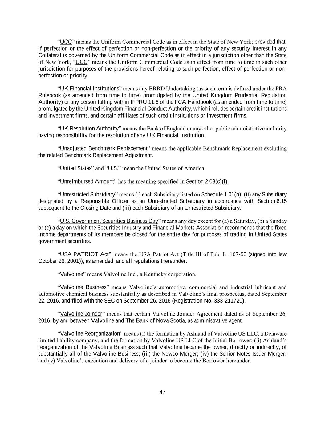 47“UCC”是指在纽约州有效的统一商法典;但前提是,如果完善性或完善性或不完善性的影响或任何担保物上的任何担保权益的优先权受在纽约州以外的司法管辖区有效的统一商法典管辖,则就本协议有关此种完善性、完善性或不完善性或优先权的规定而言,“UCC”是指在该其他司法管辖区不时有效的统一商法典。「英国金融机构 」指任何BRRD企业(该术语在英国审慎监管局颁布的《PRA规则手册》(不时修订)中定义)或属于英国金融行为监管局颁布的《FCA手册》(不时修订)的IFPRU 11.6范围内的任何人,其中包括某些信贷机构和投资公司,以及此类信贷机构或投资公司的某些关联公司。“英国决议当局”是指英国央行或任何其他公共行政当局,对任何英国金融机构的决议负有责任。“未调整基准更换”是指不包括相关基准更换调整的适用基准更换。“美国”和“美国”是指美利坚合众国。“未偿还金额”具有第2.03(c)(i)节规定的含义。“非限制性附属公司”指(i)附表1.01(b)所列的各附属公司,(ii)在截止日期后根据第6.15条由负责人员指定为非限制性附属公司的任何附属公司,以及(iii)非限制性附属公司的各附属公司。“美国政府证券营业日”是指除(a)周六、(b)周日或(c)证券业和金融市场协会建议其成员的固定收益部门全天因美国政府证券交易而关闭的任何一天。“美国爱国者法案”是指美国爱国者法案(Title III of Pub。L. 107-56(2001年10月26日签署成为法律)),经修订,及其下的所有条例。“Valvoline”意为胜牌公司,是一家肯塔基州的公司。“胜牌业务”是指胜牌的汽车、商业和工业润滑油以及汽车化学品业务,基本上如胜牌于2016年9月22日的最终招股说明书所述,并于2016年9月26日向SEC提交(注册号:333-211720)。“Valvoline Joinder”指Valvoline与作为行政代理人的加拿大丰业银行于2016年9月26日签署的某些Valvoline Joinder协议。“Valvoline重组”指(i)亚什兰组建特拉华州有限责任公司Valvoline US LLC,以及由Valvoline US LLC组建初始借款人;(ii)亚什兰重组Valvoline业务,使Valvoline直接或间接成为Valvoline业务几乎全部的所有者;(iii)Newco合并;(iv)优先票据发行人合并;(v)Valvoline执行和交付合并协议,成为本协议项下的借款人。