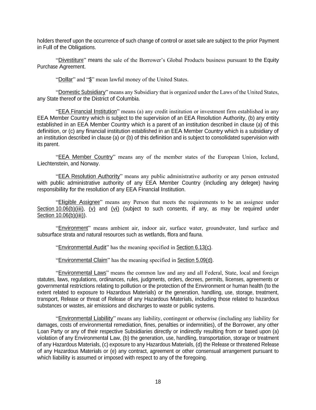 该等控制权变更或资产出售事项发生时,18名持有人须先付全部债务。「剥离」指根据股权购买协议出售借款人的全球产品业务。“美元”和“美元”是指美国的合法货币。“国内子公司”是指根据美国、美国任何州或哥伦比亚特区的法律组建的任何子公司。“EEA金融机构”是指(a)在任何EEA成员国设立的受EEA决议当局监管的任何信贷机构或投资公司,(b)在EEA成员国设立的任何实体,该实体是本定义(a)条所述机构的母公司,或(c)在EEA成员国设立的任何金融机构,该金融机构是本定义(a)或(b)条所述机构的子公司,并与其母公司合并监管。“EEA成员国”是指欧盟的任何成员国,冰岛、列支敦士登、挪威。“EEA决议当局”是指负责任何EEA金融机构的决议的任何公共行政当局或受托管理任何EEA成员国公共行政当局的任何人(包括任何受权人)。“合资格受让人”是指符合第10.06(b)(iii)、(v)和(vi)条规定的成为受让人的要求的任何人(但须根据第10.06(b)(iii)条可能要求的任何同意(如有))。“环境”是指环境空气、室内空气、地表水、地下水、陆地表层和地下地层以及湿地、动植物等自然资源。“环境审计”具有第6.13(c)节规定的含义。“环境索赔”具有第5.09(d)节规定的含义。“环境法”是指普通法和任何和所有联邦、州、地方和外国法规、法律、条例、条例、规则、判决、命令、法令、许可、许可、协议或政府限制,涉及污染或保护环境或人类健康(在与接触危险材料有关的范围内)或任何危险材料的产生、处理、使用、储存、处理、运输、释放或威胁释放,包括与危险物质或废物、空气排放和向废物或公共系统排放有关的那些。“环境责任”是指借款人、任何其他贷款方或其各自的任何子公司因(a)违反任何环境法、(b)任何危险材料的产生、使用、处理、运输、储存或处理、(c)接触任何危险材料、(d)释放或威胁释放任何危险材料或(e)任何合同而直接或间接产生的任何或有责任或其他责任(包括对损害、环境补救费用、罚款、处罚或赔偿的任何责任),协议或其他双方同意的安排,据此对上述任何一项承担或施加责任。