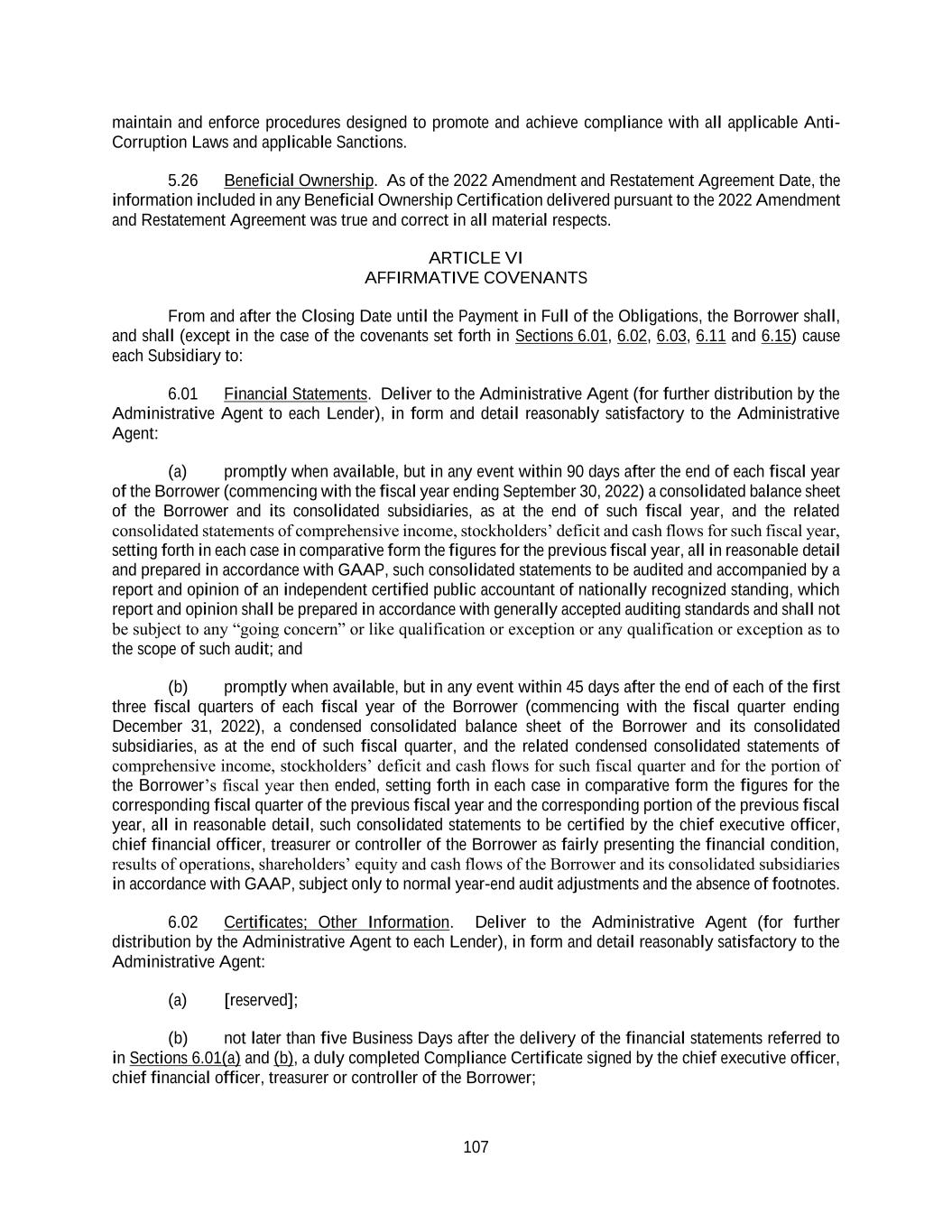 107维持和执行旨在促进和实现遵守所有适用的反腐败法律和适用制裁的程序。5.26实益所有权。截至2022年修订和重述协议日期,根据2022年修订和重述协议交付的任何受益所有权证明中包含的信息在所有重大方面都是真实和正确的。第六条自结账之日起及之后直至全额支付债务为止的肯定盟约,借款人应且应(除第6.01、6.02、6.03、6.11和6.15节所述盟约的情况外)促使各附属公司:6.01财务报表。以行政代理人合理满意的形式和细节向行政代理人交付(供行政代理人进一步分发给各贷款人):(a)在可获得的情况下迅速但无论如何在借款人的每个会计年度结束后的90天内(从截至2022年9月30日的会计年度开始)提供借款人及其合并子公司截至该会计年度结束时的合并资产负债表,以及该会计年度的相关综合收益、股东赤字和现金流量综合报表,在每种情况下以比较形式列出上一财政年度的数字,所有这些数字都以合理的详细程度并按照公认会计原则编制,这类合并报表须经审计,并附有具有国家认可资格的独立注册会计师的报告和意见,该报告和意见应按照公认的审计准则编制,不受任何“持续经营”或类似的保留或例外情况或此类审计范围的任何保留或例外情况的限制;(b)在可获得时迅速,但无论如何,在借款人每个财政年度的前三个财政季度各自结束后的45天内(自截至2022年12月31日的财政季度开始),借款人及其合并子公司截至该财政季度结束时的简明综合资产负债表,以及该财政季度和借款人该财政年度结束时部分的相关简明综合全面收益、股东赤字和现金流量表,在每种情况下以比较形式列出上一财政年度相应财政季度和上一财政年度相应部分的数字,所有这些数字均以合理的详细程度列出,此类合并报表须由借款人的首席执行官、首席财务官、司库或控制人根据公认会计原则证明公允地列报借款人及其合并子公司的财务状况、经营业绩、股东权益和现金流量,但仅限于正常的年终审计调整和没有脚注。6.02证书;其他信息。以行政代理人合理满意的形式和细节向行政代理人交付(供行政代理人进一步分发给每个贷款人):(a)[保留];(b)不迟于第6.01(a)和(b)节所述财务报表交付后五个工作日内,由借款人的首席执行官、首席财务官、司库或控制人签署的妥为填妥的合规证书;