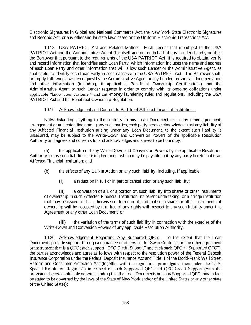 158《全球和国家商务电子签名法》、《纽约州电子签名和记录法》或任何其他基于《统一电子交易法》的类似州法律。10.18美国爱国者法案及相关事项。受《美国爱国者法》约束的每个贷款人和行政代理人(为自己而不是代表任何贷款人)特此通知借款人,根据《美国爱国者法》的要求,它需要获得、核实和记录识别每个贷款方的信息,这些信息包括每个贷款方的名称和地址以及允许该贷款人或行政代理人(如适用)根据《美国爱国者法》识别每个贷款方的其他信息。借款人应在行政代理人或任何贷款人提出书面请求后立即提供行政代理人或此类贷款人要求的所有文件和其他信息(如适用,包括受益所有权证明),以遵守其根据适用的“了解您的客户”和反洗钱规则和条例(包括《美国爱国者法案》和《受益所有权条例》)承担的持续义务。10.19确认并同意受影响的金融机构的纾困。尽管在任何贷款文件或任何此类当事人之间的任何其他协议、安排或谅解中有任何相反的规定,本协议各方均承认,任何受影响的金融机构在任何贷款文件下产生的任何负债,只要该负债是无担保的,可受适用的解决机构的减记和转换权力的约束,并同意并同意,并承认并同意受以下约束:(a)适用的解决机构对根据本协议产生的任何此类负债适用任何减记和转换权,而这些负债可能由作为受影响金融机构的本协议任何一方支付给它;(b)任何保释诉讼对任何此类负债的影响,包括(如适用):(i)全部或部分减少或取消任何此类负债;(ii)将此类负债的全部或部分转换为该受影响金融机构及其母公司的股份或其他所有权工具,或可能向其发行或以其他方式授予的过桥机构,且该等股份或其他所有权文书将由其接受,以代替与本协议或任何其他贷款文件项下的任何该等责任有关的任何权利;或(iii)与行使任何适用的解决机构的减记和转换权力有关的该等责任条款的变更。10.20关于任何受支持的QFII的致谢。如果贷款文件通过担保或其他方式为掉期合同或属于QFC的任何其他协议或工具提供支持(此类支持“QFC信用支持”,每个此类QFC为“支持的QFC”),则各方就联邦存款保险公司根据《联邦存款保险法》和《多德-弗兰克华尔街改革和消费者保护法》第二章(连同根据该法案颁布的条例,“美国特别决议制度”)就此类受支持的QFC和QFC信贷支持(尽管贷款文件和任何受支持的QFC事实上可能被声明受纽约州和/或美国或美国任何其他州的法律管辖)适用以下规定: