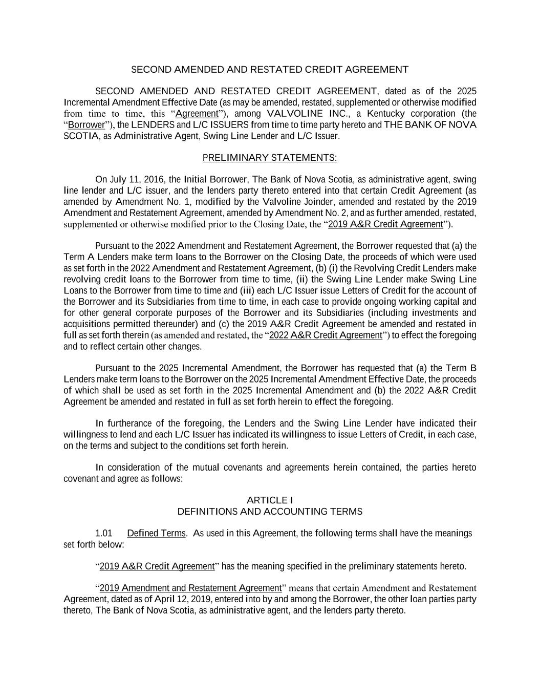 第二次修订和重述信贷协议第二次修订和重述信贷协议,日期为2025年增量修订生效日期(可能不时修订、重述、补充或以其他方式修改,本“协议”),由肯塔基州公司VALVOLINE INC.(“借款人”)、不时订约方的贷款人和信用证发行人以及作为行政代理人、周转线贷款人和信用证发行人的新斯科舍银行签署。初步声明:于2016年7月11日,初始借款人新斯科舍银行作为行政代理人、周转线贷款人及信用证发行人及其贷款方订立该若干信贷协议(经第1号修订修订、经Valvoline Joinder修订、经2019年修订及重述协议修订及经第2号修订,以及经于截止日期前进一步修订、重述、补充或以其他方式修订的“2019年A & R信贷协议”)。根据2022年修订及重述协议,借款人要求(a)A期贷款人于截止日向借款人提供定期贷款,其所得款项按2022年修订及重述协议的规定使用,(b)(i)循环信贷贷款人不时向借款人提供循环信用贷款,(ii)周转额度贷款人不时向借款人提供周转额度贷款,及(iii)各信用证发行人不时为借款人及其附属公司的账户签发信用证,在每种情况下提供持续营运资金以及用于借款人及其子公司的其他一般公司用途(包括根据该协议允许的投资和收购)和(c)对2019年A & R信贷协议进行修订并按其中规定的全部重述(经修订和重述,“2022年A & R信贷协议”),以实现上述规定并反映某些其他变化。根据2025年增量修订,借款人已要求(a)B期贷款人在2025年增量修订生效日期向借款人提供定期贷款,其收益应按2025年增量修订中规定的方式使用,以及(b)2022年A & R信贷协议按此处规定的方式进行修订和重述,以实现上述规定。为推进上述工作,贷款人和周转额度贷款人已表示愿意放贷,并且每个信用证发行人已表示愿意根据本协议规定的条款和条件签发信用证,在每种情况下。考虑到本协议所载的相互盟约和协议,本协议各方约定如下:第一条定义和会计术语1.01定义的术语。本协议中使用的以下术语应具有下述含义:“2019 A & R信贷协议”具有本协议初步声明中规定的含义。“2019年修订及重述协议”指日期为2019年4月12日的若干修订及重述协议,由借款人、其其他贷款方、作为行政代理人的新斯科舍银行及其贷款方订立。