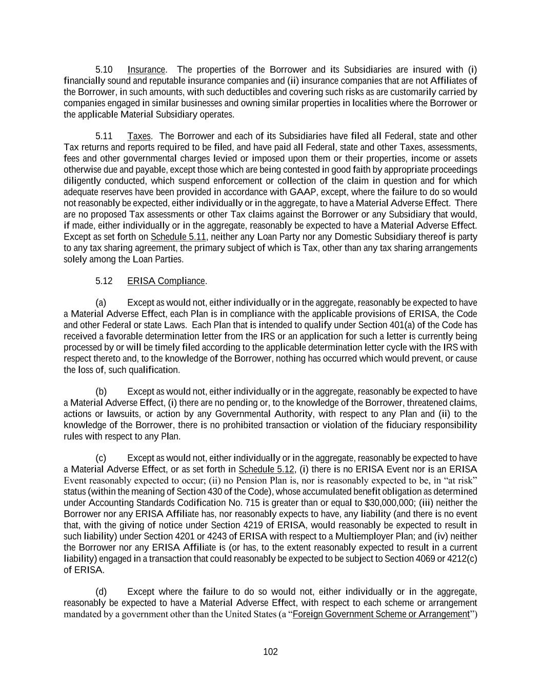 1025.10保险。借款人及其子公司的财产由(i)财务稳健和信誉良好的保险公司和(ii)非借款人关联公司的保险公司投保,保险金额为在借款人或适用的材料子公司经营的地方从事类似业务并拥有类似财产的公司通常承担的免赔额和涵盖的风险。5.11税收。借款人及其每个子公司已提交所有联邦、州和其他要求提交的纳税申报表和报告,并已支付对其或其财产、收入或资产征收或强加的所有联邦、州和其他税收、评估、费用和其他政府收费,否则到期应付,但那些因勤勉进行的适当程序而受到善意质疑的除外,这些程序暂停执行或收取相关索赔,并已根据公认会计原则为其提供了足够的准备金,但,如果未能做到这一点,则无法合理地预期,无论是单独的还是总体的,都会产生重大不利影响。不存在针对借款人或任何子公司的拟议税务评估或其他税务索赔,这些评估或其他税务索赔如果单独或合计作出,则可以合理地预期会产生重大不利影响。除附表5.11规定的情况外,任何贷款方或其任何国内子公司均不是任何税收共享协议的缔约方,其主要主体是税收,但仅在贷款方之间的任何税收共享安排除外。5.12 ERISA合规。(a)除个别或总体上合理预期不会产生重大不利影响外,每项计划均符合ERISA、《守则》和其他联邦或州法律的适用规定。根据《守则》第401(a)条拟符合资格的每项计划均已收到IRS的有利确定函,或此类信函的申请目前正在由IRS处理或将根据适用的确定函周期及时向IRS提交,并且据借款人所知,没有发生任何会阻止或导致丧失此类资格的情况。(b)除个别或总体上合理预期不会产生重大不利影响外,(i)就任何计划而言,不存在未决的或据借款人所知的威胁索赔、诉讼或诉讼,或任何政府当局的行动;(ii)据借款人所知,就任何计划而言,不存在被禁止的交易或违反信托责任规则的情况。(c)除个别或合计合理预期不会产生重大不利影响或附表5.12所列情况外,(i)不存在ERISA事件,也不合理预期会发生ERISA事件;(ii)没有、也没有合理预期会处于“有风险”状态(在《守则》第430条的含义内),其根据会计准则编纂第715号确定的累积福利义务大于或等于30,000,000美元;(iii)借款人或任何ERISA关联公司均未,也不合理地预期会有,根据ERISA第4201或4243条就多雇主计划而根据ERISA第4201或4243条承担的任何责任(且不存在合理地预期会导致此类责任的事件);(iv)借款人或任何ERISA关联公司均未(或在合理地预期会导致当前责任的范围内)从事可合理地预期会受ERISA第4069或4212(c)条约束的交易。(d)除非不这样做,就美国以外的政府授权的每一项计划或安排(“外国政府计划或安排”)而言,单独或总体上合理地预计不会产生重大不利影响(“外国政府计划或安排”)