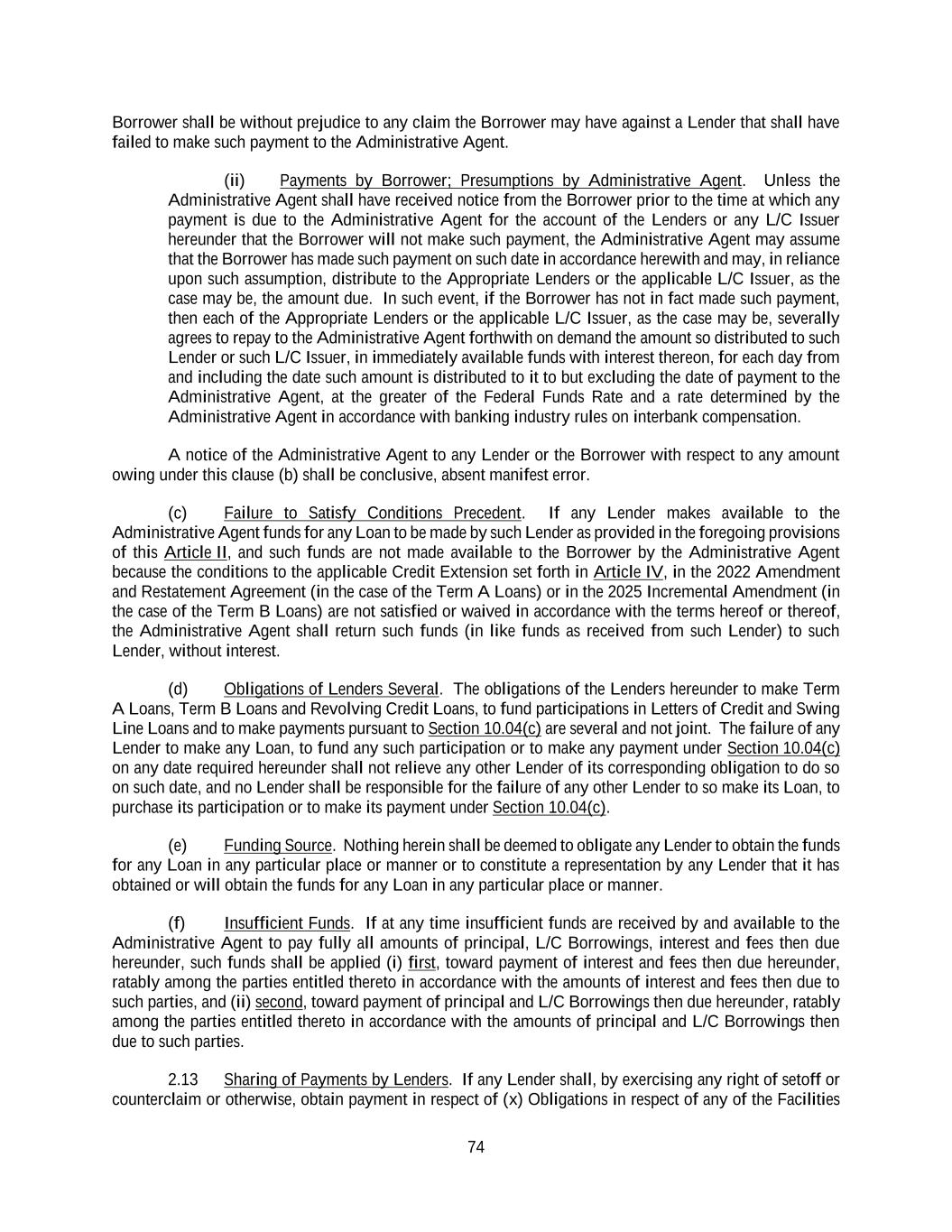74借款人不得损害借款人对未向行政代理人支付该款项的贷款人可能提出的任何索赔。(二)借款人付款;行政代理人推定。除非行政代理人在贷款人账户的行政代理人或本协议项下任何信用证发行人的任何款项到期之前已收到借款人的通知,借款人将不会支付该款项,否则行政代理人可假定借款人已按照本协议在该日期支付该款项,并可依据该假设,向适当的贷款人或适用的信用证发行人(视情况而定)分配应付款项。在这种情况下,如果借款人实际上并未支付该款项,则每一适当贷款人或适用的信用证发行人(视情况而定)分别同意应要求立即向行政代理人偿还如此分配给该贷款人或该信用证发行人的金额,以立即可用的资金及其利息,自该金额分配给其之日起至但不包括向行政代理人付款之日起的每一天,包括该日期,以联邦基金利率和行政代理人根据银行业同业报酬规则确定的利率两者中的较大者为准。行政代理人就本条款(b)项下的任何欠款向任何贷款人或借款人发出的通知应为结论性的,无明显错误。(c)未能满足先决条件。如任何贷款人按本条第二款前述规定为该贷款人拟作出的任何贷款向行政代理人提供资金,而该行政代理人因第四条、2022年修订和重述协议(如为A期贷款)或2025年增量修订(如为B期贷款)中规定的适用信贷展期的条件未按照本协议或其条款得到满足或放弃而未能向借款人提供该等资金,行政代理人应当将资金(与从该贷款人收到的资金相同)无息返还给该贷款人。(d)放款人的义务若干。根据本协议,放款人提供A期贷款、B期贷款和循环信用贷款、为参与信用证和周转额度贷款提供资金以及根据第10.04(c)节进行付款的义务是几项而不是共同的。任何贷款人未能在本协议规定的任何日期作出任何贷款、为任何该等参与提供资金或根据第10.04(c)条作出任何付款,并不解除任何其他贷款人在该日期作出该等付款的相应义务,而任何贷款人不得对任何其他贷款人未能如此作出其贷款、购买其参与或根据第10.04(c)条作出付款负责。(e)资金来源。本协议不得视为责成任何贷款人在任何特定地点或方式获得任何贷款的资金,或构成任何贷款人对其已在任何特定地点或方式获得或将获得任何贷款的资金的陈述。(f)资金不足。如行政代理人在任何时候收到且可用的资金不足,无法全额支付本合同项下当时到期的全部本金、信用证借款、利息和费用,则该等资金应(i)首先用于支付本合同项下当时到期的利息和费用,并在有权支付的各方之间按照该等方当时到期的利息和费用金额按比例分摊,(ii)其次用于支付本合同项下当时到期的本金和信用证借款,根据当时应付给这些当事人的本金和信用证借款金额,在有权获得这些款项的当事人之间按比例分配。2.13贷款人分担付款。如任何贷款人须通过行使任何抵销权或反申索或其他方式,就任何设施的(x)项债务取得付款