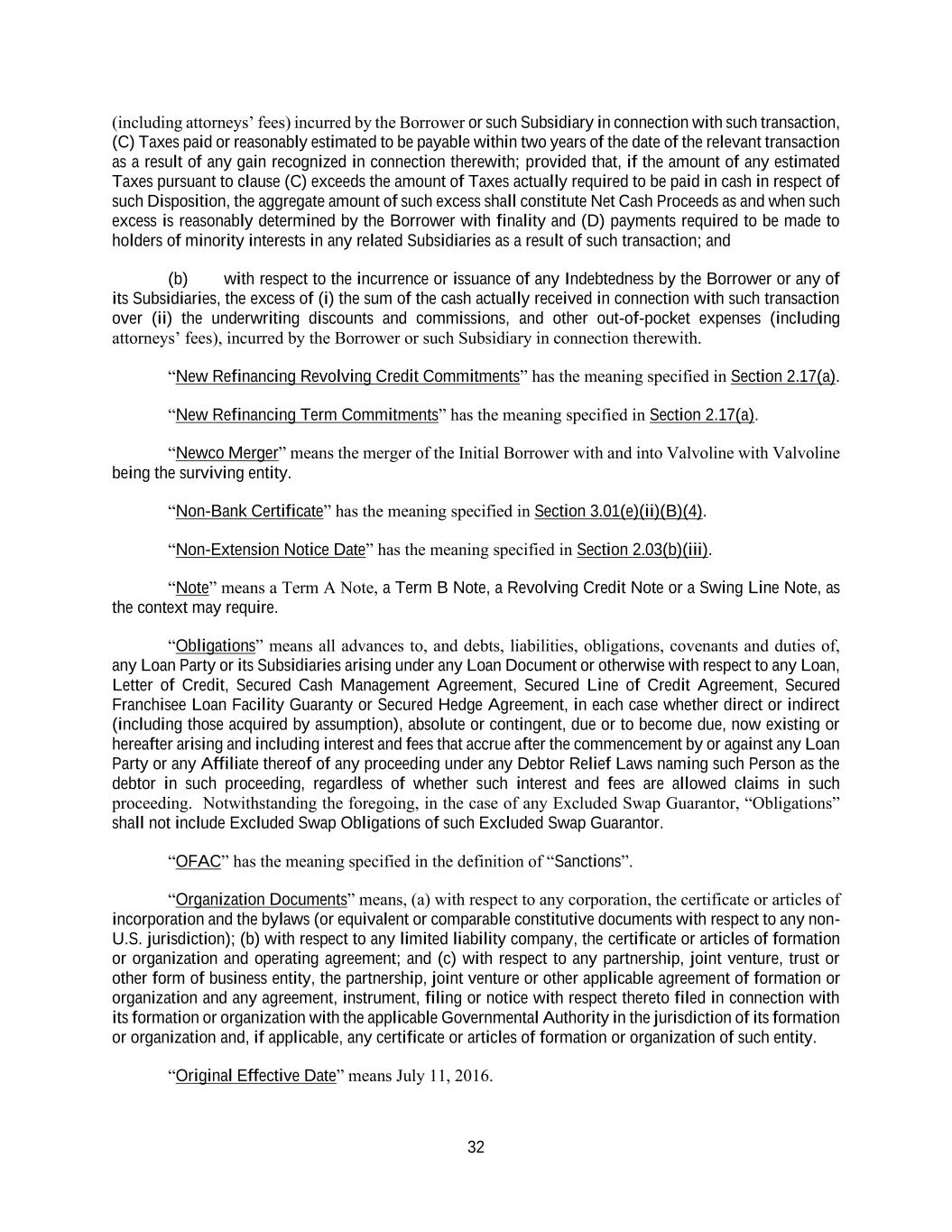 32(包括律师费)由借款人或该附属公司就该等交易而招致,(c)因与该等交易有关而确认的任何收益而在有关交易日期起计两年内已缴付或合理估计须缴付的税项;但如根据第(c)条作出的任何估计税项的金额超过就该等处分而实际须以现金缴付的税项金额,当该超额由借款人合理确定且(d)因该交易而需向任何相关子公司的少数股东权益持有人支付的款项时,该超额总额应构成现金收益净额;(b)就借款人或其任何子公司产生或发行任何债务而言,(i)就该交易实际收到的现金总额超过(ii)承销折扣和佣金以及其他自付费用(包括律师费)的部分,由借款人或该附属公司招致。“新的再融资循环信贷承诺”具有第2.17(a)节规定的含义。“新的再融资期限承诺”具有第2.17(a)节规定的含义。“Newco合并”是指初始借款人与Valvoline合并并并入Valvoline,Valvoline为存续实体。“非银行凭证”具有第3.01(e)(ii)(b)(4)条规定的含义。“不延期通知日期”具有第2.03(b)(iii)节规定的含义。“票据”是指期限A票据、期限B票据、循环信用票据或周转额度票据,视上下文需要而定。“义务”是指根据任何贷款文件或其他方式就任何贷款、信用证、有担保现金管理协议、有担保信贷额度协议、有担保特许人贷款融资担保或有担保对冲协议产生的对任何贷款方或其子公司的所有垫款以及债务、负债、义务、契诺和义务,在每种情况下,无论是直接的还是间接的(包括通过假设获得的)、绝对的还是或有的、到期的或即将到期的,现在存在或以后产生的,包括根据任何债务人救济法指定该人为该程序中的债务人的任何贷款方或其任何关联公司在任何程序启动后产生的利息和费用,无论该利息和费用是否允许在该程序中提出索赔。尽管有上述规定,就任何被排除的掉期担保人而言,“义务”不应包括该被排除的掉期担保人的被排除的掉期义务。“OFAC”具有“制裁”定义中规定的含义。“组织文件”是指,(a)就任何公司而言,公司的证书或章程以及章程(或任何非美国司法管辖区的同等或类似的组织文件);(b)就任何有限责任公司而言,证书或章程或组织和经营协议;(c)就任何合伙企业、合资企业、信托或其他形式的商业实体、合伙企业、合资企业或其他适用的组建或组织协议以及任何协议、文书,就其组建或组织向其组建或组织管辖范围内的适用政府当局以及(如适用)该实体的任何组建或组织证书或条款提交的备案或通知。“原生效日期”是指2016年7月11日。