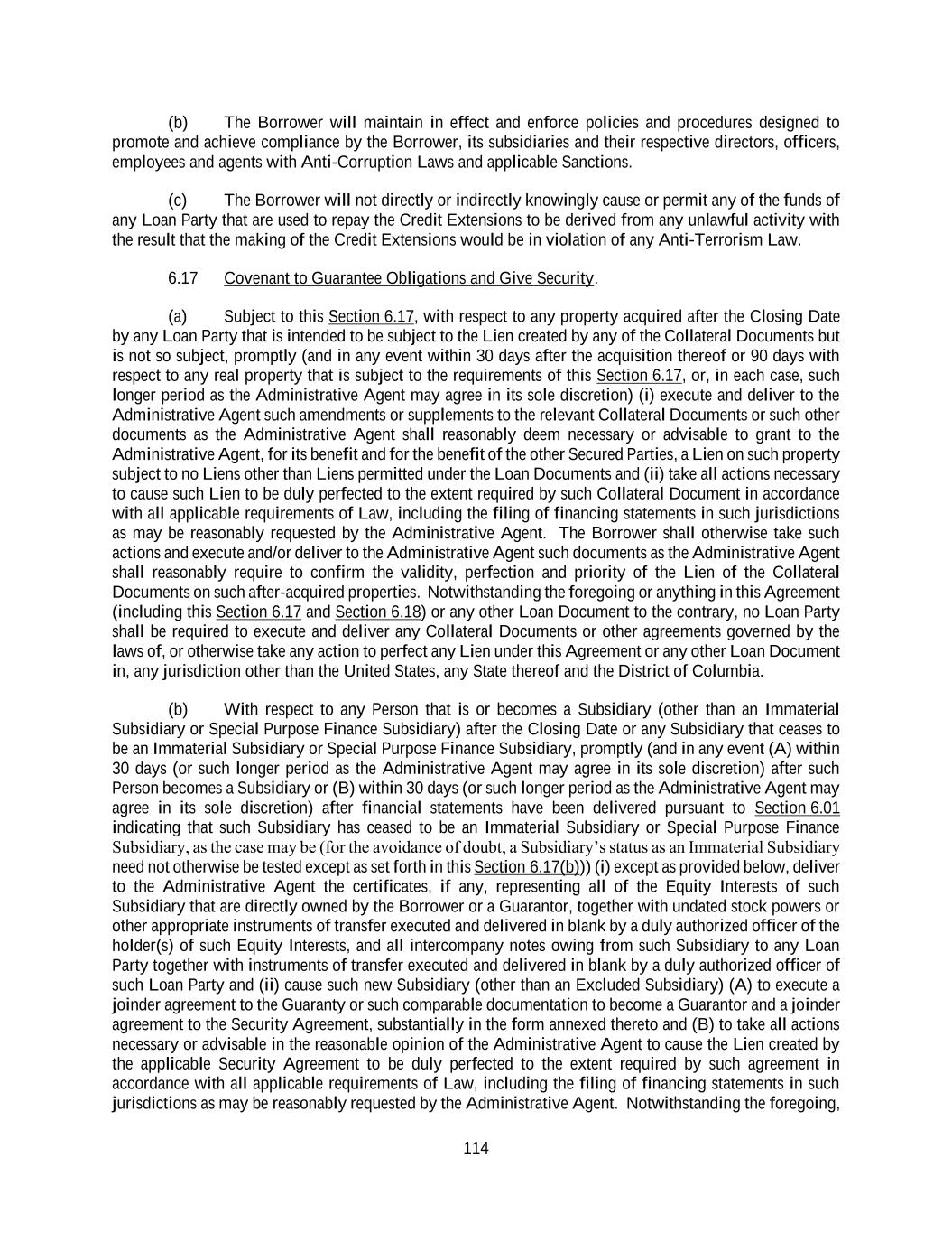 114(b)借款人将保持有效并执行旨在促进和实现借款人、其子公司及其各自的董事、高级职员、雇员和代理人遵守反腐败法和适用制裁的政策和程序。(c)借款人不会在知情的情况下直接或间接导致或允许任何贷款方用于偿还信贷展期的任何资金源自任何非法活动,其结果是信贷展期的进行将违反任何反恐怖主义法。6.17保证义务和给予担保的盟约。(a)在符合本条第6.17条的规定下,就任何贷款方在截止日期后取得的任何拟受任何附属单证所设定的留置权规限但并非如此规限的财产而言,迅速(无论如何,在取得该留置权后30天内或就任何受本条第6.17条规定规限的不动产而言的90天内,或在每种情况下,行政代理人全权酌情同意的较长期限)(i)为行政代理人的利益和其他有担保当事人的利益,执行并向行政代理人交付有关附担保文件的修改或补充或行政代理人合理认为必要或可取的其他文件,a对这类财产的留置权,除贷款文件允许的留置权外,不受任何其他留置权的限制,以及(ii)采取一切必要行动,促使这类留置权按照所有适用的法律要求在该担保文件要求的范围内得到适当完善,包括在行政代理人可能合理要求的法域提交融资报表。借款人应当采取其他行动,并执行和/或向行政代理人交付行政代理人合理要求的文件,以确认该等后取得财产上的担保书的留置权的有效性、完善性和优先权。尽管有上述规定或本协议(包括本第6.17条和第6.18条)或任何其他相反的贷款文件中的任何规定,任何贷款方不得被要求在美国、其任何州和哥伦比亚特区以外的任何司法管辖区签署和交付任何受美国法律管辖的抵押文件或其他协议,或以其他方式采取任何行动以完善本协议或任何其他贷款文件下的任何留置权。(b)就任何在截止日期后成为或成为附属公司(非重要附属公司或特殊目的融资附属公司除外)的人或任何不再是非重要附属公司或特殊目的融资附属公司的附属公司而言,迅速(且在任何情况下(a)在该人成为附属公司后30天内(或行政代理人全权酌情同意的较长期间)或(b)在根据第6.01条交付财务报表后30天内(或行政代理人全权酌情同意的较长期间)表明该附属公司已不再是非实质性附属公司或特殊目的融资附属公司(视情况而定)(为免生疑问,除本条第6.17(b))款规定的情况外,无需对附属公司作为非实质性附属公司的地位进行其他测试)(i)除下文规定的情况外,向行政代理人交付代表该附属公司由借款人或担保人直接拥有的所有股权的任何证书,以及由该等股权持有人的正式授权人员以空白方式签立和交付的未注明日期的股票权力或其他适当转让文书,以及该附属公司欠任何贷款方的所有公司间票据,连同由该贷款方的正式授权人员以空白方式签署和交付的转让文书,以及(ii)促使该新附属公司(不包括被排除的附属公司)(a)签署担保的合并协议或此类类似文件成为担保人和担保协议的合并协议,基本上以其所附的形式和(b)采取行政代理人合理认为的一切必要或可取的行动,促使适用的担保协议所设定的留置权在该协议要求的范围内按照所有适用的法律要求得到适当完善,包括在行政代理人可能合理要求的法域提交融资报表。尽管有上述情况,