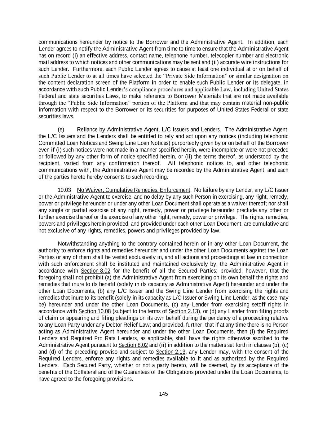 145本协议项下以通知方式向借款人和行政代理人发出的函件。此外,每一贷款人同意不时通知行政代理人,以确保行政代理人有记录在案的(i)通知和其他通信可发送到的有效地址、联系人姓名、电话号码、电传复印号码和电子邮件地址,以及(ii)此类贷款人的准确电汇指示。此外,每个公共贷款人同意根据此类公共贷款人的合规程序和适用法律,包括美国联邦和州证券法,促使至少一名代表此类公共贷款人的个人在任何时候都选择了平台内容申报屏幕上的“私方信息”或类似名称,以便使此类公共贷款人或其代表,为美国联邦或州证券法的目的,提及未通过平台的“公共侧信息”部分提供且可能包含与借款人或其证券有关的重大非公开信息的借款人材料。(e)行政代理人、信用证发行人和贷款人的依赖。行政代理人、信用证发行人和贷款人有权依赖借款人或其代表所发出的任何通知(包括电话承诺贷款通知和周转额度贷款通知)并根据其行事,即使(i)该等通知并非以本协议规定的方式发出、不完整或未在本协议规定的任何其他形式通知之前或之后发出,或(ii)其条款(如收件人所理解,与其任何确认有所不同)。向行政代理人发出的所有电话通知,以及与行政代理人进行的其他电话通信,均可由行政代理人进行记录,本合同各方在此同意进行记录。10.03不放弃;累计补救;强制执行。任何贷款人、任何信用证发行人或行政代理人未行使,以及任何该等人在行使本协议项下或任何其他贷款文件项下的任何权利、补救措施、权力或特权时未有任何延误,均不得作为放弃该权利、补救措施、权力或特权而运作;亦不得因任何单一或部分行使本协议项下的任何权利、补救措施、权力或特权而排除任何其他或进一步行使该权利、补救措施、权力或特权。此处提供的权利、补救措施、权力和特权,以及在彼此的贷款文件下提供的权利、补救措施、权力和特权,是累积的,不排除法律规定的任何权利、补救措施、权力和特权。尽管本协议或任何其他贷款文件中有任何相反的规定,但根据本协议和其他贷款文件对贷款方或其中任何一方强制执行权利和补救措施的权力应完全归属于该行政代理人,与此种强制执行有关的所有诉讼和法律程序应完全由该行政代理人根据第8.02节为所有有担保当事人的利益提起和维持;但条件是,前述并不禁止(a)行政代理人以自己的名义行使本协议项下和其他贷款文件项下对其有利的权利和补救措施(仅以其作为行政代理人的身份),(b)任何信用证发行人和周转额度贷款人行使本协议项下和其他贷款文件项下对其有利的权利和补救措施(仅以其作为信用证发行人或周转额度贷款人的身份,视情况而定),(c)任何贷款人根据第10.08条(在符合第2.13条条款的情况下)行使抵销权,或(d)任何贷款人在根据任何债务人救济法与任何贷款方有关的法律程序未决期间代表自己提交申索证明或出庭并提交书状;并进一步规定,如果在任何时候没有人根据本协议和其他贷款文件担任行政代理人,则(i)规定的贷款人和规定的按比例贷款人(如适用),除上述但书(b)、(c)和(d)条所列事项外,任何贷款人均可根据第8.02和(ii)条享有以其他方式赋予行政代理人的权利,并在符合第2.13条的规定下,经所需贷款人同意,并经所需贷款人授权,任何贷款人可强制执行其可利用的任何权利和补救措施。每一有担保方,无论是否为本协议的一方,通过其接受担保物的利益和对贷款文件项下提供的义务的担保,将被视为已同意上述规定。