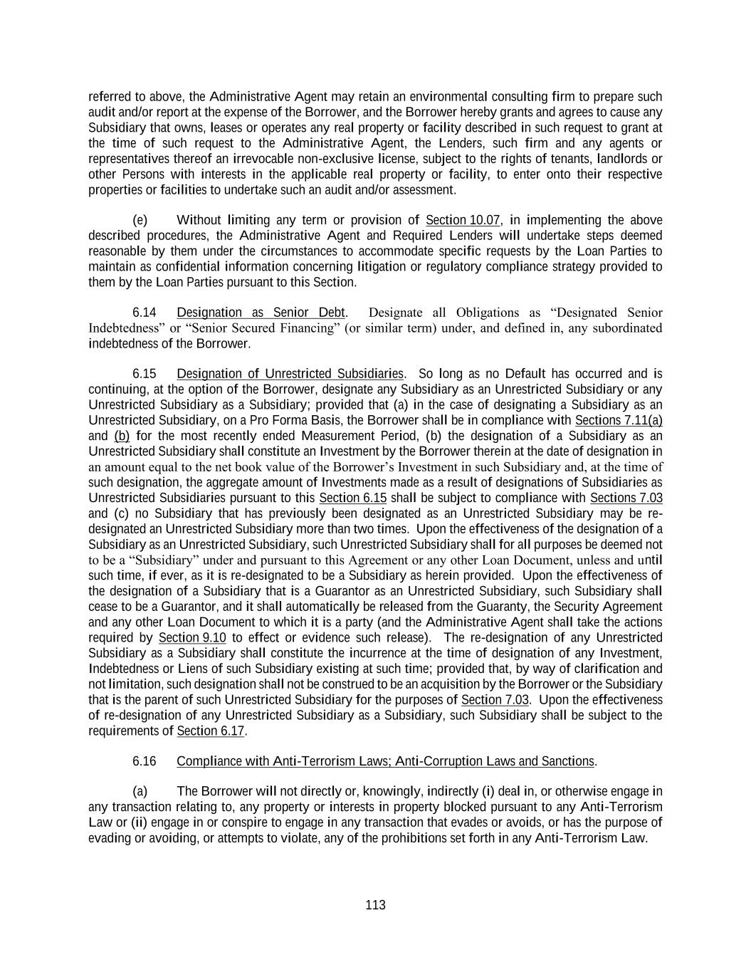 113如上文所述,行政代理人可聘请环境咨询公司编制此类审计和/或报告,费用由借款人承担,借款人特此授予并同意促使拥有、租赁或经营此类请求中描述的任何不动产或设施的任何子公司在提出此类请求时向行政代理人、贷款人、该公司及其任何代理人或代表授予不可撤销的非排他性许可,但须遵守承租人、房东或其他在适用的不动产或设施中拥有权益的人的权利,进入其各自的财产或设施进行此类审计和/或评估。(e)在不限制第10.07节的任何期限或规定的情况下,在执行上述程序时,行政代理人和所需贷款人将采取他们在这种情况下认为合理的步骤,以满足贷款方的具体要求,将贷款方根据本节向其提供的有关诉讼或监管合规战略的信息作为机密信息予以保存。6.14指定为优先债务。在借款人的任何次级债务下指定并在其中定义的所有义务为“指定优先债务”或“优先担保融资”(或类似术语)。6.15非限制性子公司的指定。只要未发生违约且仍在继续,借款人可选择指定任何子公司为非限制性子公司或任何非限制性子公司为子公司;但条件是(a)在指定子公司为非限制性子公司的情况下,在备考基础上,借款人应在最近结束的计量期内遵守第7.11(a)和(b)节,(b)指定附属公司为非受限制附属公司,应构成借款人在指定日期对该附属公司的投资,金额等于借款人对该附属公司的投资的账面净值,而在指定时,因根据本条第6.15款指定附属公司为非受限制附属公司而作出的投资总额,须遵守第7.03条和(c)条,以前被指定为非受限制附属公司的任何附属公司不得被重新指定为非受限制附属公司超过两次。在指定附属公司为非受限制附属公司生效后,就所有目的而言,该非受限制附属公司均应被视为不是根据本协议或任何其他贷款文件或根据本协议或任何其他贷款文件的“附属公司”,除非并直至其按本协议规定被重新指定为附属公司的时间(如有的话)。在将作为担保人的子公司指定为非限制性子公司生效后,该子公司应不再是担保人,并应自动解除其作为一方当事人的担保、担保协议和任何其他贷款文件(且行政代理人应采取第9.10节要求的行动以实现或证明此类解除)。将任何非受限制附属公司重新指定为附属公司,应构成在指定时该附属公司在该时间存在的任何投资、债务或留置权的发生;但通过澄清而非限制的方式,就第7.03节而言,该指定不应被解释为借款人或作为该非受限制附属公司的母公司的附属公司的收购。重新指定任何非限制性附属公司为附属公司生效后,该附属公司应遵守第6.17节的要求。6.16遵守反恐怖主义法律;反腐败法律和制裁。(a)借款人不会直接或在知情的情况下间接(i)从事或以其他方式从事与依据任何反恐怖主义法被封锁的任何财产或财产权益有关的任何交易,或(ii)从事或共谋从事任何规避或避免的交易,或具有规避或避免的目的,或企图违反任何反恐怖主义法中规定的任何禁令。