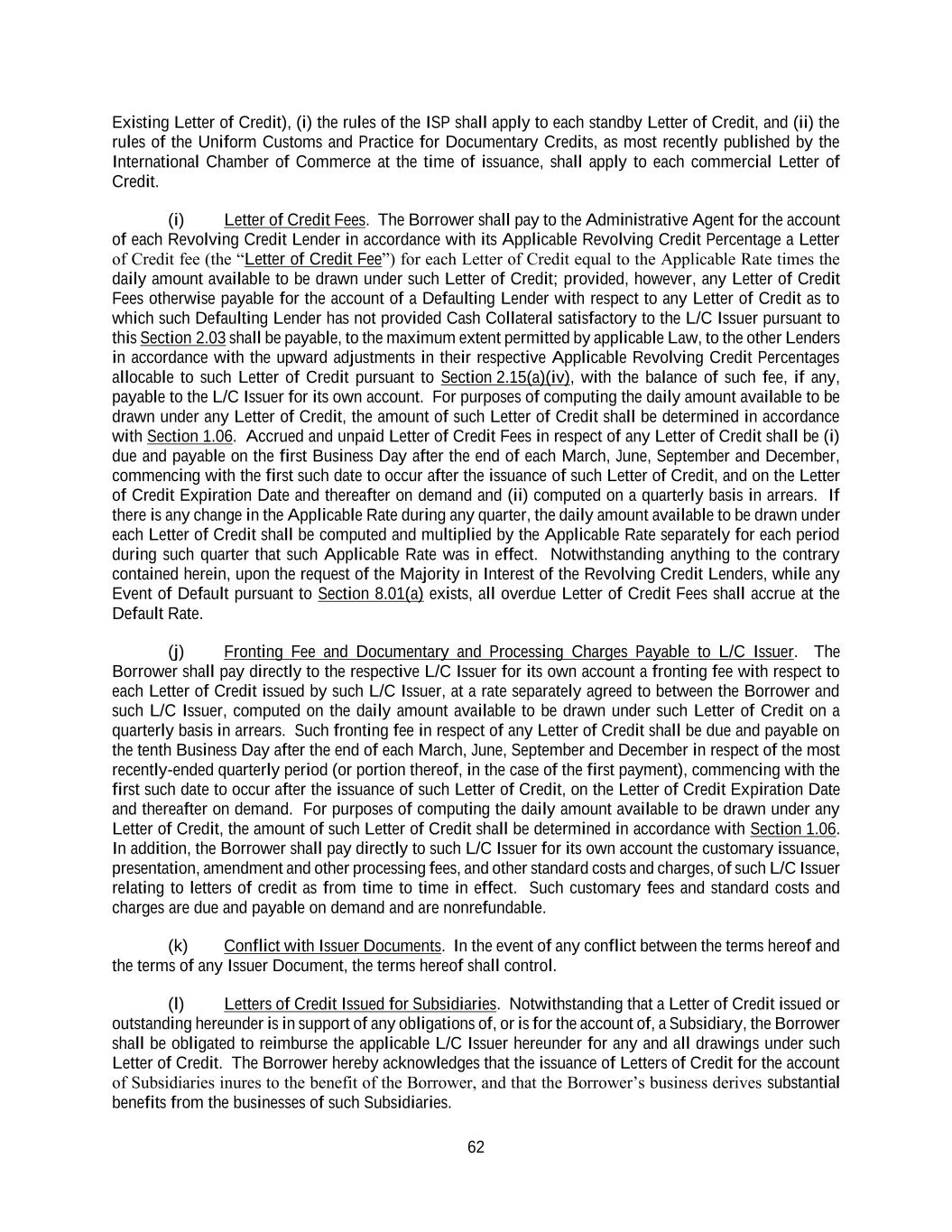 62现有信用证),(i)ISP的规则应适用于每一备用信用证,(ii)国际商会在签发时最近公布的跟单信用证统一惯例和惯例规则应适用于每一商业信用证。(i)信用证费用。借款人应按照其适用的循环信贷百分比向各循环信贷贷款人账户的行政代理人支付每份信用证的信用证费用(“信用证费用”),该费用等于适用利率乘以该信用证项下每日可提取金额;但前提是,违约贷款人未根据本条第2.03款就任何信用证提供令信用证发行人满意的现金抵押的任何信用证费用,应在适用法律允许的最大限度内,按照根据第2.15(a)(iv)款分配给该信用证的其他贷款人各自适用的循环信贷百分比的上调幅度,向其他贷款人支付,该等费用的余额(如有)应支付给信用证发行人为其自己的账户。为计算任何信用证项下可供提取的每日金额,该信用证的金额应根据第1.06节确定。任何信用证的应计未付信用证费用应(i)在每年3月、6月、9月和12月结束后的第一个营业日到期应付,自该信用证签发后发生的第一个该等日期开始,并在信用证到期日到期应付,其后按要求付款,以及(ii)按季度计算的欠款。如适用利率在任何季度有任何变动,则应分别计算每份信用证项下每日可供提取的金额,并乘以该适用利率生效的该季度内每一期间的适用利率。尽管有任何与此相反的规定,应循环信贷放款人的多数利益的请求,尽管存在根据第8.01(a)节发生的任何违约事件,所有逾期信用证费用应按违约率累计。(j)应支付给信用证发行人的前置费和跟单及处理费。对于该信用证开证人开具的每份信用证,借款人应按借款人与该信用证开证人另行议定的费率,按该信用证项下按季度拖欠的每日可提取金额计算,直接为其自己的账户向相应的信用证开证人支付垫付费用。有关任何信用证的该等铺面费须于每年3月、6月、9月及12月结束后的第十个营业日到期应付,有关最近一个季度期间(或其中一部分,如为首次付款),由该等信用证签发后发生的第一个该等日期开始,于信用证到期日及其后按要求支付。为计算任何信用证项下每日可供提取的金额,该信用证的金额应根据第1.06节确定。此外,借款人应为自己的账户直接向该信用证开证人支付该信用证开证人不时生效的与信用证有关的惯常开证、出示、修改等手续费用以及其他标准成本和收费。此类惯常费用和标准成本和收费到期应付,不可退还。(k)与签发人单证发生冲突。如果本协议的条款与任何发行人文件的条款发生任何冲突,则由本协议的条款控制。(l)为子公司开立的信用证。尽管根据本协议签发或未结清的信用证是为支持附属公司的任何义务或为附属公司的账户,借款人仍有义务就该信用证项下的任何和所有提款偿还本协议项下适用的信用证签发人。借款人在此确认,为子公司开立信用证有利于借款人,借款人的业务从该等子公司的业务中获得重大利益。