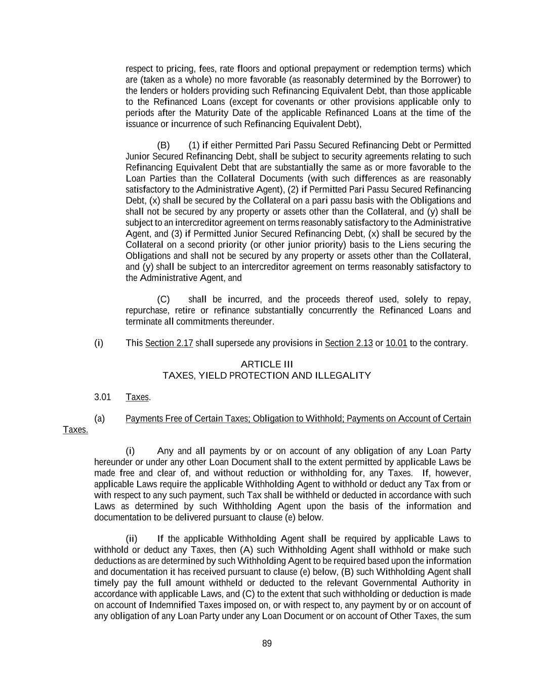89关于定价、费用、利率下限和可选的提前还款或赎回条款)(作为一个整体)对提供此类再融资等值债务的贷款人或持有人并不比适用于再融资贷款的条款更有利(由借款人合理确定)(但仅适用于在此类再融资等值债务发行或发生时适用的再融资贷款到期日之后的期间的契约或其他规定除外),(b)(1)如果允许的Pari Passu担保再融资债务或允许的初级担保再融资债务,应受制于与此种再融资等值债务有关的担保协议,这些担保协议实质上与担保书相同或比担保书对贷款方更有利(有行政代理人合理满意的差异),(2)如果允许的平价担保再融资债务,(x)应在与债务同等的基础上由担保物担保,不得以担保物以外的任何财产或资产作担保,并且(y)应受制于以行政代理人合理满意的条款的债权人间协议,(3)如获准许的初级担保再融资债务,(x)须由抵押品以第二优先权(或其他次级优先权)为担保债务的留置权作担保,且不得以抵押品以外的任何财产或资产作担保,及(y)须按行政代理人合理满意的条款受债权人间协议所规限,及(c)须承担,而其所得款项须仅用于偿还、回购、退还或再融资实质上同时进行的再融资贷款,并终止根据该等条款作出的所有承诺。(i)本条第2.17条须取代第2.13或10.01条的任何相反条文。第三条征税、产量保护和非法性3.01征税。(a)免收某些税款的付款;扣留的义务;因某些税款而付款。(i)任何贷款方根据本协议或根据任何其他贷款文件所承担的任何义务所支付的任何和所有款项,均应在适用法律允许的范围内免交和免除任何税款,且不得减免或预扣任何税款。但是,如果适用的法律要求适用的扣缴义务人从任何此类付款中扣缴或扣除任何税款,则应根据该扣缴义务人根据根据根据下文(e)条交付的信息和文件确定的法律扣缴或扣除此类税款。(ii)如适用法律规定适用的扣缴义务人须代扣或扣除任何税款,则(a)该扣缴义务人须根据其根据下文(e)条所收到的资料及文件,代扣或作出该扣缴义务人所确定须作出的扣除,(b)该扣缴义务人须按适用法律规定,将代扣或扣除的全部款项及时支付予有关政府当局,及(c)在该等代扣或扣除是因所征收的弥偿税款而作出的范围内,或就任何贷款方根据任何贷款文件或因其他税项而承担的任何义务而作出或因该项义务而作出的任何付款而言,总额