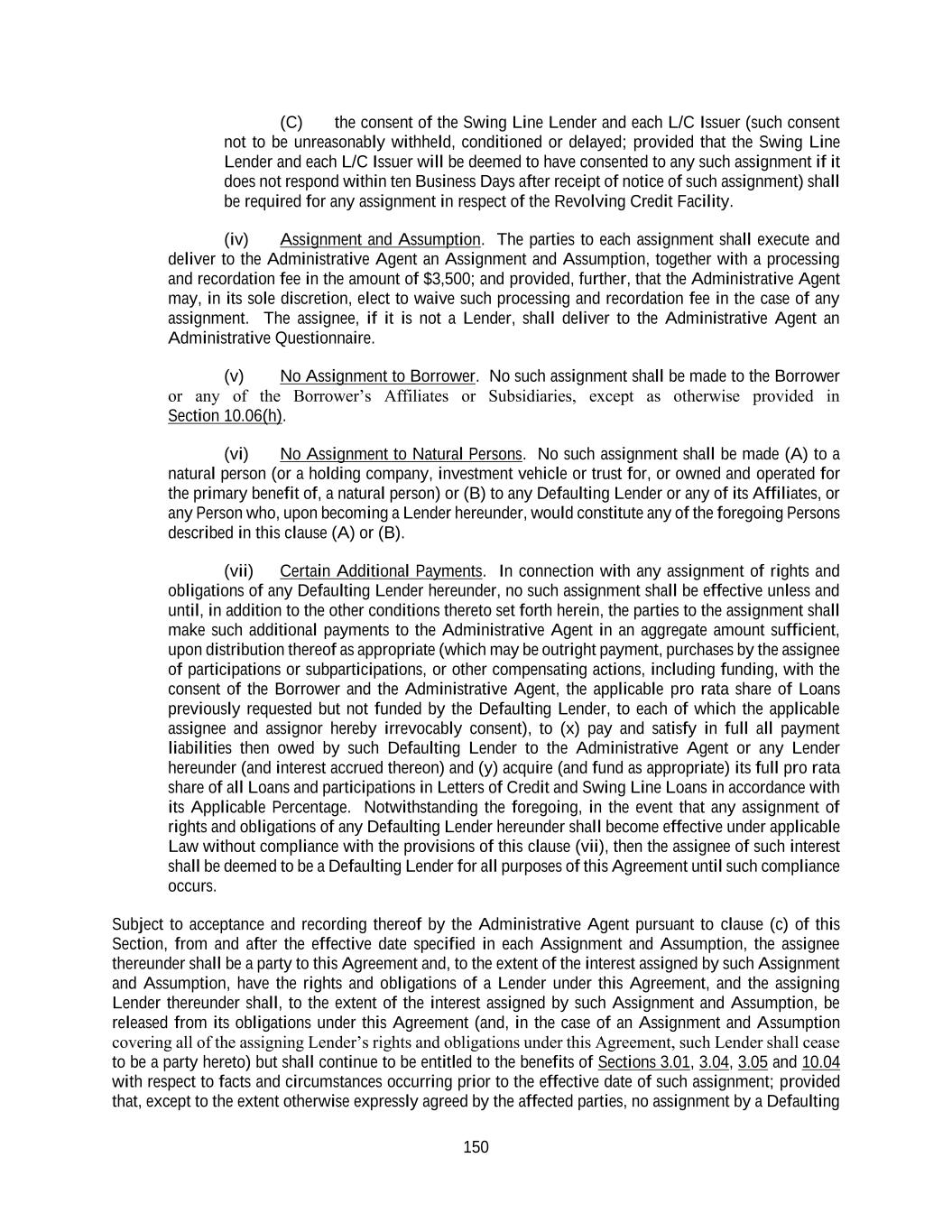 150(c)有关循环信贷融资的任何转让须取得周转额度贷款人及每名信用证发行人的同意(该等同意不得被无理拒绝、附加条件或延迟;但如周转额度贷款人及每名信用证发行人在收到有关转让的通知后十个营业日内未作出回应,则该等同意将被视为已同意任何该等转让)。(四)转让和假设。每项转让的当事人应签署并向行政代理人交付一项转让和假设,以及金额为3500美元的处理和记录费;此外,条件是行政代理人可自行决定在任何转让的情况下选择免除此类处理和记录费。受让人不是出借人的,应当向行政代理人交付行政调查问卷。(五)不转让给借款人。除非第10.06(h)条另有规定,否则不得向借款人或借款人的任何附属公司或附属公司作出此种转让。(vi)不转让给自然人。不得(a)向自然人(或为自然人的控股公司、投资工具或信托,或为自然人的主要利益而拥有和经营)或(b)向任何违约贷款人或其任何关联公司,或在根据本协议成为贷款人时将构成本(a)或(b)条所述任何前述人员的任何人作出此种转让。(vii)某些额外付款。就任何违约贷款人在本协议项下的任何权利和义务的转让而言,任何此种转让均不具有效力,除非和直至除本协议所载的其他条件外,转让各方应在酌情分配时向行政代理人支付总额足够的额外款项(可能是彻底付款、受让人购买参与或次级参与,或经借款人和行政代理人同意的其他补偿行动,包括资助,适用的受让人和转让人特此不可撤销地同意向每一方提供的先前请求但未由违约贷款人提供资金的贷款的适用比例份额),以(x)支付并全额偿付该违约贷款人当时欠行政代理人或本协议项下任何贷款人的所有付款责任(以及由此产生的利息),以及(y)按照其适用的百分比获得(并酌情提供资金)其在所有贷款和参与信用证和周转额度贷款中的全部按比例份额。尽管有上述规定,如果任何违约贷款人在本协议项下的任何权利和义务的转让应根据适用法律生效而不遵守本条款(vii)的规定,则就本协议的所有目的而言,该权益的受让人应被视为违约贷款人,直至此种遵守发生。在行政代理人依据本条(c)款接受并记录的情况下,自每项转让和承担规定的生效日期起及之后,根据该转让和承担的受让人应为本协议的当事人,并在该转让和承担所转让的利益范围内,享有贷款人在本协议项下的权利和义务,根据该转让和承担所转让的利益范围内,转让贷款人应解除其在本协议项下的义务(并且,在转让和假设涵盖转让贷款人在本协议下的所有权利和义务的情况下,该贷款人应不再是本协议的一方),但应继续有权就该转让生效日期之前发生的事实和情况享有第3.01、3.04、3.05和10.04条的利益;但除非受影响的各方另有明确约定,否则不会因违约而转让