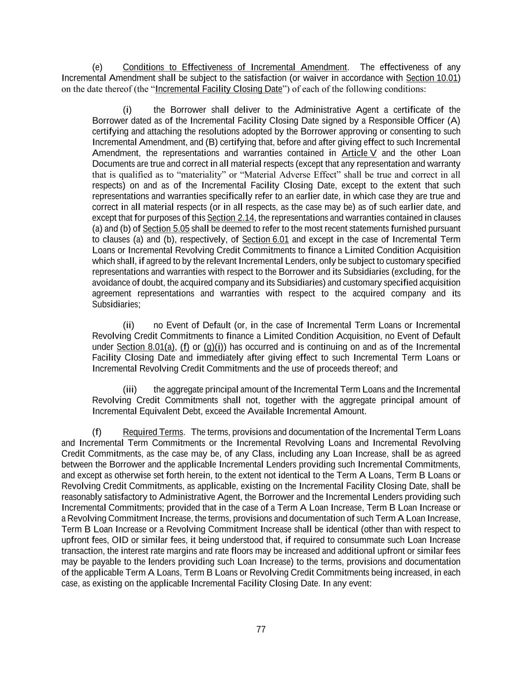 77(e)增量修正的生效条件。任何增量修正的有效性须在其日期(“增量融资截止日”)满足(或根据第10.01条放弃)以下各项条件:(i)借款人应向行政代理人交付一份由负责官员签署的日期为增量融资截止日的借款人证明(a)证明并附上借款人通过的批准或同意该增量修正的决议,以及(b)证明在该增量修正生效前后,第五条和其他贷款文件所载的陈述和保证在所有重大方面都是真实和正确的(但任何对“重要性”或“重大不利影响”有限定的陈述和保证在所有方面都是真实和正确的除外),在增量融资结束日期和截至该日期,但此类陈述和保证特指较早日期的情况除外,在这种情况下,它们在所有重大方面(或在所有方面,视情况而定)都是真实和正确的,及除为施行本条第2.14条外,第5.05条(a)及(b)条所载的陈述及保证须当作是指分别根据第6.01条(a)及(b)条所提供的最近的报表,但为资助有限条件收购而提供的增量定期贷款或增量循环信贷承诺的情况除外,如有关增量放款人同意,则只须遵守有关借款人及其附属公司的惯常指明的陈述及保证(为免生疑问,不包括被收购公司及其子公司)以及关于被收购公司及其子公司的惯常规定的收购协议陈述和保证;(ii)没有发生违约事件(或者,在为有限条件收购提供资金的增量定期贷款或增量循环信贷承诺的情况下,没有发生第8.01(a)条规定的违约事件,(f)或(g)(i))在增量融资结束日期当日及截至当日,并在紧接该等增量定期贷款或增量循环信贷承诺及其收益使用生效后发生并持续进行;及(iii)增量定期贷款及增量循环信贷承诺的本金总额,连同增量等值债务的本金总额,不得超过可用的增量金额。(f)所需条款。任何类别的增量定期贷款和增量定期承诺或增量循环贷款和增量循环信贷承诺(视情况而定)的条款、规定和文件,包括任何贷款增量,均应按照借款人与提供该等增量承诺的适用增量贷款人之间的约定,除本文另有规定外,在与增量融资截止日存在的A期贷款、B期贷款或循环信贷承诺(如适用)不相同的范围内,应使行政代理人合理满意,借款人和提供该等增量承诺的增量贷款人;条件是,在A期贷款增加、B期贷款增加或循环承诺增加的情况下,该A期贷款增加、B期贷款增加或循环承诺增加的条款、规定和文件应相同(除预付费用、OID或类似费用外,据了解,如果需要完成该等贷款增加交易,利率差额和利率下限可能会增加,并且可能会向提供此类贷款增加的贷方支付额外的预付款或类似费用),以适用的A期贷款、B期贷款或正在增加的循环信贷承诺的条款、规定和文件为准,在每种情况下,如适用的增量融资截止日存在的那样。无论如何: