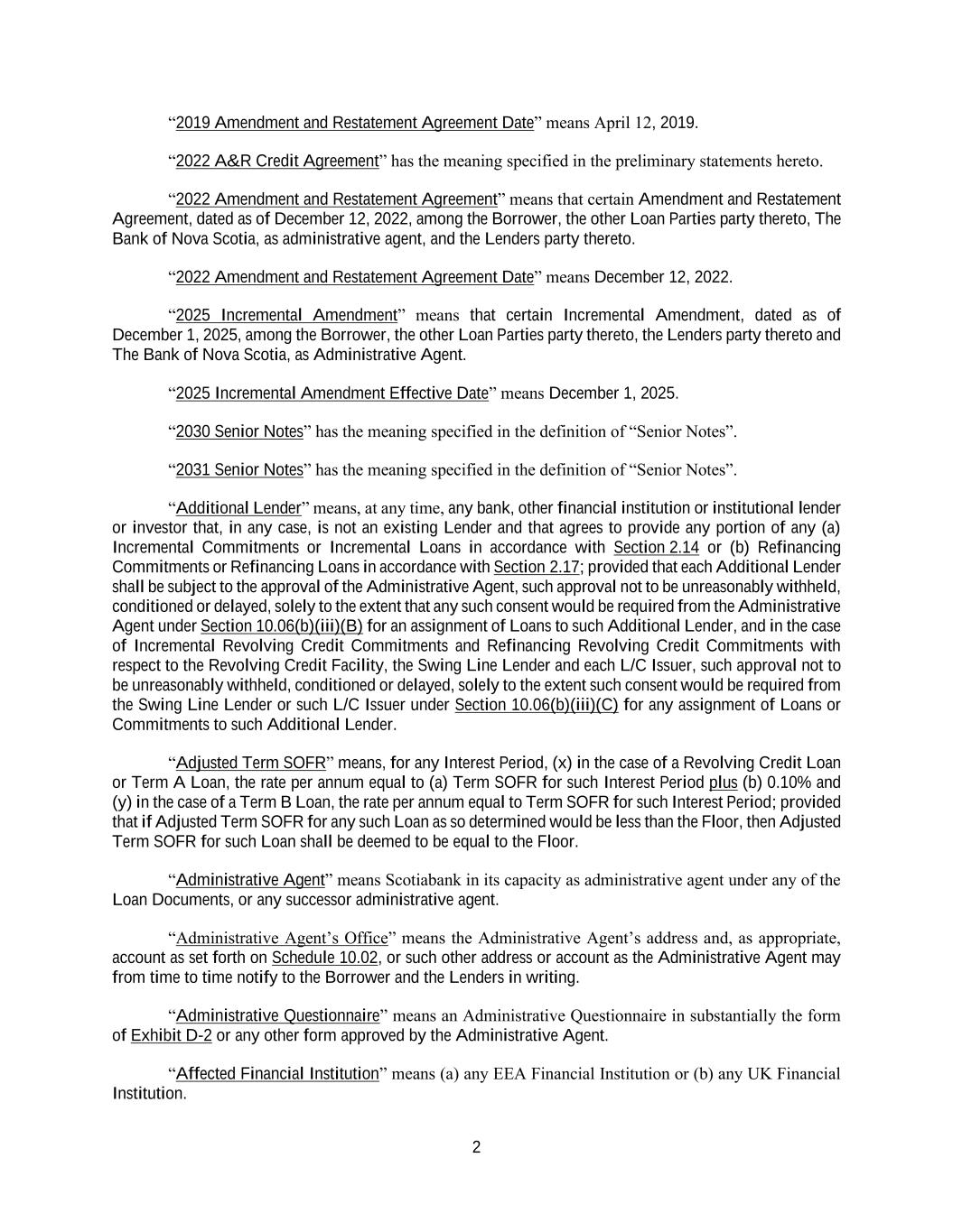 2“2019年修订及重述协议日期”指2019年4月12日。“2022 A & R信贷协议”具有本协议初步声明中规定的含义。“2022年修订和重述协议”是指借款人、其其他贷款方、作为行政代理人的新斯科舍银行及其贷款方于2022年12月12日签署的某些修订和重述协议。“2022年修订及重述协议日期”指2022年12月12日。“2025年增量修正”是指某些增量修正,日期为2025年12月1日,由借款人、其他贷款方、贷款方和新斯科舍银行作为行政代理人。“2025年增量修正生效日期”是指2025年12月1日。“2030优先票据”具有“优先票据”定义中规定的含义。“2031年优先票据”具有“优先票据”定义中规定的含义。“额外贷款人”是指在任何时候,任何银行、其他金融机构或机构贷款人或投资者,在任何情况下都不是现有贷款人,并且同意根据第2.14条提供任何(a)增量承诺或增量贷款的任何部分,或(b)根据第2.17条提供再融资承诺或再融资贷款;但每个额外贷款人须经行政代理人批准,该批准不得无理拒绝、附加条件或延迟,仅在根据第10.06(b)(iii)(b)节向该额外贷款人转让贷款需要行政代理人的任何此类同意的情况下,以及在就循环信贷融资、周转额度贷款人和每个信用证发行人而言的增量循环信贷承诺和再融资循环信贷承诺的情况下,不得不合理地拒绝、附加条件或延迟此类批准,仅在根据第10.06(b)(iii)(c)节向该额外贷款人转让贷款或承诺需要周转额度贷款人或该信用证发行人的此类同意的情况下。“调整后的期限SOFR”是指,就任何计息期而言,(x)在循环信用贷款或A期贷款的情况下,年利率等于(a)该计息期的期限SOFR加上(b)0.10%和(y)在B期贷款的情况下,年利率等于该计息期的期限SOFR;但如果如此确定的任何此类贷款的调整后期限SOFR将低于下限,则该贷款的调整后期限SOFR应被视为等于下限。“行政代理人”是指丰业银行以其作为任何贷款文件下的行政代理人的身份,或任何继任行政代理人。「行政代理人办事处」指附表10.02所列的行政代理人的地址及(视乎情况而定的帐户,或行政代理人可能不时以书面通知借款人及贷款人的其他地址或帐户。“行政调查问卷”是指实质上为附件 D-2或行政代理人认可的任何其他形式的行政调查问卷。“受影响金融机构”是指(a)任何欧洲经济区金融机构或(b)任何英国金融机构。