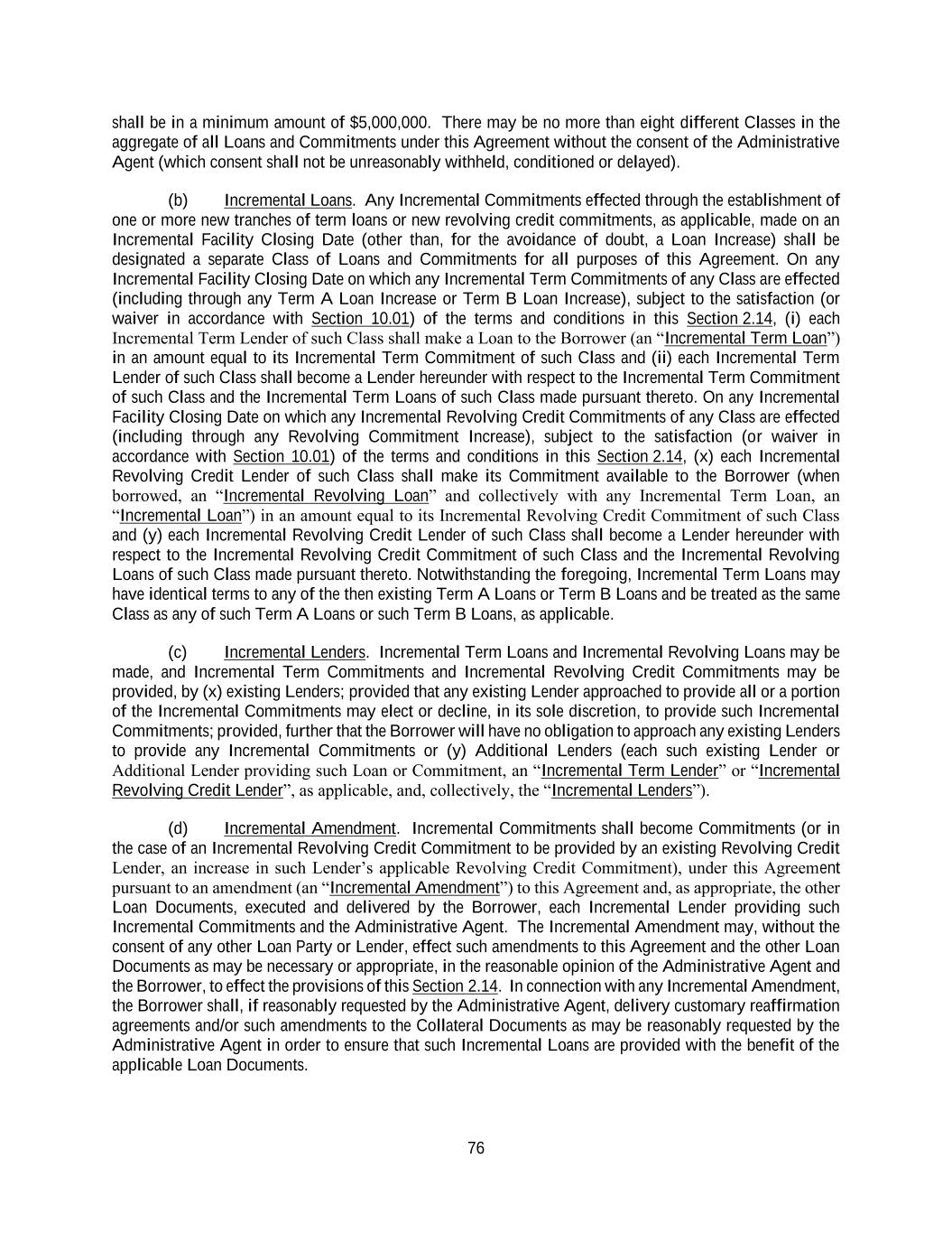76.最低数额应为5000000美元。未经行政代理人同意,本协议项下的所有贷款和承诺合计不得超过八个不同类别(不得无理拒绝、附加条件或延迟同意)。(b)增量贷款。通过设立一笔或多笔新的定期贷款或在增量融资截止日期作出的新的循环信贷承诺(如适用)而作出的任何增量承诺(为免生疑问,贷款增加除外),应为本协议的所有目的指定一个单独类别的贷款和承诺。在任何类别的任何增量期限承诺生效的任何增量融资截止日期(包括通过任何期限A贷款增加或期限B贷款增加),但须符合(或根据第10.01条豁免)本条第2.14条的条款及条件,(i)该类别的每名增量定期贷款人须向借款人作出贷款(“增量定期贷款”),金额相当于其该类别的增量定期承诺;及(ii)该类别的每名增量定期贷款人须就该类别的增量定期承诺及据此作出的该类别的增量定期贷款成为本协议项下的贷款人。在任何类别的任何增量循环信贷承诺生效的任何增量融资结束日(包括通过任何循环承诺增加),但须满足(或根据第10.01条放弃)本条第2.14款中的条款和条件,(x)该类别的每个增量循环信贷贷款人应向借款人提供其承诺(在借入时,为“增量循环贷款”,并与任何增量定期贷款一起,“增量贷款”)的金额等于其该类别的增量循环信贷承诺和(y)该类别的每个增量循环信贷贷款人应成为该类别的增量循环信贷承诺以及根据该类别作出的增量循环贷款的贷款人。尽管有上述规定,增量定期贷款可能与当时存在的任何A期贷款或B期贷款具有相同的条款,并被视为与任何此类A期贷款或此类B期贷款(如适用)相同的类别。(c)增量放款人。可由(x)现有贷款人提供增量定期贷款和增量循环贷款,并可提供增量定期承诺和增量循环信贷承诺;但任何接洽提供全部或部分增量承诺的现有贷款人可自行决定选择或拒绝提供此类增量承诺;但此外,借款人将没有义务与任何现有贷款人接洽以提供任何增量承诺或(y)额外贷款人(每个此类现有贷款人或提供此类贷款或承诺的额外贷款人,“增量定期贷款人”或“增量循环信贷贷款人”(如适用),统称为“增量贷款人”)。(d)增量修正。增量承诺应成为承诺(或在现有循环信贷贷款人将提供的增量循环信贷承诺的情况下,增加该贷款人适用的循环信贷承诺),根据本协议根据对本协议的修订(“增量修订”)以及酌情由借款人、提供此类增量承诺的每个增量贷款人和行政代理人签署和交付的其他贷款文件。增量修正可在不征得任何其他贷款方或贷款人同意的情况下,对本协议和其他贷款文件进行行政代理人和借款人合理认为必要或适当的修正,以实现本条第2.14款的规定。就任何增量修改而言,借款人应在行政代理人合理要求的情况下交付惯常重申协议和/或行政代理人可能合理要求的对抵押文件的修改,以确保提供此类增量贷款受益于适用的贷款文件。