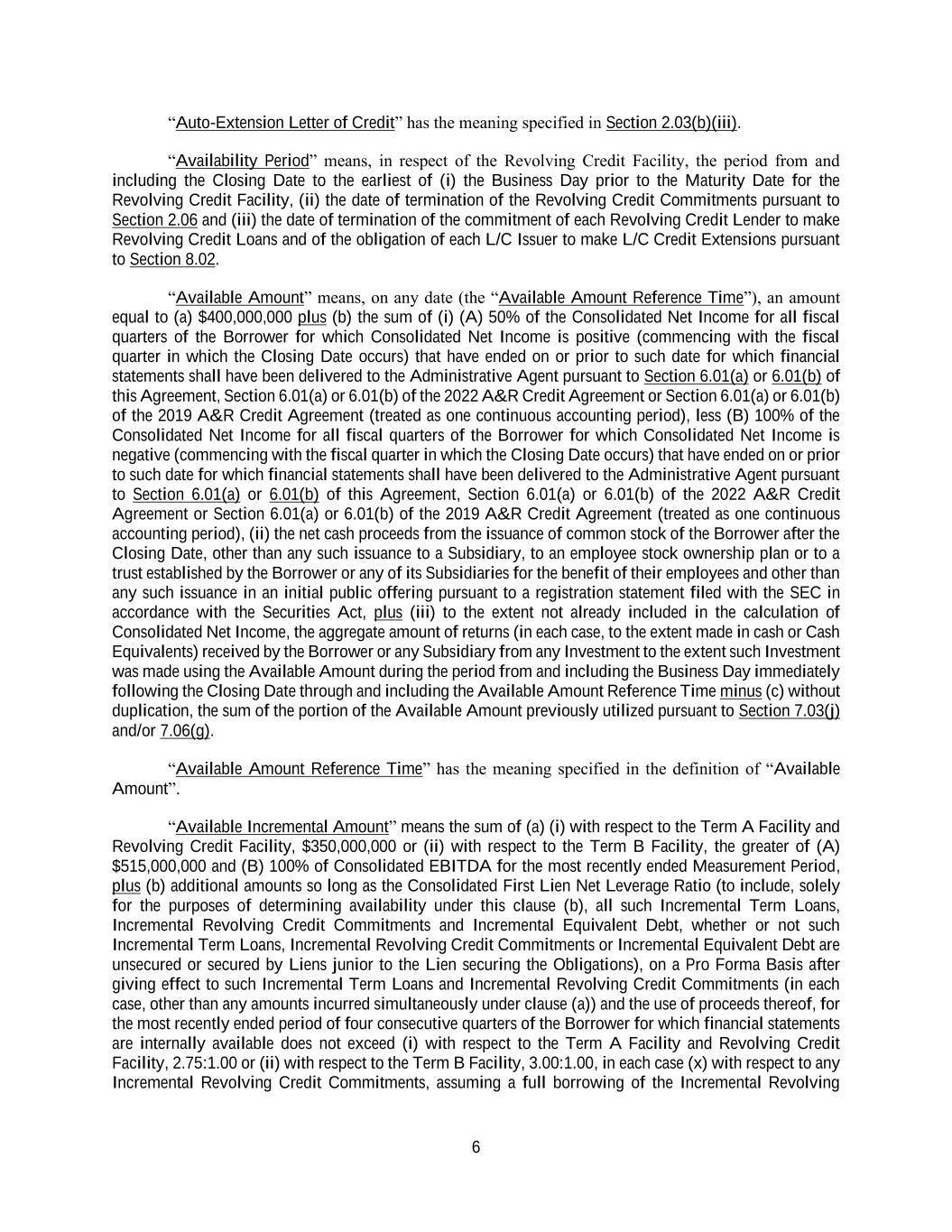6“自动延期信用证”具有第2.03(b)(iii)节规定的含义。就循环信贷融资而言,“可用期”指自(包括)截止日起至(i)循环信贷融资到期日前一个营业日、(ii)根据第2.06条终止循环信贷承诺的日期和(iii)每个循环信贷贷款人作出循环信贷贷款的承诺和每个信用证发行人根据第8.02条作出信用证信贷展期的义务的终止日期中最早的期间。“可用金额”是指,在任何日期(“可用金额参考时间”),金额等于(a)400,000,000美元加上(b)(i)(a)合并净收益为正的借款人的所有财政季度(从结账日期发生的财政季度开始)的合并净收益的50%之和,这些财务报表应在根据本协议第6.01(a)或6.01(b)节交付给行政代理人的该日期或之前结束,2022年A & R信贷协议第6.01(a)节或6.01(b)节或2019年A & R信贷协议第6.01(a)节或6.01(b)节(作为一个连续会计期间处理),减去(b)在根据本协议第6.01(a)节或6.01(b)节向行政代理人交付财务报表之日或之前已结束的借款人合并净收益为负值的所有财政季度(从发生结算日期的财政季度开始)的合并净收益的100%,2022年A & R信贷协议第6.01(a)或6.01(b)节或2019年A & R信贷协议第6.01(a)或6.01(b)节(被视为一个连续会计期间),(ii)截止日期后借款人发行普通股的现金净收益,但向子公司发行的任何此类收益除外,根据《证券法》向SEC提交的登记声明,向员工持股计划或借款人或其任何子公司为其员工利益设立的信托以及首次公开发行中的任何此类发行除外,加上(iii)在尚未包括在合并净收益计算中的范围内,总回报金额(在每种情况下,借款人或任何附属公司从任何投资收到的以现金或现金等价物为限),但该等投资是使用从紧接截止日期之后的营业日(含)至可用金额参考时间期间的可用金额减去(c)(不重复)之前根据第7.03(j)和/或7.06(g)节使用的可用金额部分之和进行的。“可用量参考时间”具有“可用量”定义中规定的含义。“可用增量金额”是指(a)(i)就A期融资和循环信贷融资而言,350,000,000美元或(ii)就B期融资而言,(a)515,000,000美元和(b)最近结束的计量期间合并EBITDA的100%中的较高者,加上(b)额外金额,只要合并第一留置权净杠杆比率(仅为确定本条款(b)项下的可用性,包括所有此类增量定期贷款、增量循环信贷承诺和增量等值债务,无论是否此类增量定期贷款,增量循环信贷承诺或增量等值债务是无担保的,或由低于为债务提供担保的留置权的留置权作担保),在此类增量定期贷款和增量循环信贷承诺(在每种情况下,除了根据(a)条同时发生的任何金额)及其收益使用生效后,在内部可获得财务报表的借款人最近结束的连续四个季度期间,就期限A融资和循环信贷融资而言,不超过(i),2.75:1.00或(ii)就B期融资而言,3.00:1.00,在每种情况下(x)就任何增量循环信贷承诺而言,假设增量循环的全部借款