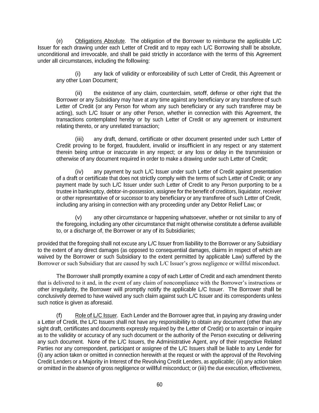 60(e)绝对义务。借款人就每笔信用证项下的每笔提款向适用的信用证开证人偿付和偿还每笔信用证借款的义务应是绝对的、无条件的和不可撤销的,并应在任何情况下严格按照本协议的条款偿付,包括:(i)该信用证、本协议或任何其他贷款文件的任何缺乏有效性或可执行性;(ii)存在任何索赔、反索赔、抵销,借款人或任何附属公司在任何时候针对该信用证的任何受益人或任何受让人(或任何该等受益人或任何该等受让人可能为其行事的任何人)、该信用证发行人或任何其他人可能拥有的抗辩或其他权利,无论是否与本协议、特此设想的交易或该信用证或与此有关的任何协议或文书有关的交易,或任何不相关的交易有关;(iii)根据该信用证出示的任何汇票、要求单、凭证或其他单证证明为伪造、欺诈,在任何方面无效或不足,或其中的任何陈述在任何方面不真实或不准确;或根据该信用证提款所需的任何文件的传送或其他方面的任何遗失或延迟;(iv)该信用证发行人根据该信用证提出的汇票或凭证的任何付款,而该汇票或凭证并不严格遵守该信用证的条款;或该信用证发行人根据该信用证向任何看来是破产受托人、债务人占有人的人作出的任何付款,为债权人、清算人、接管人或该信用证的任何受益人或任何受让人的其他代表或继承人的利益而设的受让人,包括与任何债务人救济法下的任何程序有关的任何产生;或(v)任何其他情况或发生的任何情况,不论是否与上述任何情况相似,包括任何其他可能构成可供抗辩或解除的任何其他情况,借款人或其任何附属公司;但前述规定不得免除任何信用证发行人对借款人或该附属公司因该信用证发行人的重大过失或故意不当行为而导致的借款人或该附属公司遭受的任何直接损害(而不是后果性损害,借款人或该附属公司在适用法律允许的范围内放弃对其提出的索赔)的赔偿责任。借款人应当及时查验交付给其的每一份信用证及其每一次修改的副本,如发生不遵守借款人指示或其他不规范的索赔,借款人将及时通知适用的信用证开证人。借款人应被最终视为已放弃对该信用证发行人及其通讯员的任何该等债权,除非按上述方式发出该通知。(f)信用证发行人的作用。各贷款人和借款人同意,在支付信用证项下的任何提款时,信用证发行人不承担任何责任获取任何单证(信用证明确要求的任何即期汇票、凭证和单证除外)或确定或查询任何此类单证的有效性或准确性或执行或交付任何此类单证的人的权限。任何信用证发行人、行政代理人、其各自的任何关联方或信用证发行人的任何代理人、参与人或受让人,均不对任何贷款人承担责任:(i)应请求或经循环信贷贷款人或循环信贷贷款人的多数利益(如适用)批准而在此采取或不采取的任何行动;(ii)在没有重大过失或故意不当行为的情况下采取或不采取的任何行动;或(iii)应有的执行、效力,