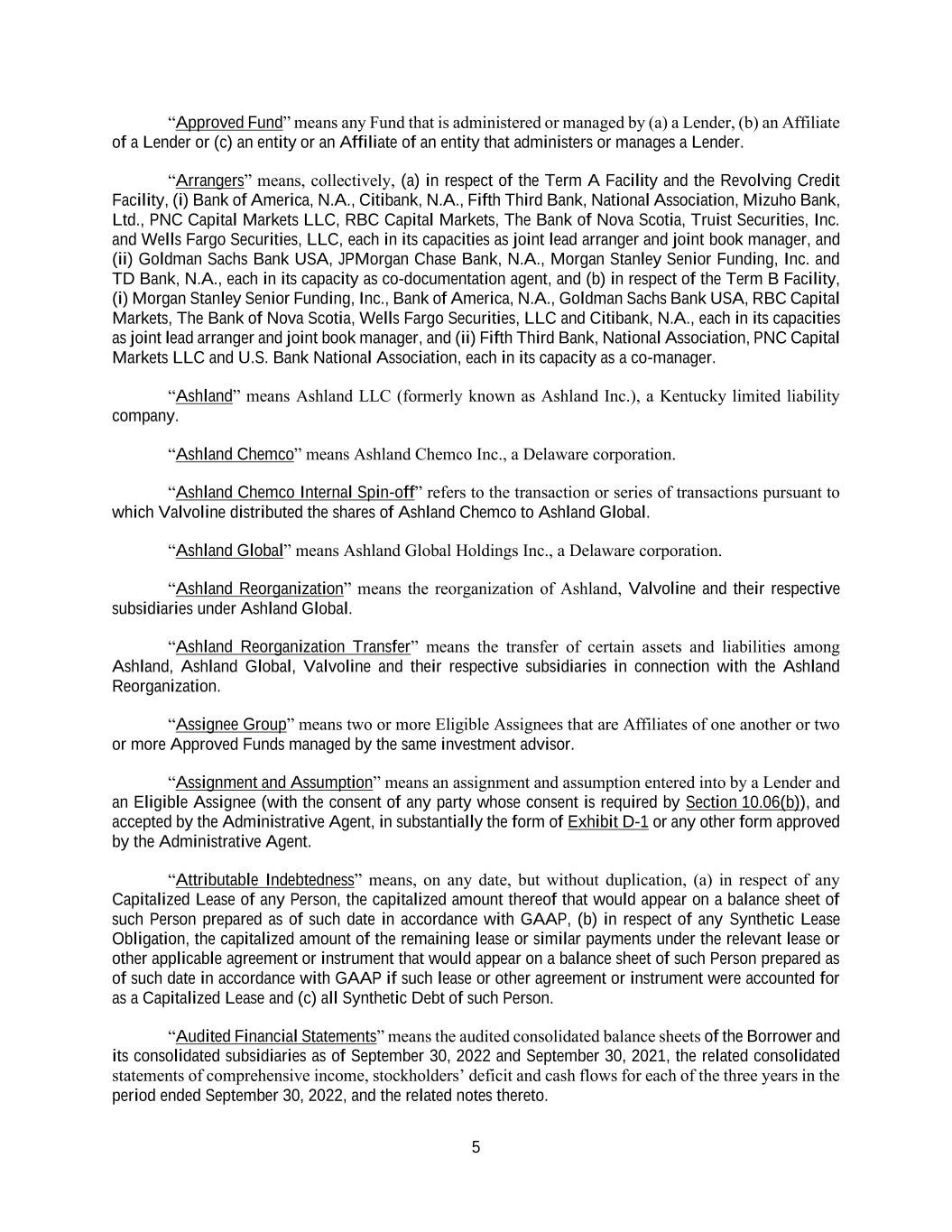 5“认可基金”是指由(a)贷款人、(b)贷款人的关联公司或(c)管理或管理贷款人的实体或实体的关联公司管理或管理的任何基金。“安排人”统称为(a)就A期融资和循环信贷融资而言,(i)美国银行、花旗银行、N.A.、五三银行银行、全国协会、瑞穗银行、PNC Capital Markets LLC、加拿大皇家银行资本市场、加拿大丰业银行、Truist Securities,Inc.和富国银行 Securities,LLC,各自以联席牵头安排人和联席账簿管理人的身份,以及(ii)高盛 Sachs Bank USA、摩根大通 Bank,N.A.、摩根士丹利 Senior Funding,Inc.和TD Bank,N.A.,各自以共同文件代理的身份,以及(b)就B期融资而言,(i)摩根士丹利 Senior Funding,Inc.、Bank of America,N.A.、高盛 Sachs Bank USA、RBC Capital Markets、新斯科舍银行、富国银行 Securities,LLC和Citibank,N.A.各自以联席牵头安排人和联席账簿管理人的身份,以及(ii)五三银行银行、National Association、PNC Capital Markets LLC和U.S. Bank National Association,各自以联席管理人的身份。“亚什兰”是指亚什兰有限责任公司(Ashland LLC,原名亚什兰公司),是一家肯塔基州有限责任公司。“亚什兰化工”是指亚什兰化工公司,一家特拉华州公司。“亚什兰化工内部分拆”是指Valvoline向亚什兰分配亚什兰化工股份所依据的交易或系列交易。“亚什兰”意为美属特拉华州的公司Ashland Global Holdings Inc.。“亚什兰重组”是指亚什兰、胜牌生物及其各自所属亚什兰下属子公司的重组事项。“亚什兰重组转让”指亚什兰、亚什兰、胜牌生物及其各自的附属公司之间就亚什兰重组进行的部分资产和负债的转让。“受让人集团”是指两个或多个符合条件的受让人,他们是彼此的关联公司或同一投资顾问管理的两个或多个经批准的基金。“转让和承担”是指由贷款人和合格受让人(经第10.06(b)节要求其同意的任何一方同意)订立并由行政代理人接受的转让和承担,其实质形式为附件 D-1或行政代理人批准的任何其他形式。“应占债务”是指,在任何日期,但不重复,(a)就任何人的任何资本化租赁而言,将出现在该人根据公认会计原则编制的截至该日期的资产负债表上的资本化金额,(b)就任何合成租赁义务而言,如果该租赁或其他协议或文书作为资本化租赁和(c)该人的所有合成债务入账,则在该日期根据公认会计原则编制的该人的资产负债表上将出现的相关租赁或其他适用协议或文书下的剩余租赁或类似付款的资本化金额。「经审核财务报表」指借款人及其合并附属公司截至2022年9月30日及2021年9月30日的经审核综合资产负债表、截至2022年9月30日止三个年度的相关综合全面收益表、股东赤字及现金流量表及其相关附注。