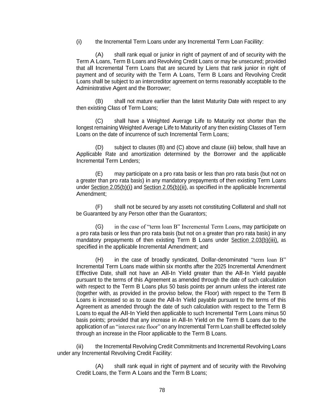 78(i)任何增量定期贷款融资项下的增量定期贷款:(a)应与A期贷款、B期贷款和循环信用贷款在受偿权和担保权上处于同等或较低的地位,或可能无担保;但所有以受偿权和担保权与A期贷款处于较低地位的留置权作担保的增量定期贷款,B期贷款和循环信用贷款应以行政代理人和借款人合理接受的条款受债权人间协议的约束;(b)不得早于任何当时存在的类别定期贷款的最近到期日到期;(c)的加权平均到期期限不短于任何当时存在的类别定期贷款在该等增量定期贷款发生之日的最长剩余加权平均到期期限;(d)在符合上述(b)和(c)条以及下文第(iii)条的情况下,应具有由借款人和适用的增量定期贷款人确定的适用利率和摊销;(e)可按比例或低于比例(但不得高于比例)参与根据适用的增量修订规定的第2.05(b)(i)节和第2.05(b)(ii)节对当时现有定期贷款的任何强制性提前还款;(f)不得以不构成抵押品的任何资产作担保,且不得由担保人以外的任何人提供担保;(g)在“定期贷款B”增量定期贷款的情况下,可按适用的增量修正规定,按比例或低于比例(但不得高于比例)参与根据第2.03(b)(iii)节对当时存在的B期贷款的任何强制性提前还款;以及(h)在2025年增量修正生效日期后六个月内提供的广泛银团、美元计价的“定期贷款B”增量定期贷款的情况下,在B期贷款的计算日期之前,其全部收益率不得高于根据经修订的本协议条款应付的全部收益率加上每年50个基点,除非利率(连同以下但书中规定的,B期贷款的下限)增加,以使根据经修订的本协议条款在B期贷款的计算日期之前应付的全部收益率等于当时适用于此类增量定期贷款的全部收益率减去50个基点;但由于对任何增量定期贷款适用“利率下限”而导致的B期贷款的全部收益率增加,应仅通过提高适用于B期贷款的下限来实现。(二)任何增量循环信贷融资项下的增量循环信贷承诺和增量循环贷款:(a)应与循环信贷贷款、A期贷款和B期贷款享有同等受付权和担保权;