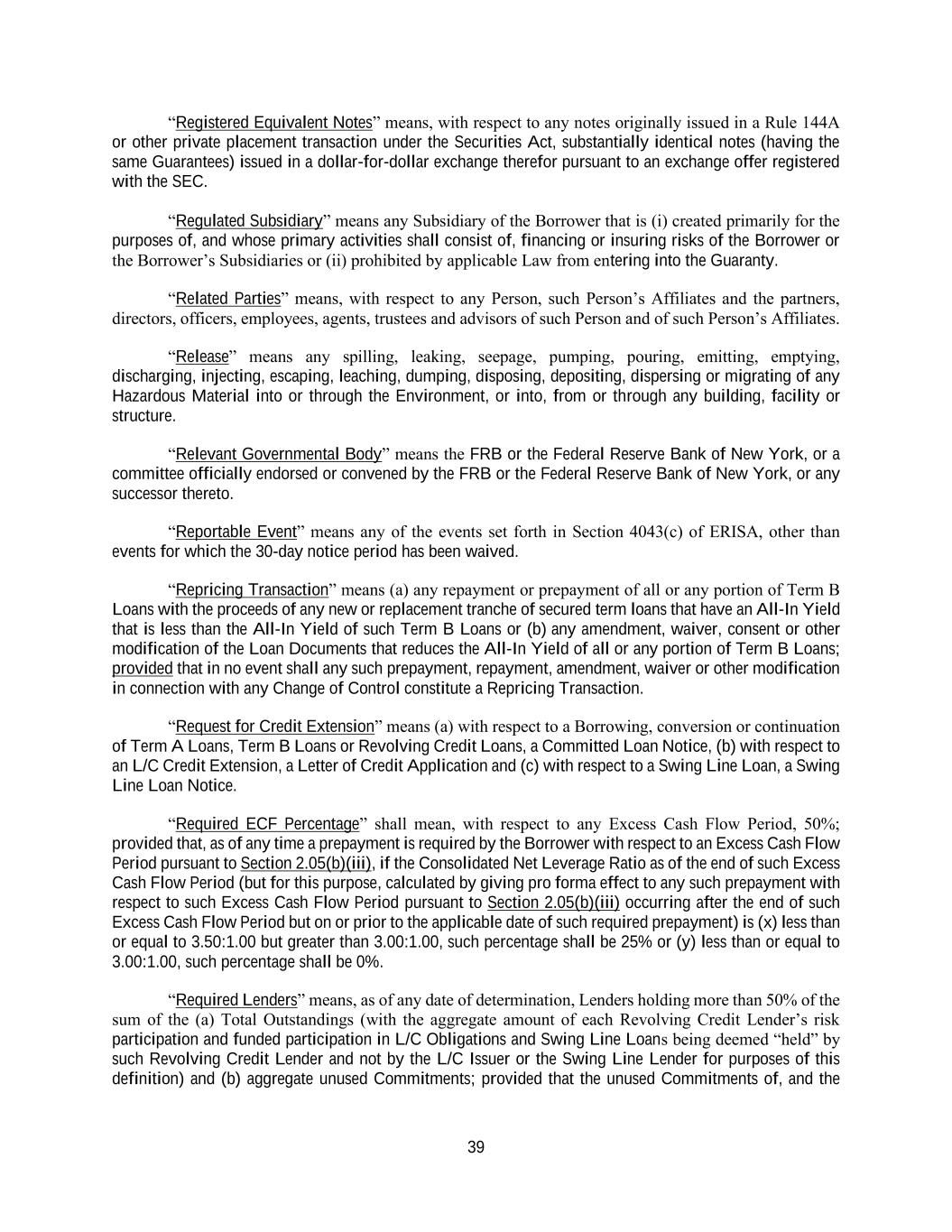 39“注册等值票据”是指,就根据《证券法》在规则144A或其他私募交易中最初发行的任何票据而言,根据在SEC注册的交换要约,以美元兑换美元的方式发行的基本相同的票据(具有相同的担保)。“受监管的子公司”是指借款人的任何子公司,其主要活动应包括为借款人或借款人子公司的风险提供融资或保险,或(ii)适用法律禁止订立担保。“关联方”是指,就任何人而言,该人的关联公司以及该人和该人关联公司的合伙人、董事、高级职员、雇员、代理人、受托人和顾问。“释放”是指任何有害物质进入或通过环境,或进入、离开或通过任何建筑物、设施或构筑物的任何溢出、泄漏、渗漏、泵送、倾注、排放、排空、排放、注入、逃逸、浸出、倾倒、处置、沉积、分散或迁移。“相关政府机构”是指FRB或纽约联邦储备银行,或由FRB或纽约联邦储备银行正式认可或召集的委员会,或其任何继任者。“可报告事件”是指ERISA第4043(c)节中规定的任何事件,但30天通知期已被免除的事件除外。“重定价交易”是指(a)以任何新的或替换的有担保定期贷款的收益偿还或提前偿还全部或任何部分的B期贷款,其全部收益率低于该等B期贷款的全部收益率,或(b)贷款文件的任何修订、放弃、同意或其他修改,降低全部或任何部分B期贷款的全部收益率;但在任何情况下均不得有任何该等提前偿还、偿还、修订,与任何控制权变更有关的放弃或其他修改构成重新定价交易。“请求信贷展期”是指(a)关于A期贷款、B期贷款或循环信用贷款的借款、转换或延续、承诺贷款通知、(b)关于信用证信贷展期、信用证申请和(c)关于周转额度贷款、周转额度贷款通知。“所需ECF百分比”就任何超额现金流期而言系指50%;但前提是,截至任何时候,借款人需要根据第2.05(b)(iii)节就超额现金流期提前还款,如果截至该超额现金流期结束时的合并净杠杆率(但为此目的,根据第2.05(b)(iii)节就该等超额现金流量期给予任何该等预付款项的备考效力计算得出,在该超额现金流量期结束后但在该等所需预付款项的适用日期或之前发生)(x)小于或等于3.50:1.00但大于3.00:1.00,该百分比应为25%或(y)小于或等于3.00:1.00,该百分比应为0%。“规定贷款人”是指,截至任何确定日期,持有(a)未偿债务总额(每个循环信贷贷款人的风险参与和资金参与信用证债务和周转额度贷款的总额被视为由该循环信贷贷款人“持有”,而不是由信用证发行人或周转额度贷款人就本定义而言)和(b)未使用承诺总额的50%以上的贷款人;但前提是未使用的承诺,以及